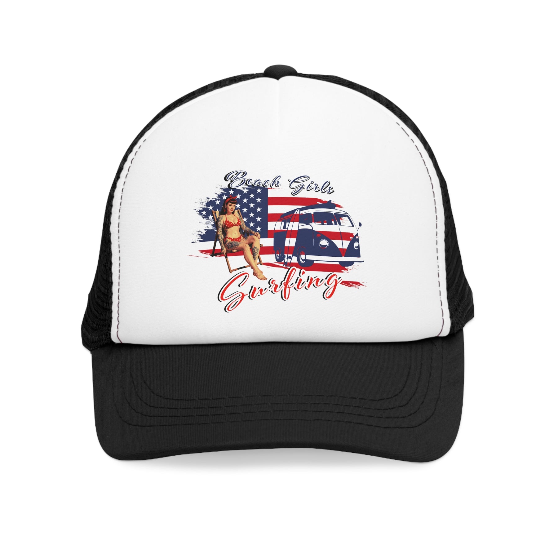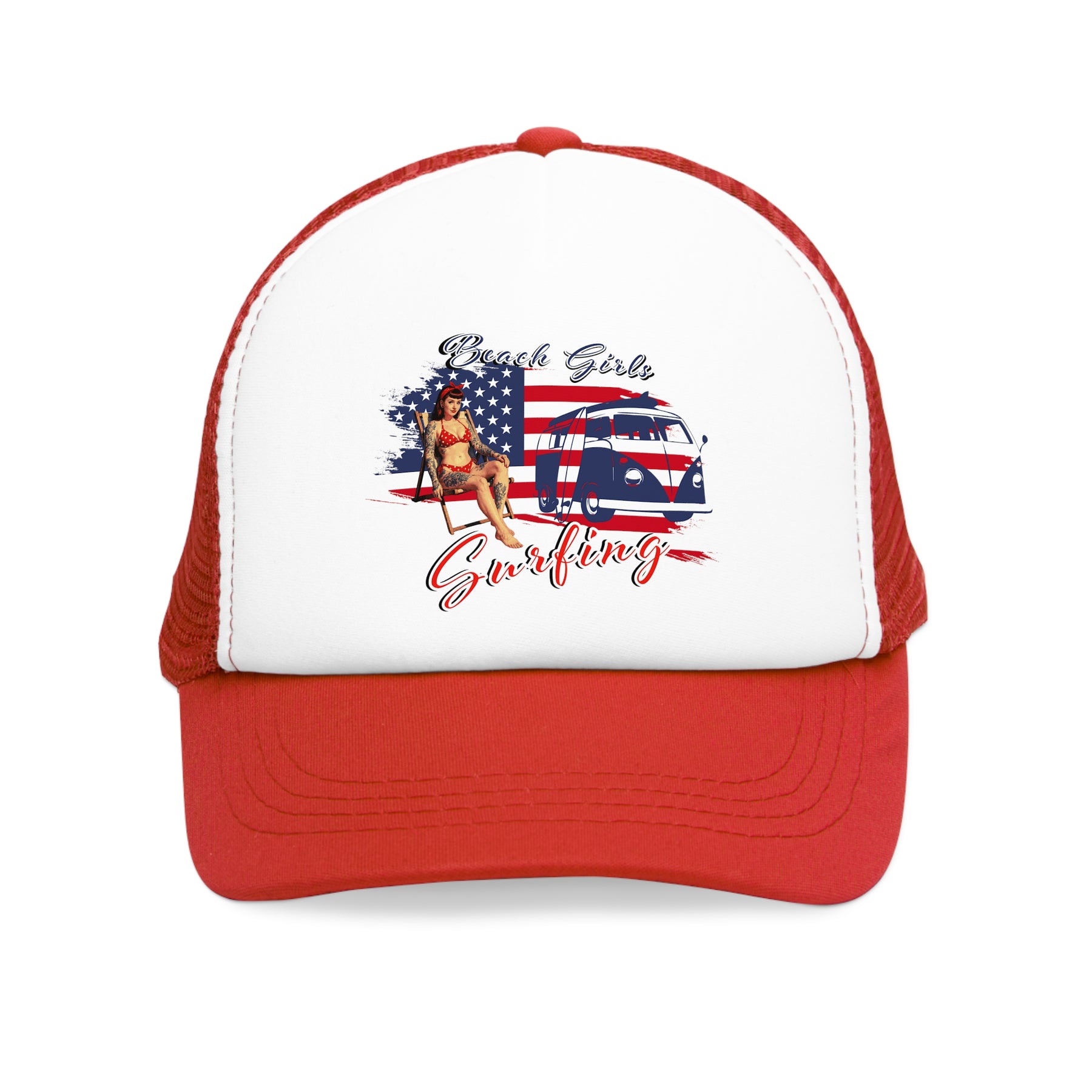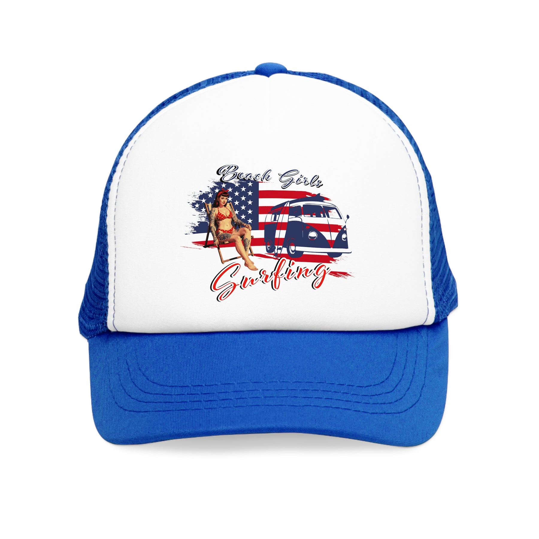 Lässiger Look mit Retro-Vibes! Diese stylische Mesh Cap bringt Rockabilly-Charme und Surfer-Feeling direkt auf deinen Kopf. Mit dem coolen Design aus tätowiertem Pin-up Girl, Surf-Van und US-Flagge ist sie das perfekte Accessoire für heiße Sommertage, Roadtrips oder Festivals.