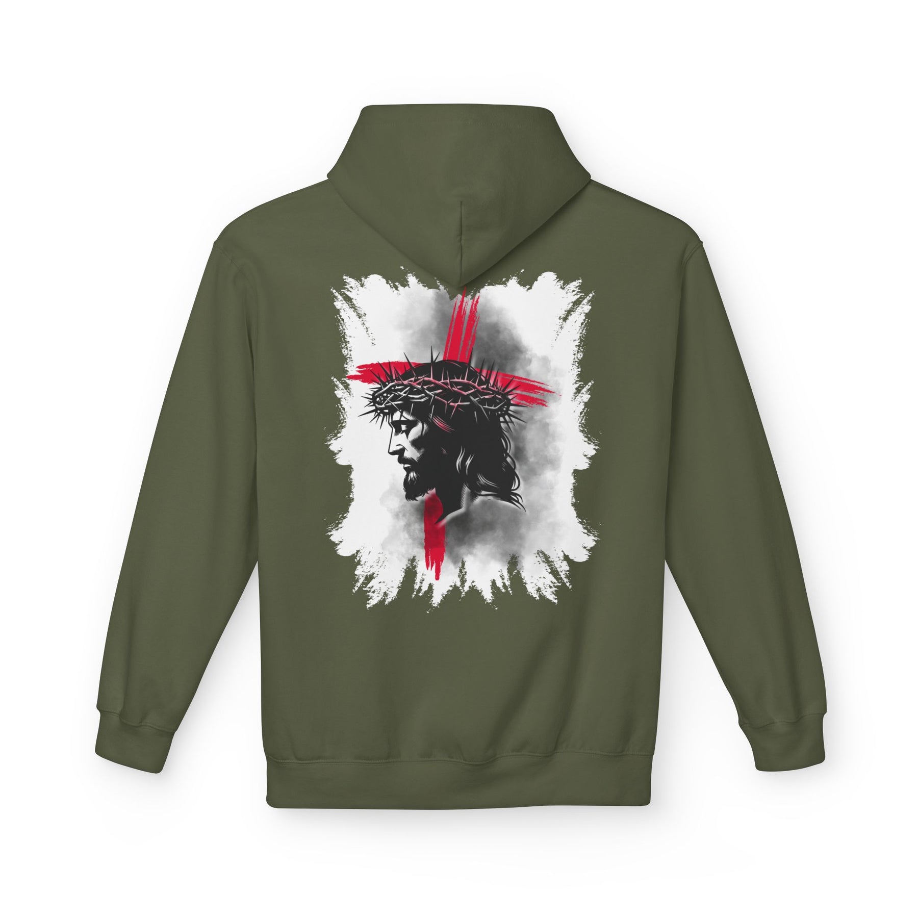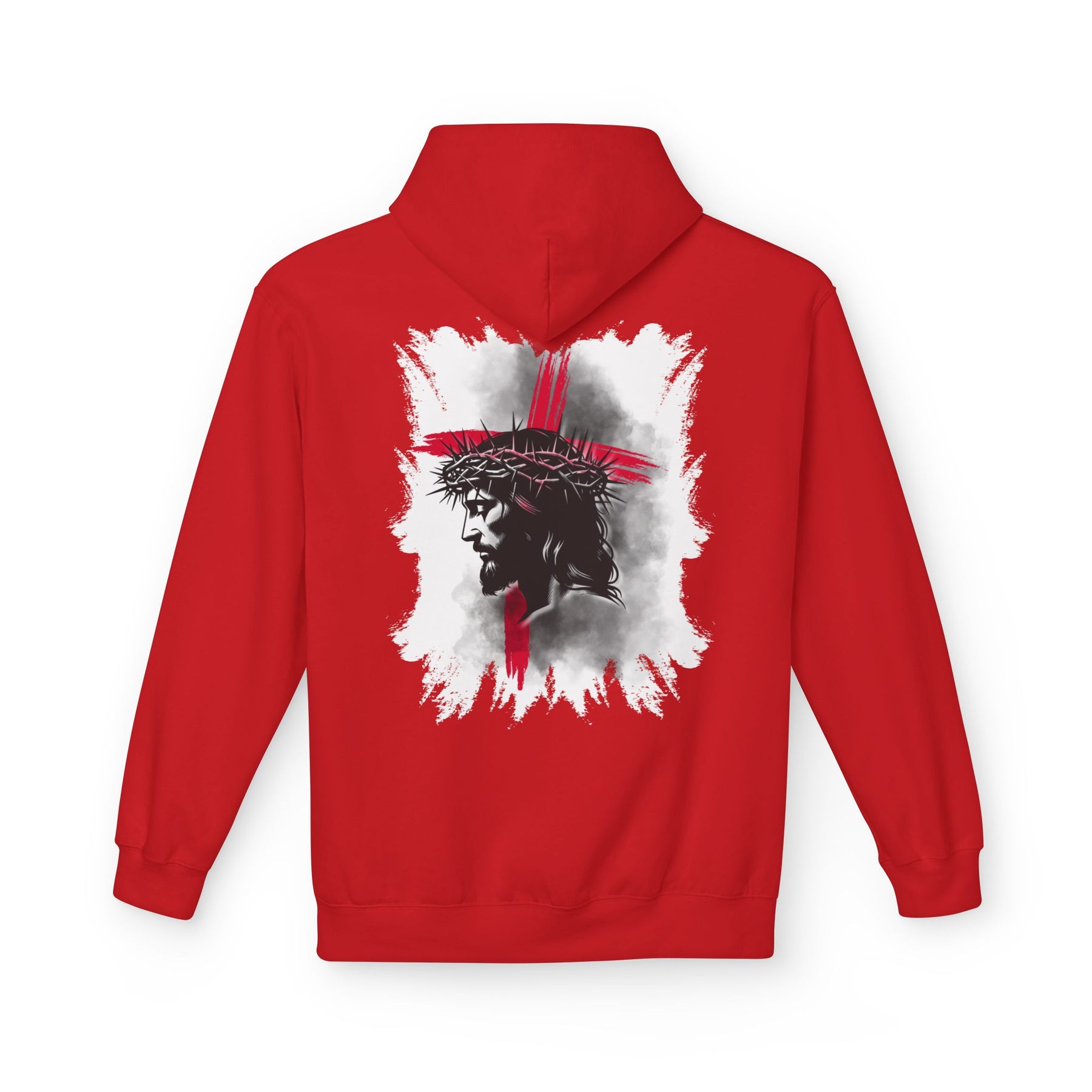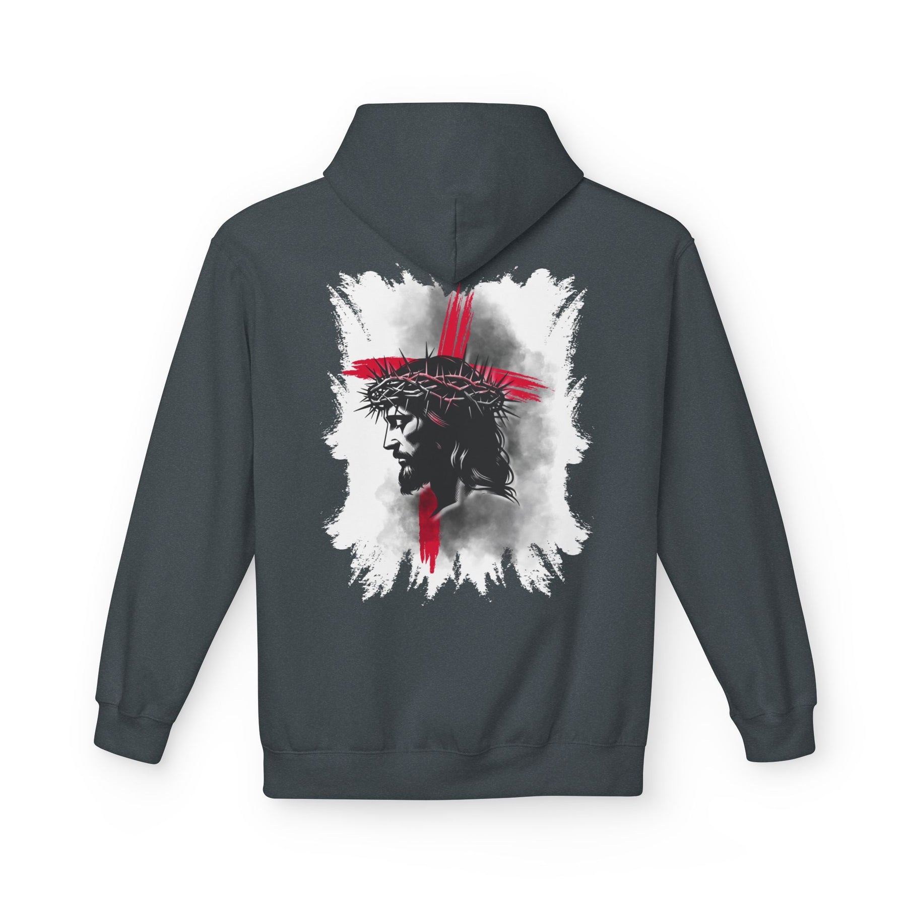 This hoodie combines faith with a modern streetwear style. On the front, a red cross with the statement “Blessed. Saved. Loved.” – on the back, the powerful image of Jesus with the crown of thorns in front of a cross.