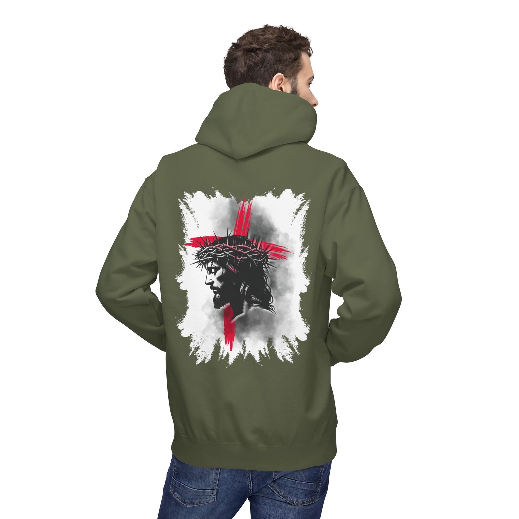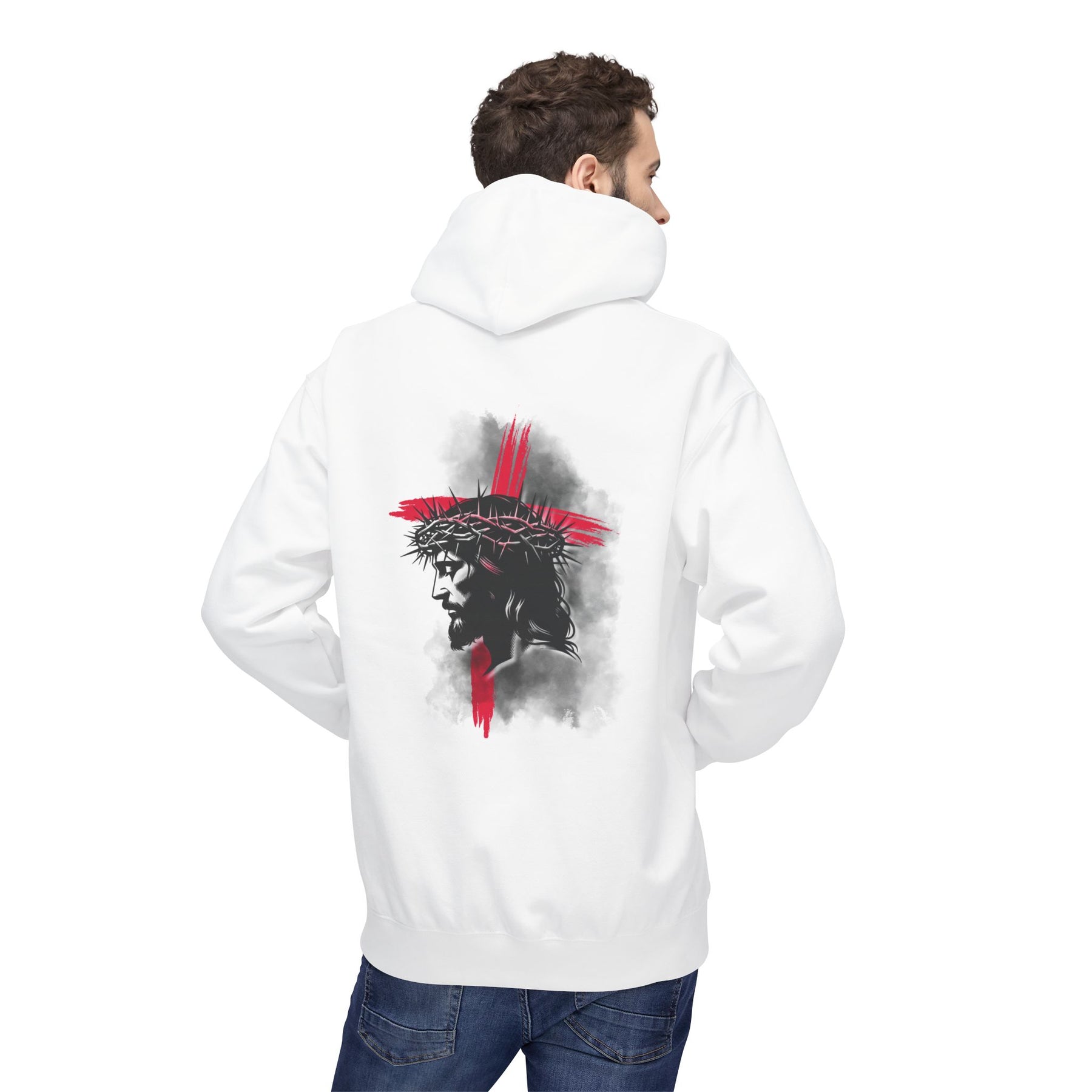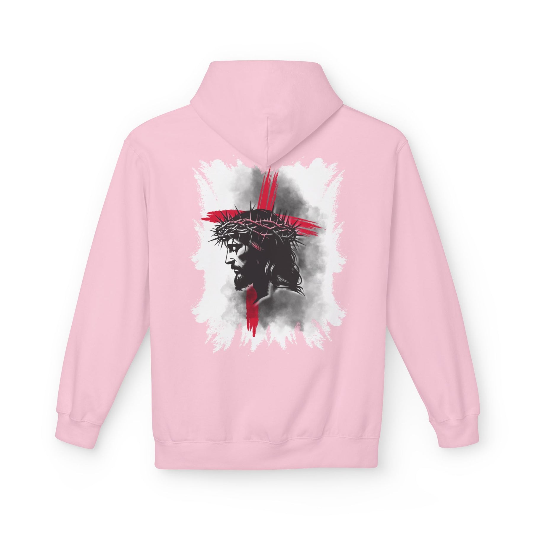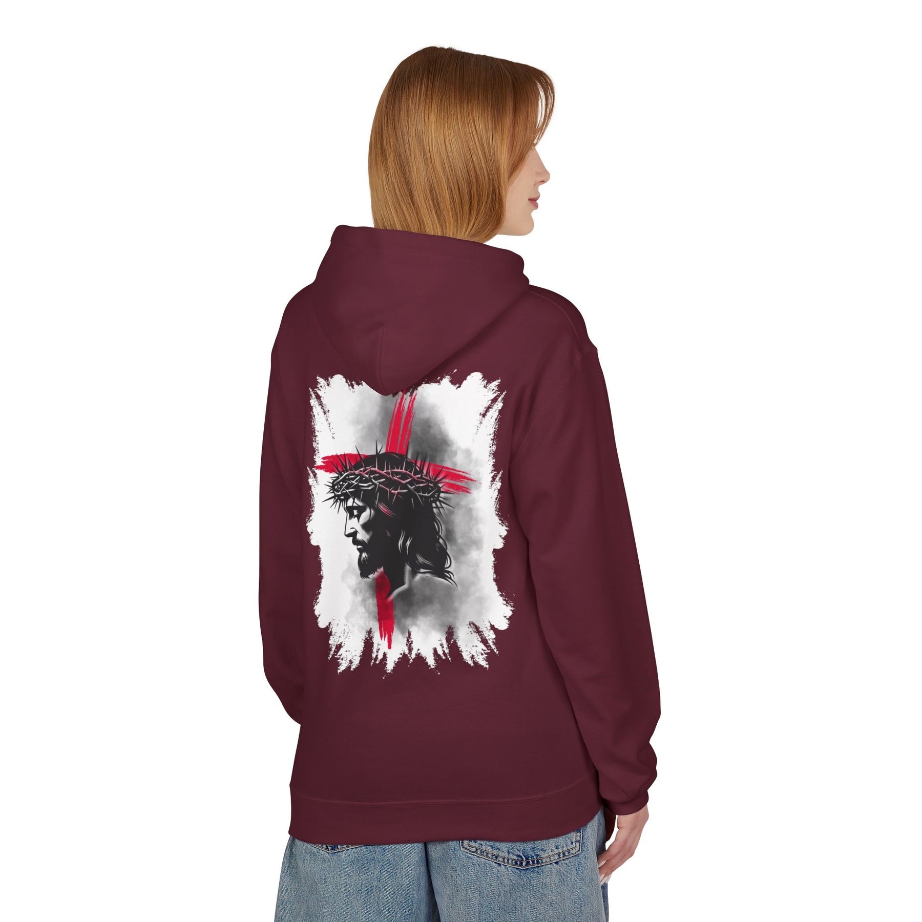 This hoodie combines faith with a modern streetwear style. On the front, a red cross with the statement “Blessed. Saved. Loved.” – on the back, the powerful image of Jesus with the crown of thorns in front of a cross.