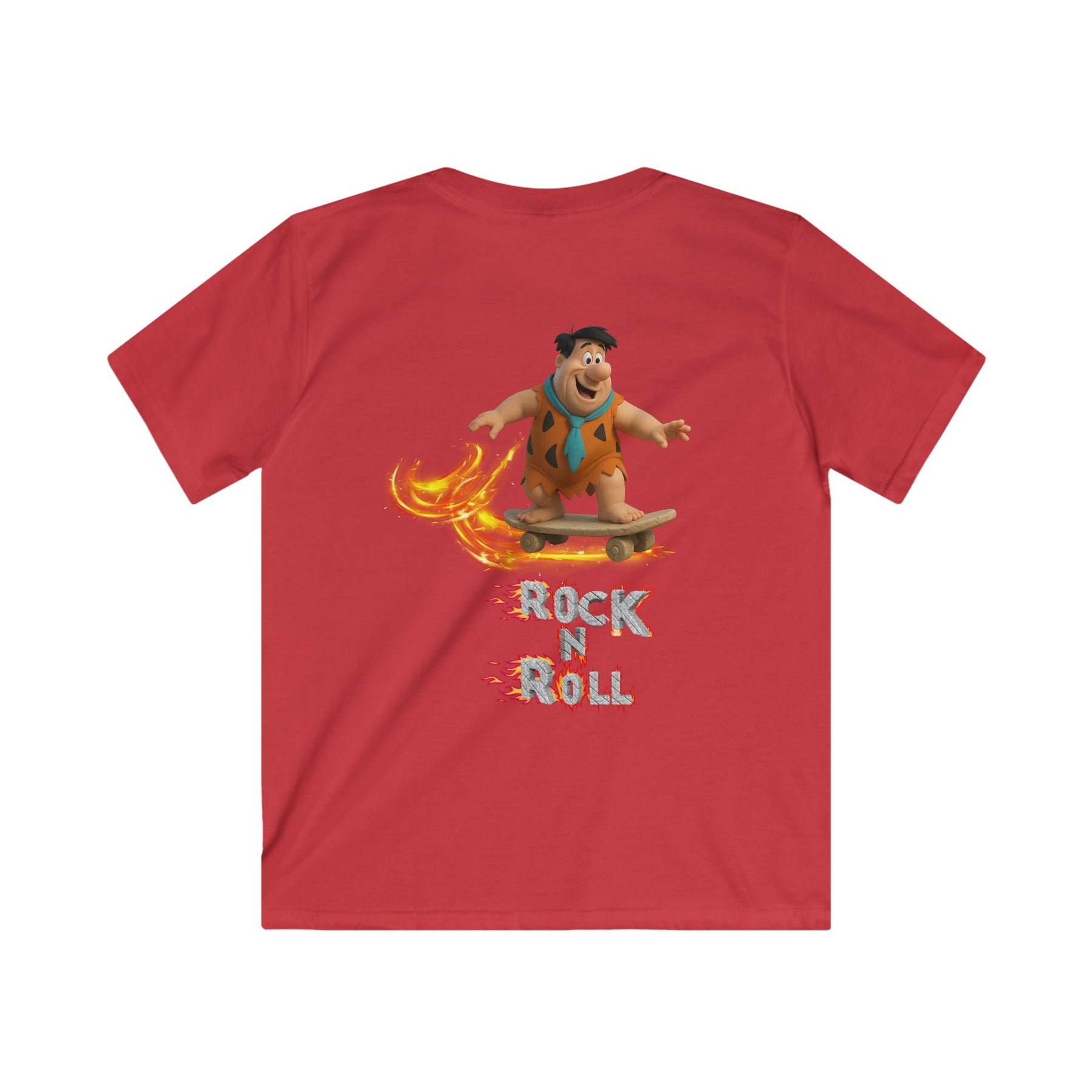 Fred Flintstone in action – barefoot on a wooden skateboard with a blazing fire trail, paired with the bold “Rock ’n’ Roll” text in stone texture with flames. 100% Stone Age power, 100% fun.