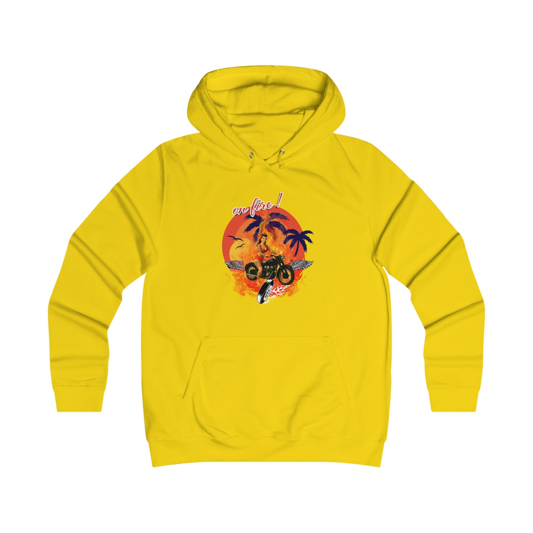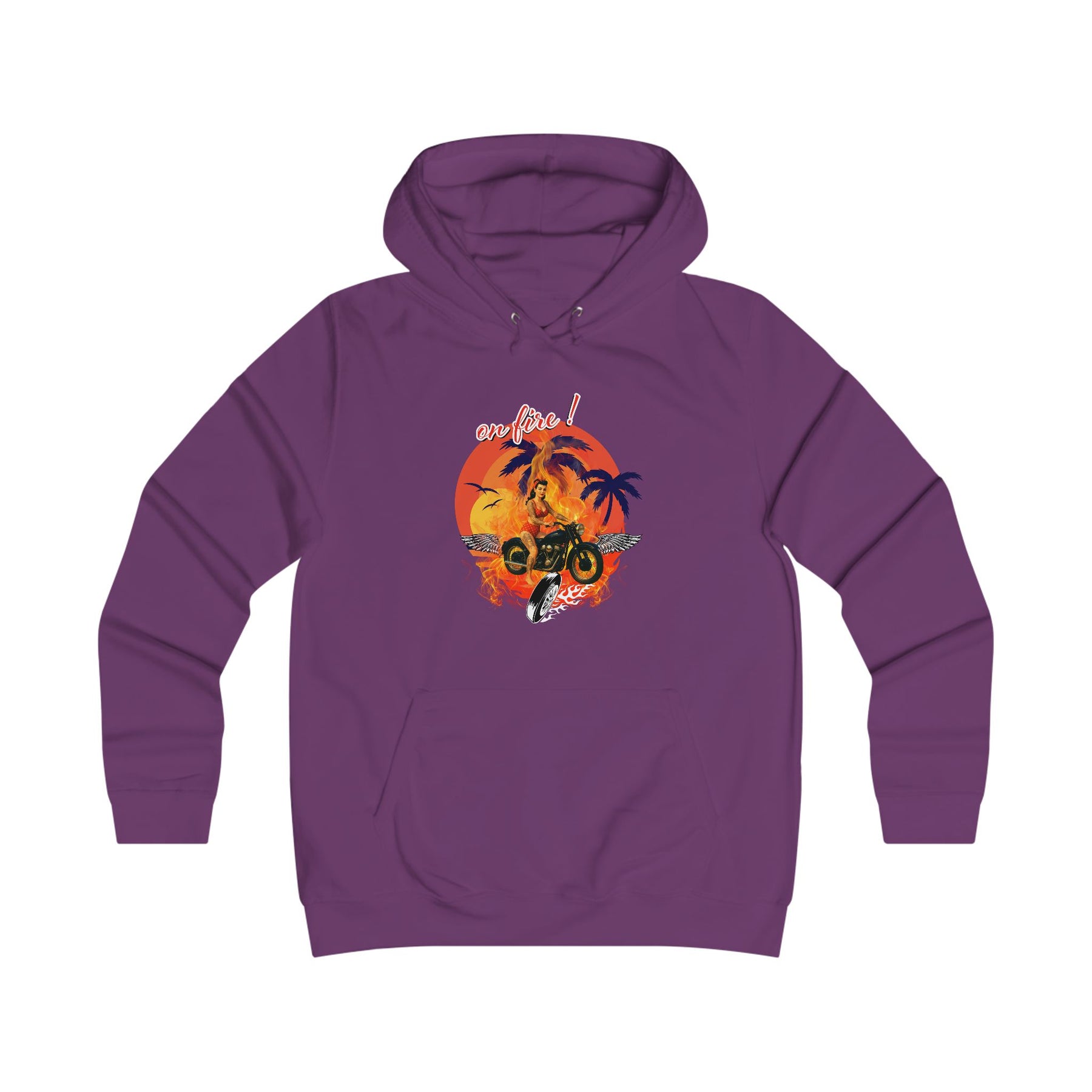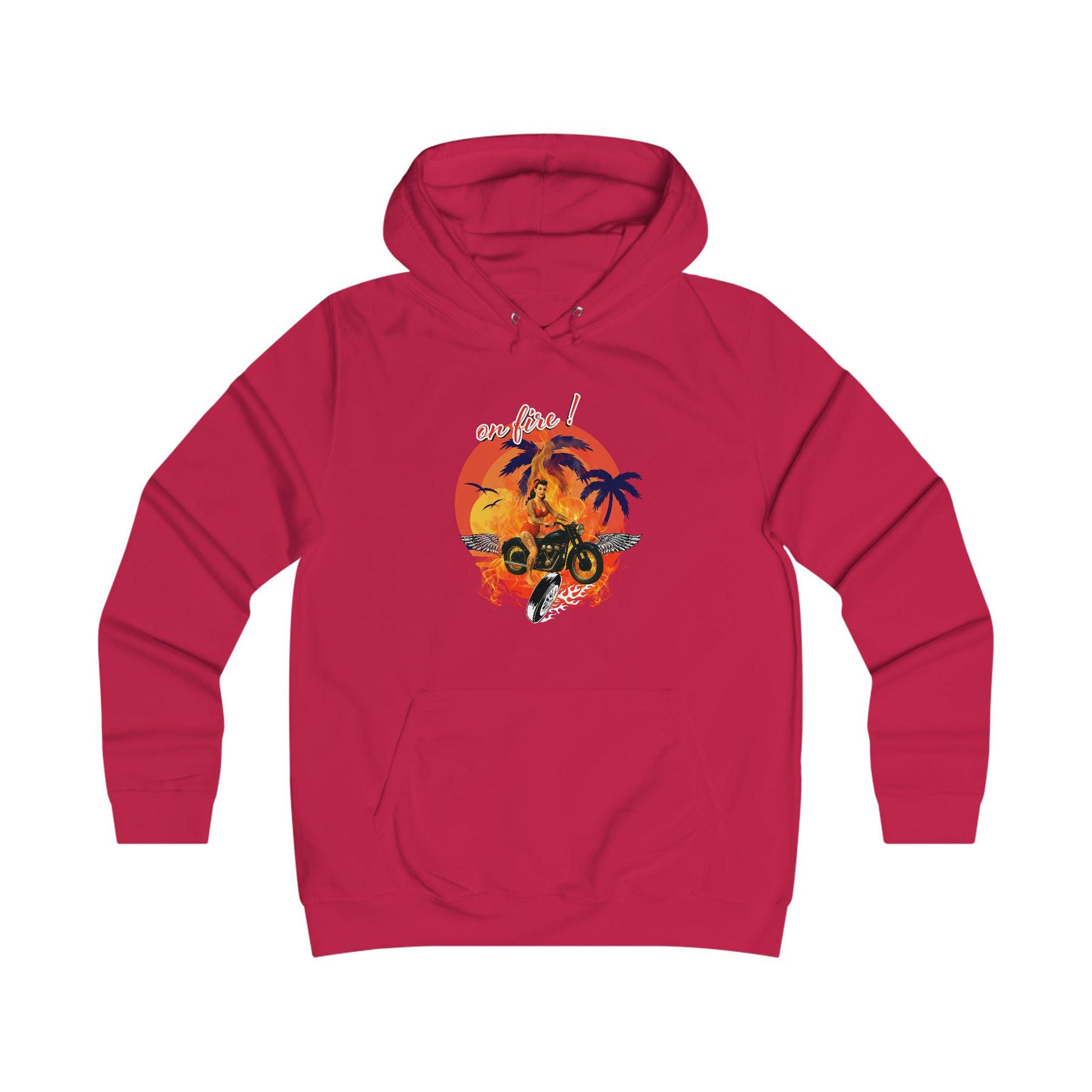 Diese Lady brennt – und zwar für Freiheit, Style und Speed! Mit einem feurigen Hintergrund, flammenden Reifen, Flügeln an der Maschine und einer coolen tätowierten Rockabella auf dem Bike ist dieses Design ein absolutes Statement. Sommer, Palmen, Power – alles in einem Motiv.