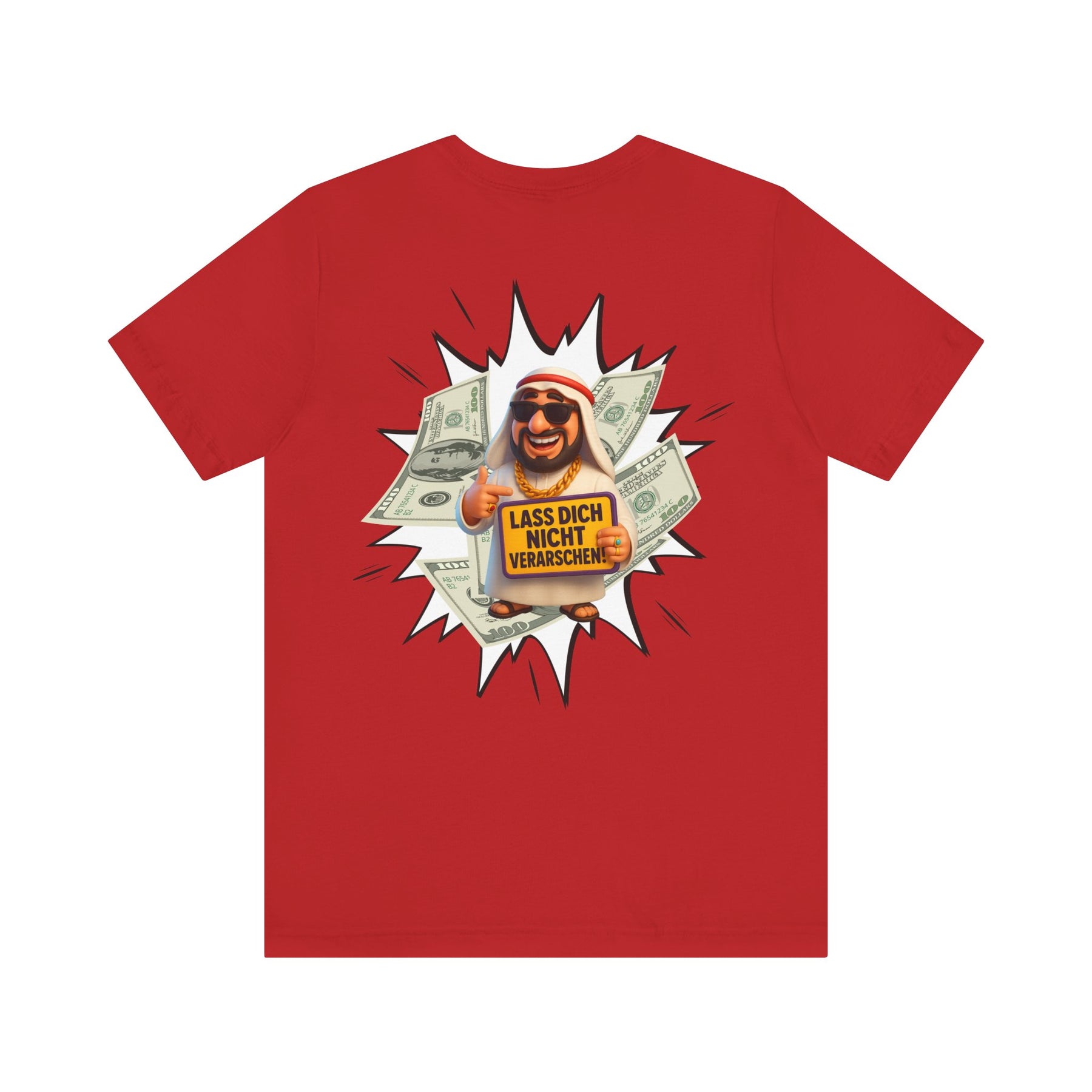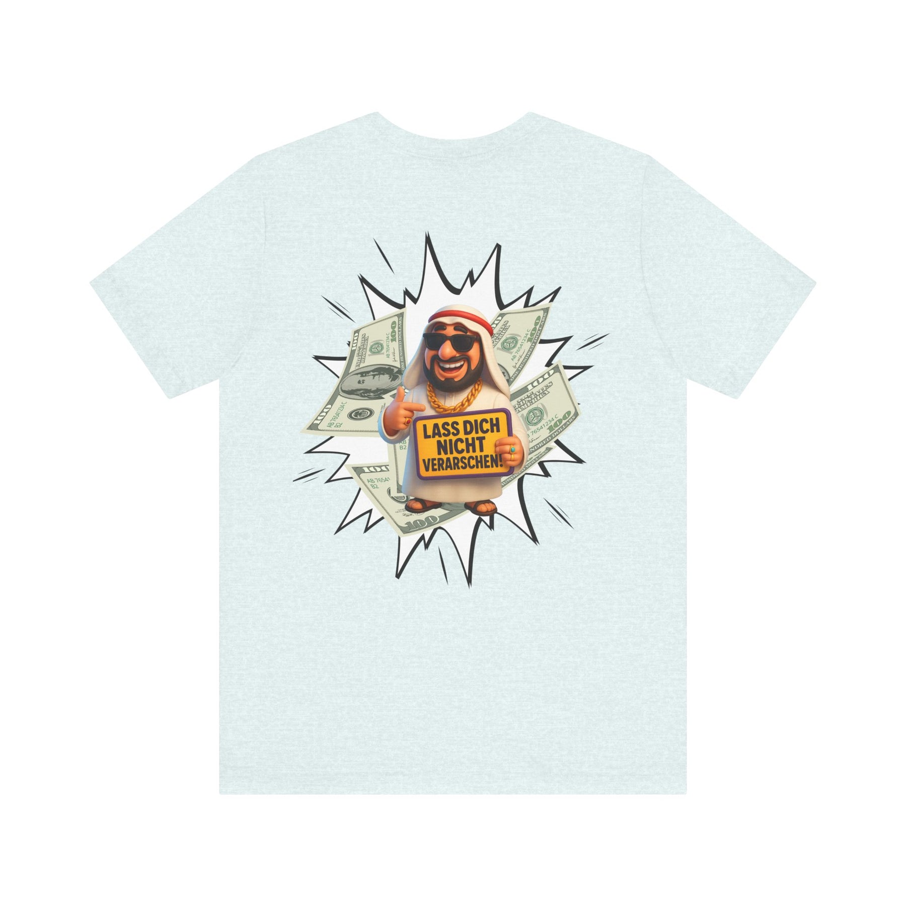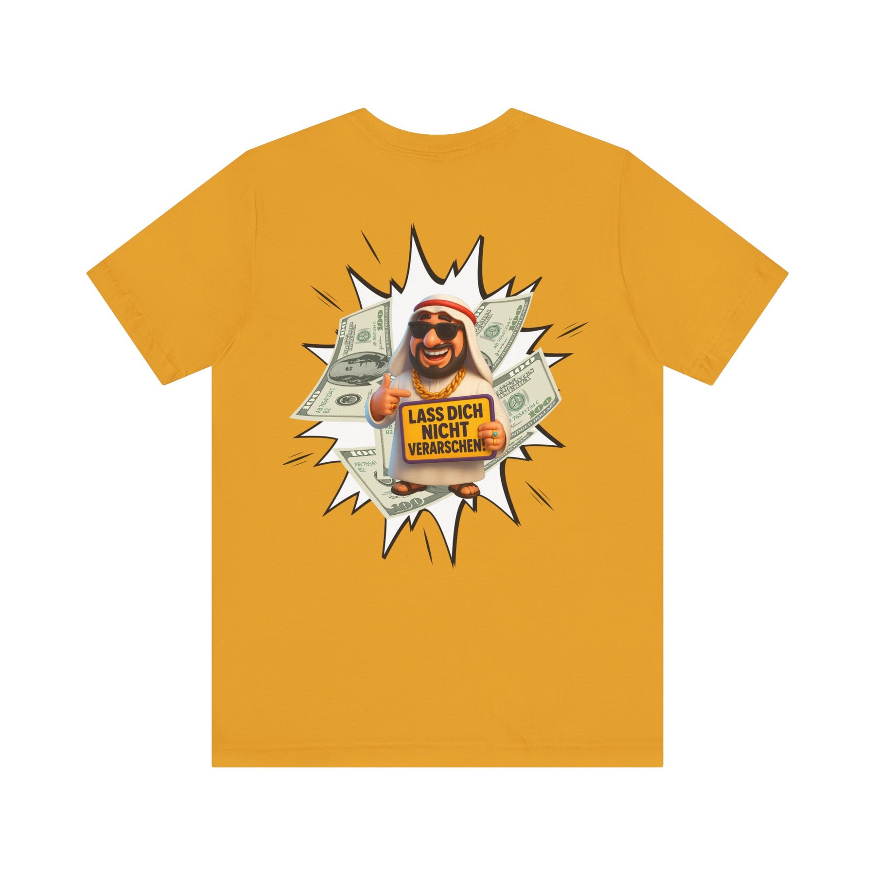 This shirt is more than just streetwear – it’s a statement! The front combines Bitcoin with Dubai vibes, while the back delivers the bold reminder “Don’t get fooled” in a money-splash cartoon style.