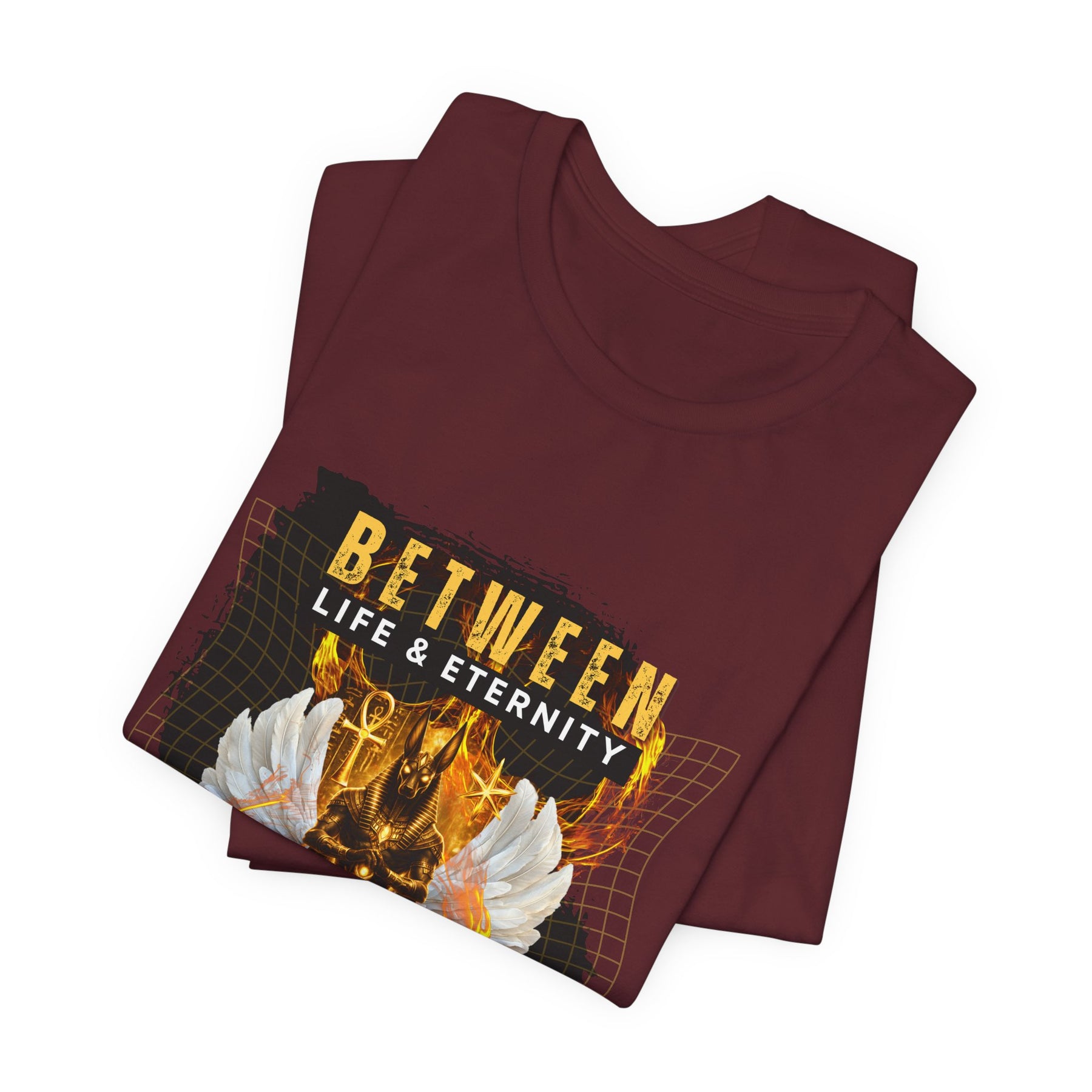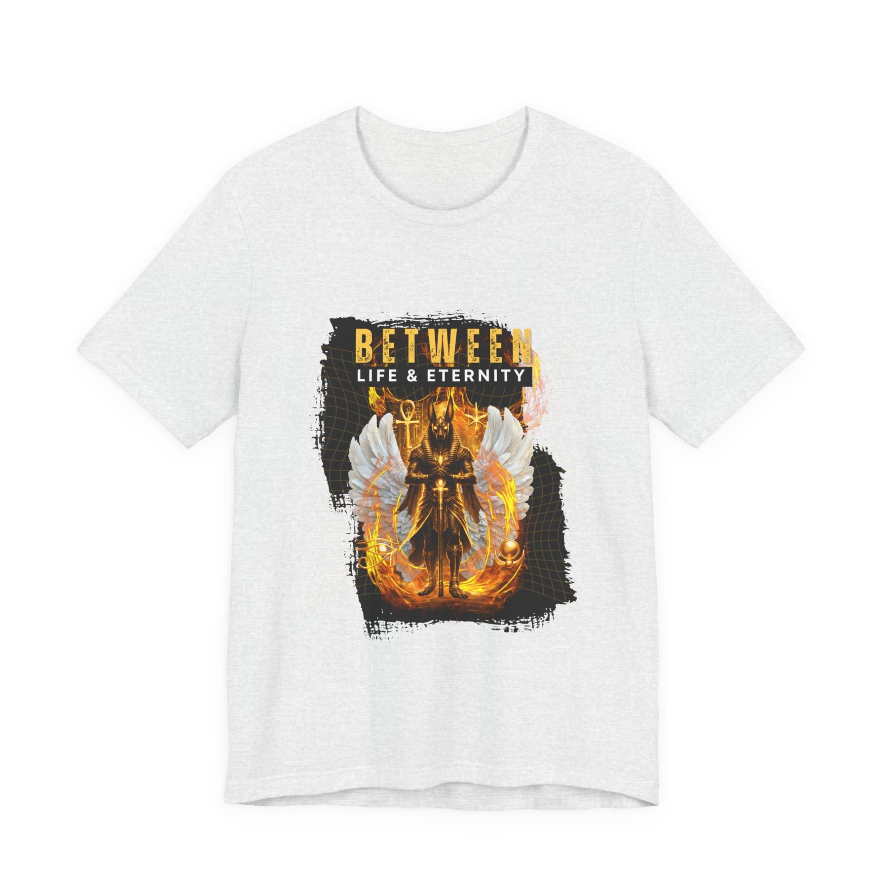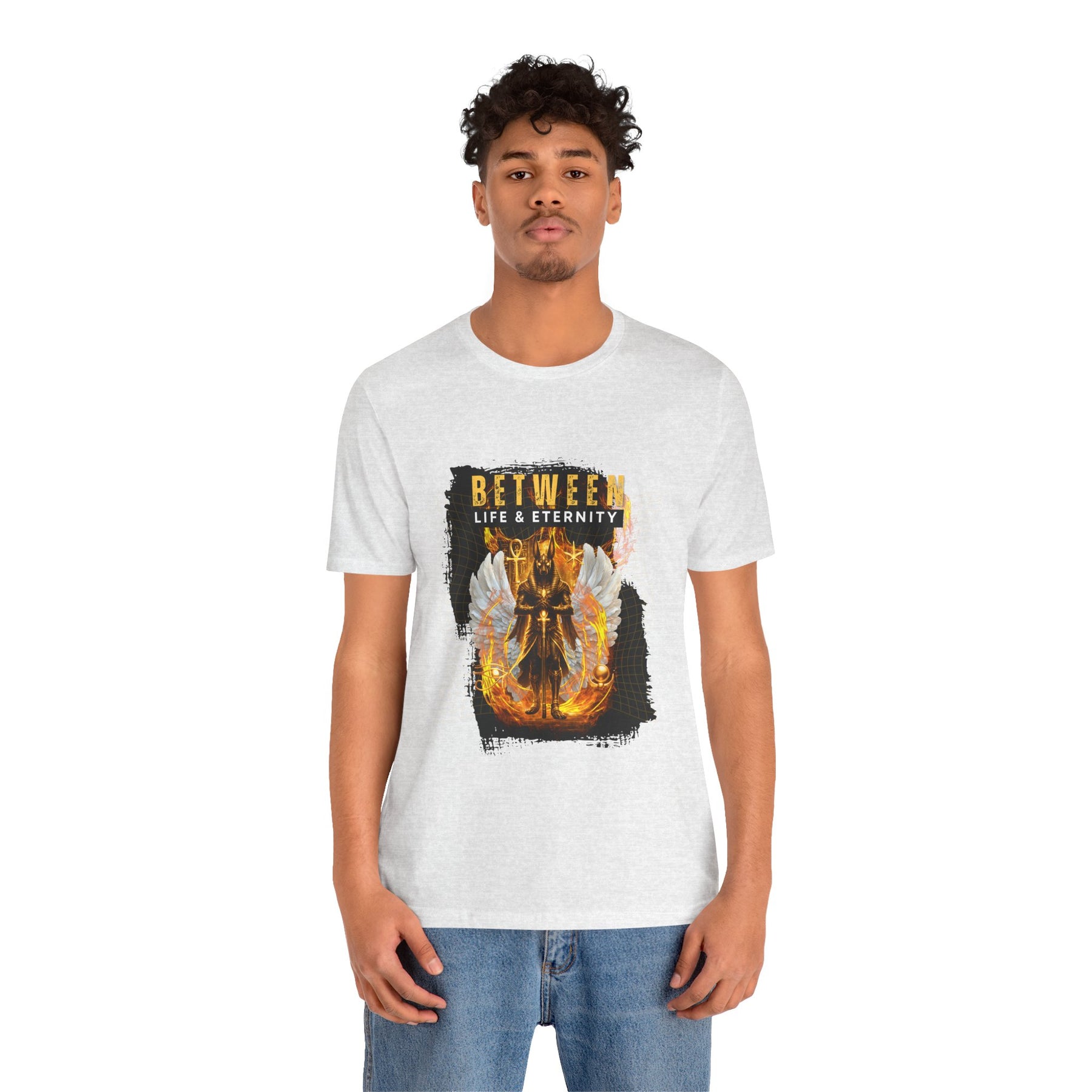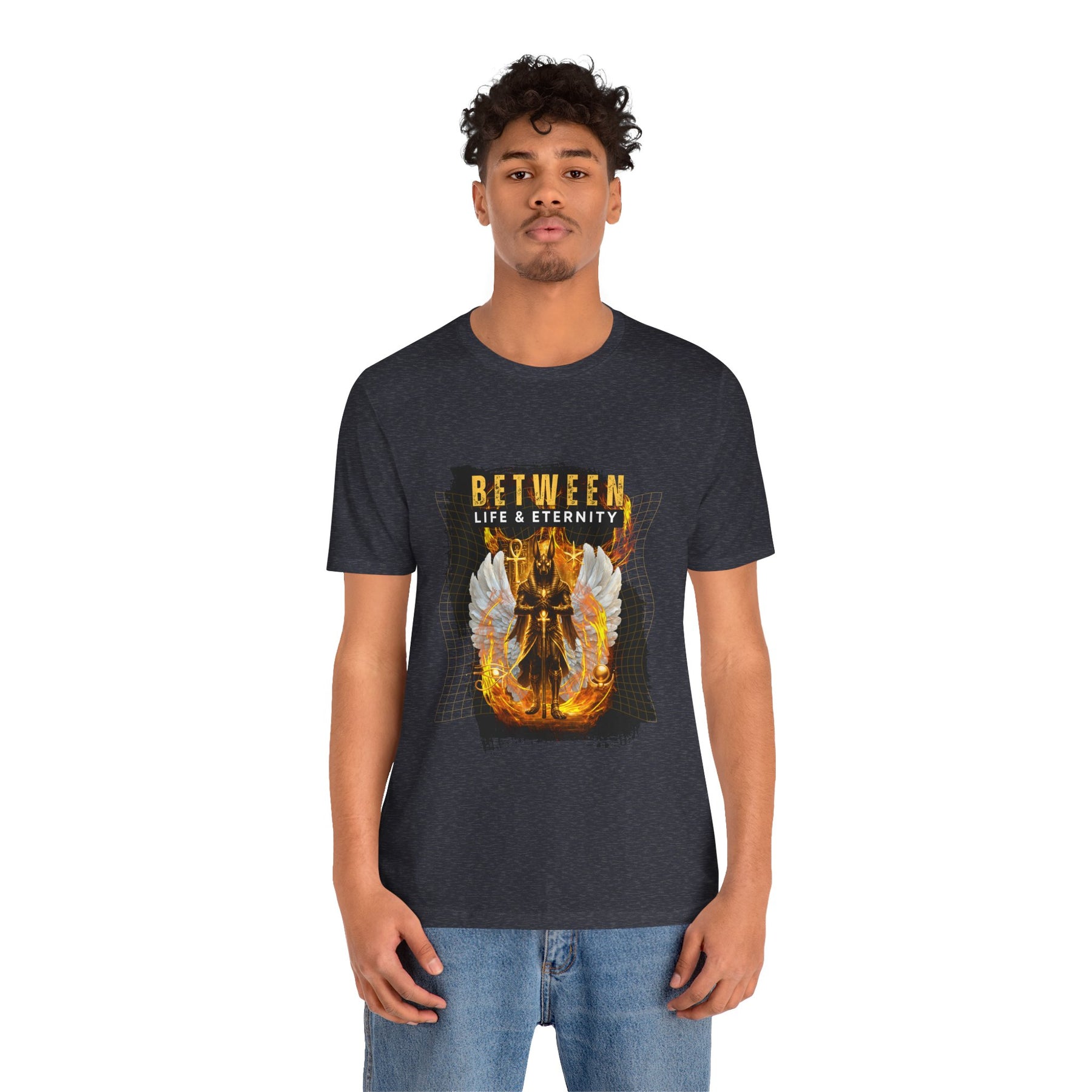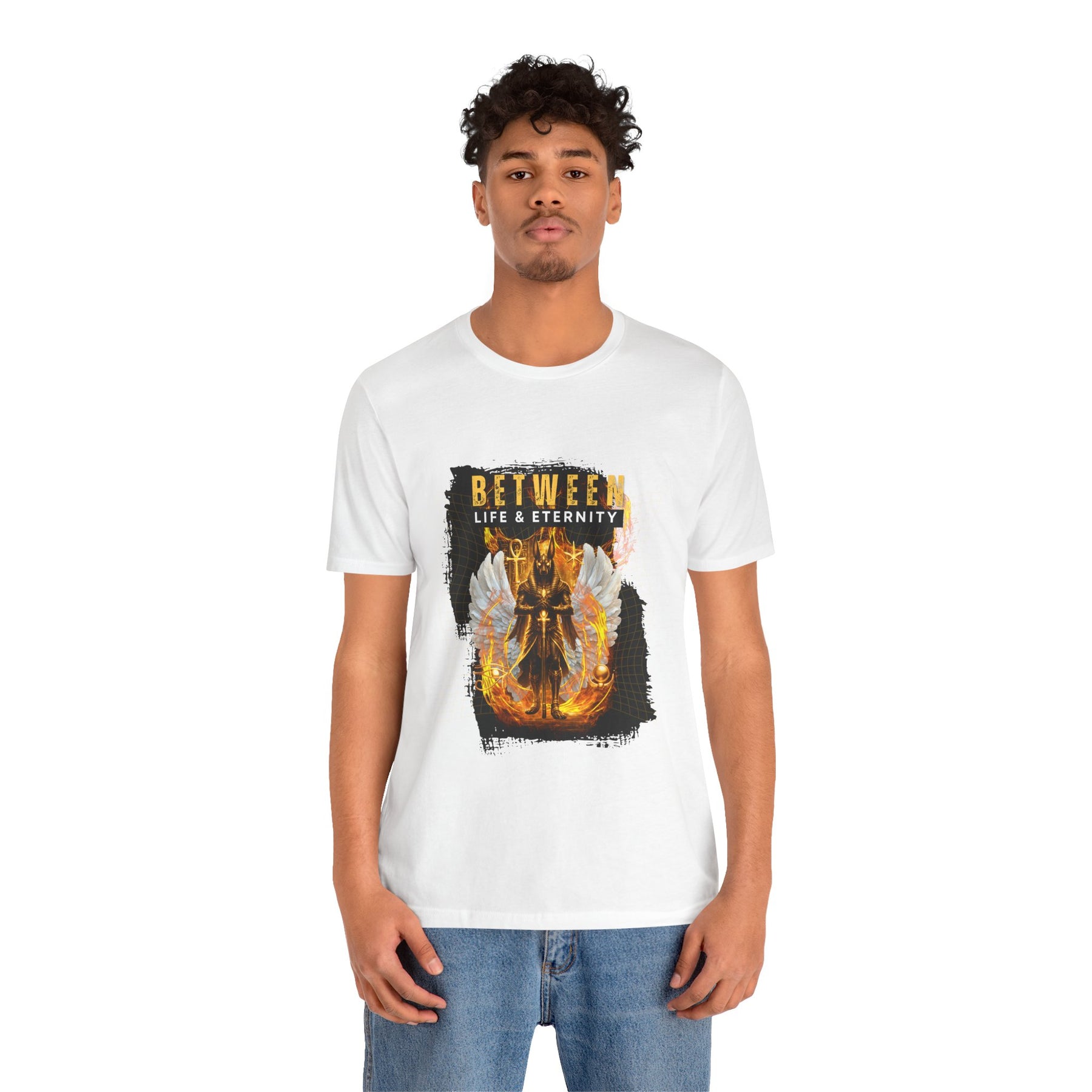 This semi-fitted cotton tee carries a bold, mythic design that reads “BETWEEN LIFE & ETERNITY” over a radiant, winged figure framed in smoldering golds and black brushstrokes. It feels like armor and story in equal measure — lightweight enough for everyday wear, substantial enough to hold its shape after repeated washes. Wear it when you want to tap into a dramatic, contemplative mood: layered under a leather jacket for night shows, paired with worn jeans for city wandering, or lounging at home while reading speculative fiction. The artwork invites quiet attention and conversation, a wearable piece that speaks to fans of epic symbolism and modern street art alike.