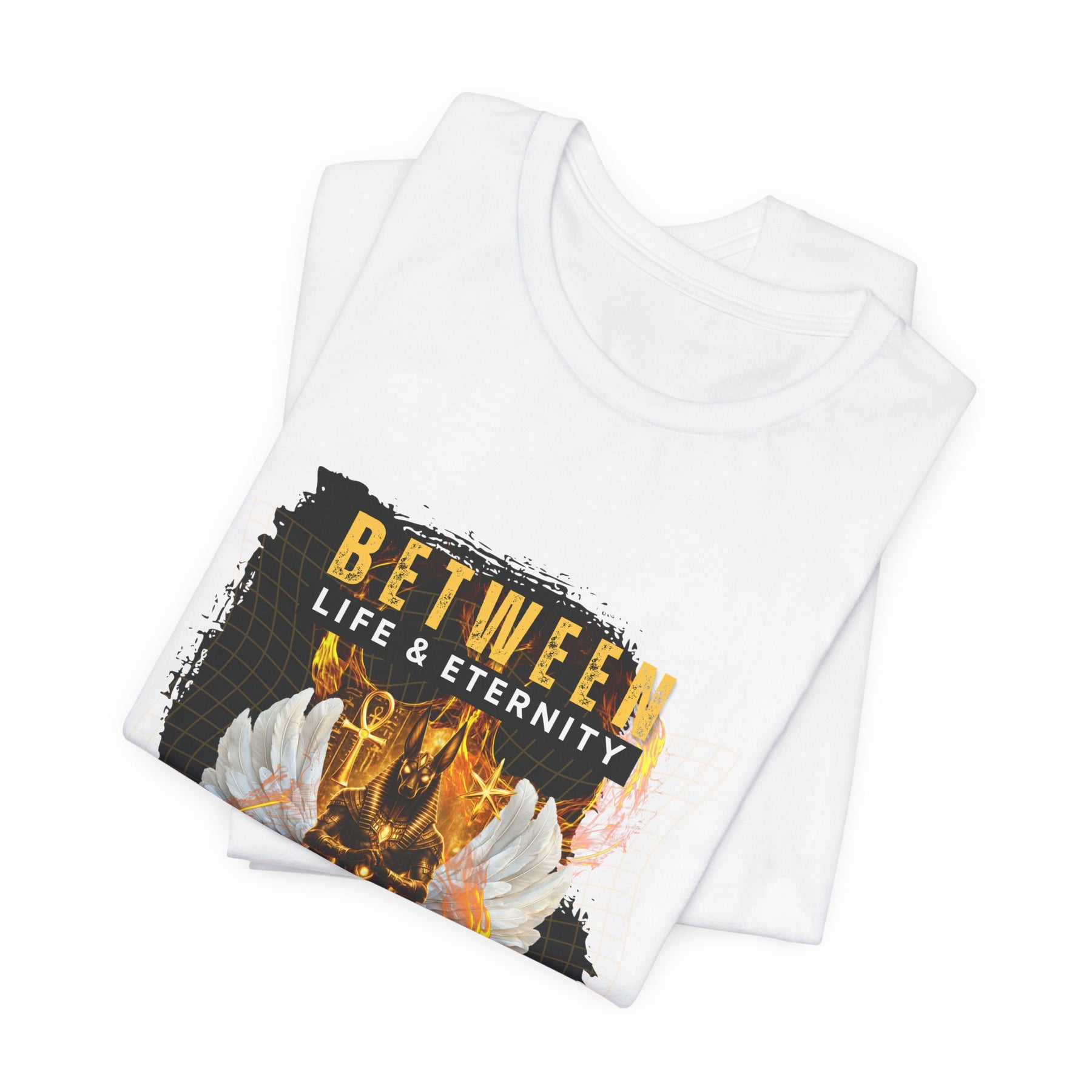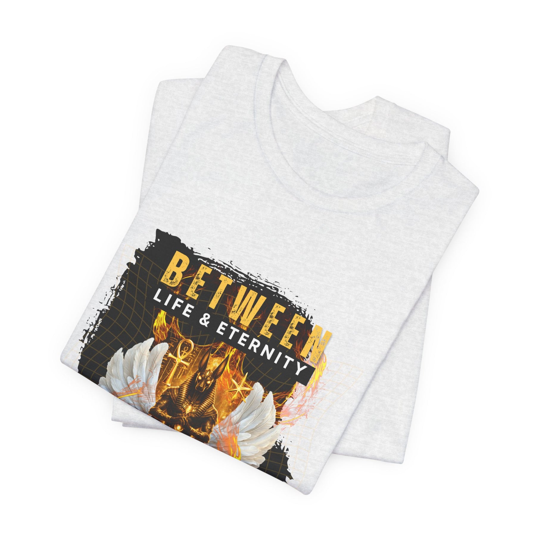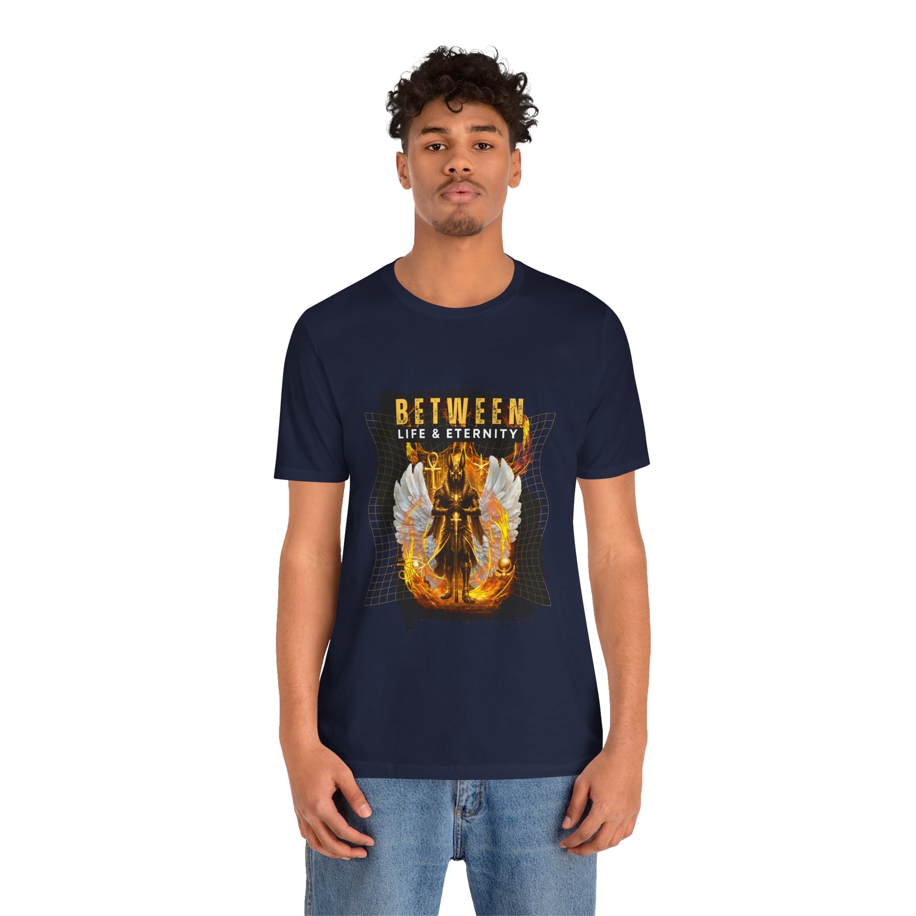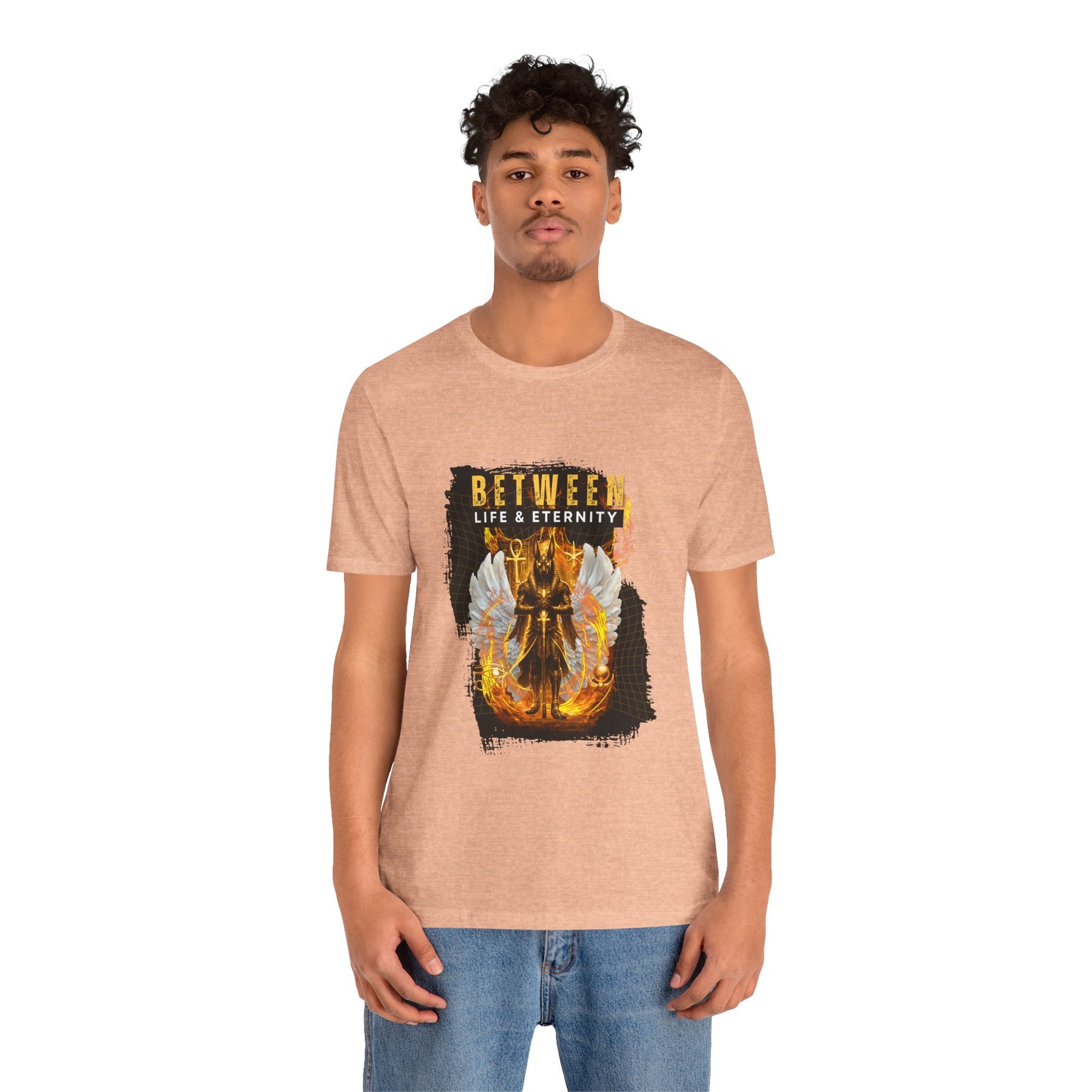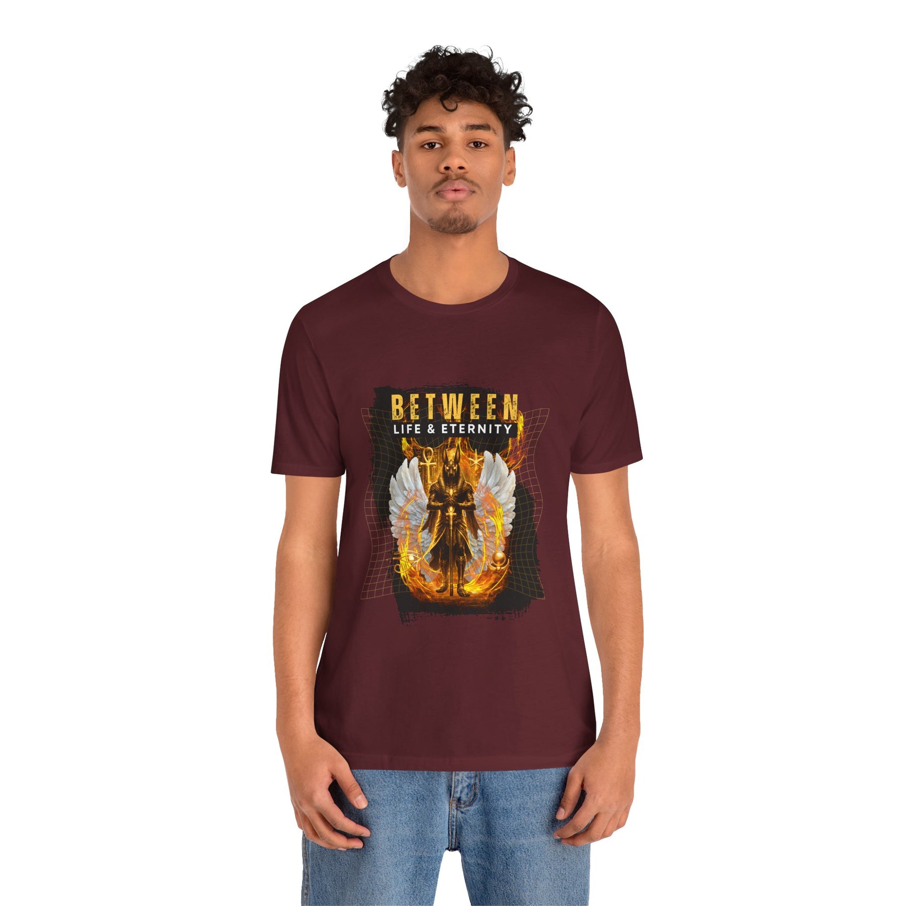 This semi-fitted cotton tee carries a bold, mythic design that reads “BETWEEN LIFE & ETERNITY” over a radiant, winged figure framed in smoldering golds and black brushstrokes. It feels like armor and story in equal measure — lightweight enough for everyday wear, substantial enough to hold its shape after repeated washes. Wear it when you want to tap into a dramatic, contemplative mood: layered under a leather jacket for night shows, paired with worn jeans for city wandering, or lounging at home while reading speculative fiction. The artwork invites quiet attention and conversation, a wearable piece that speaks to fans of epic symbolism and modern street art alike.