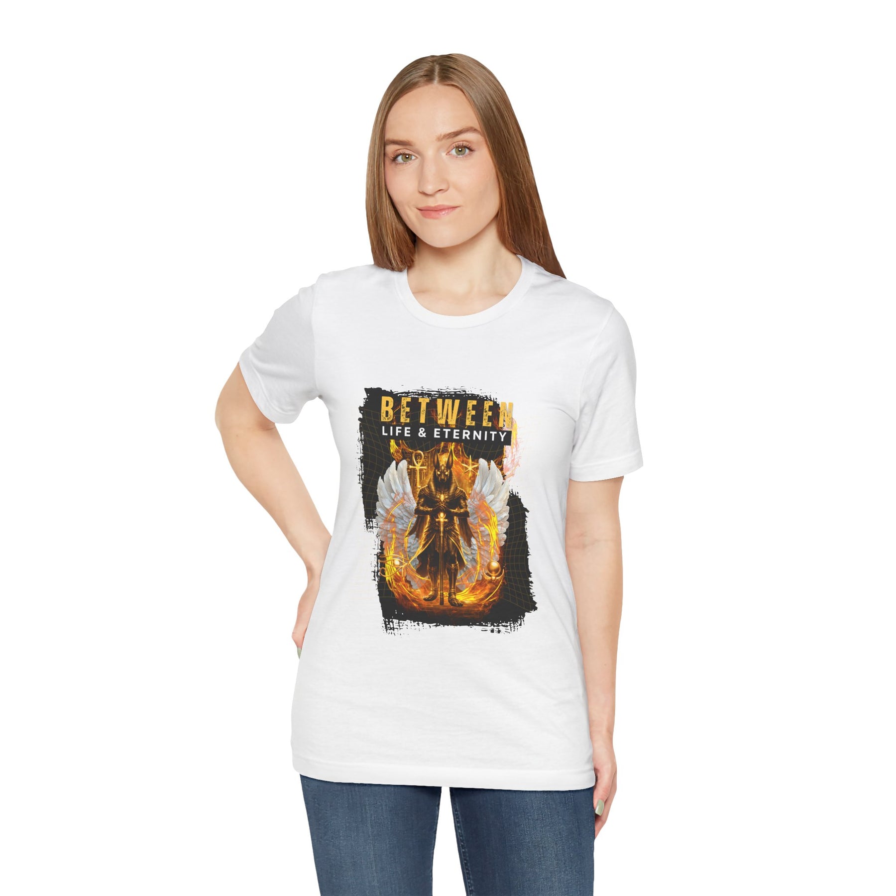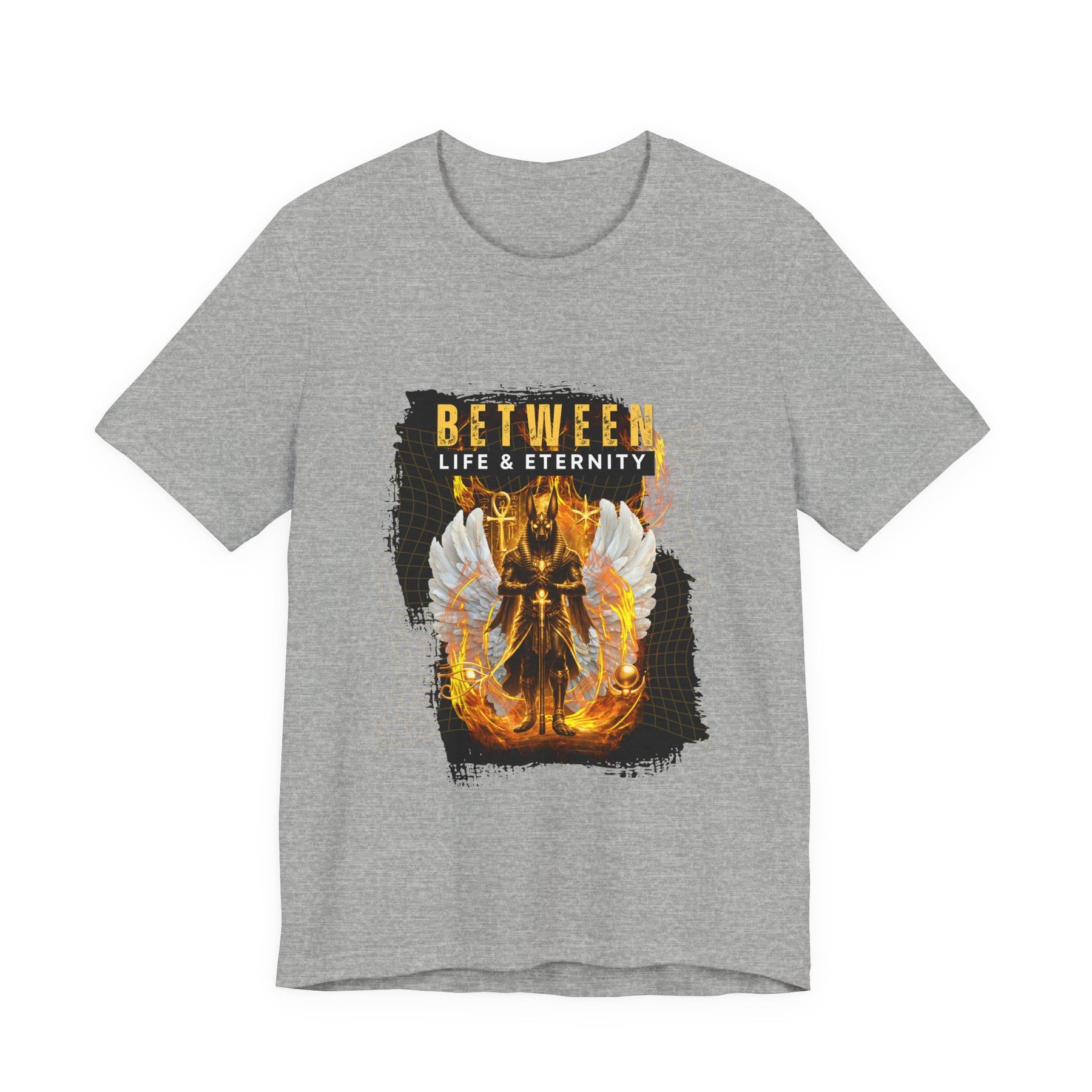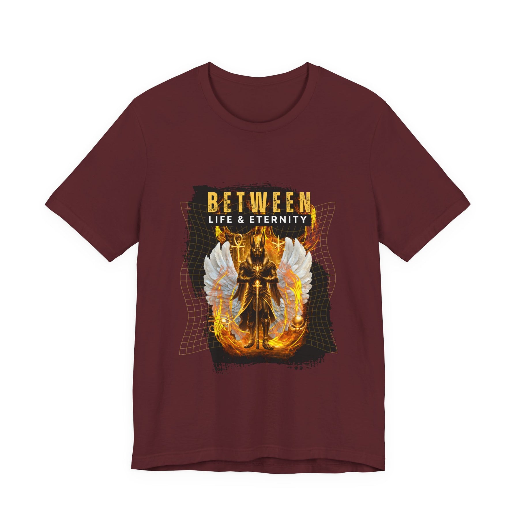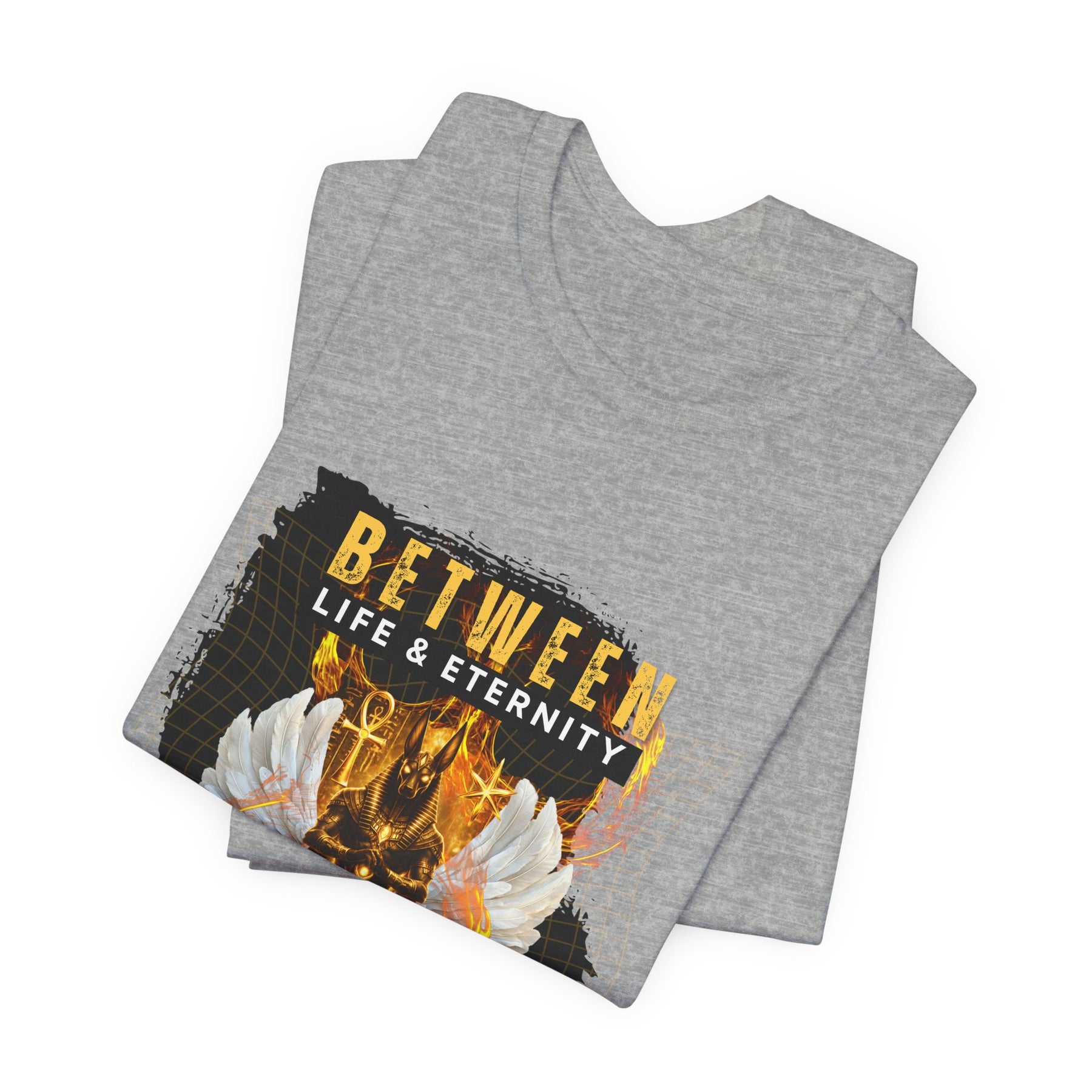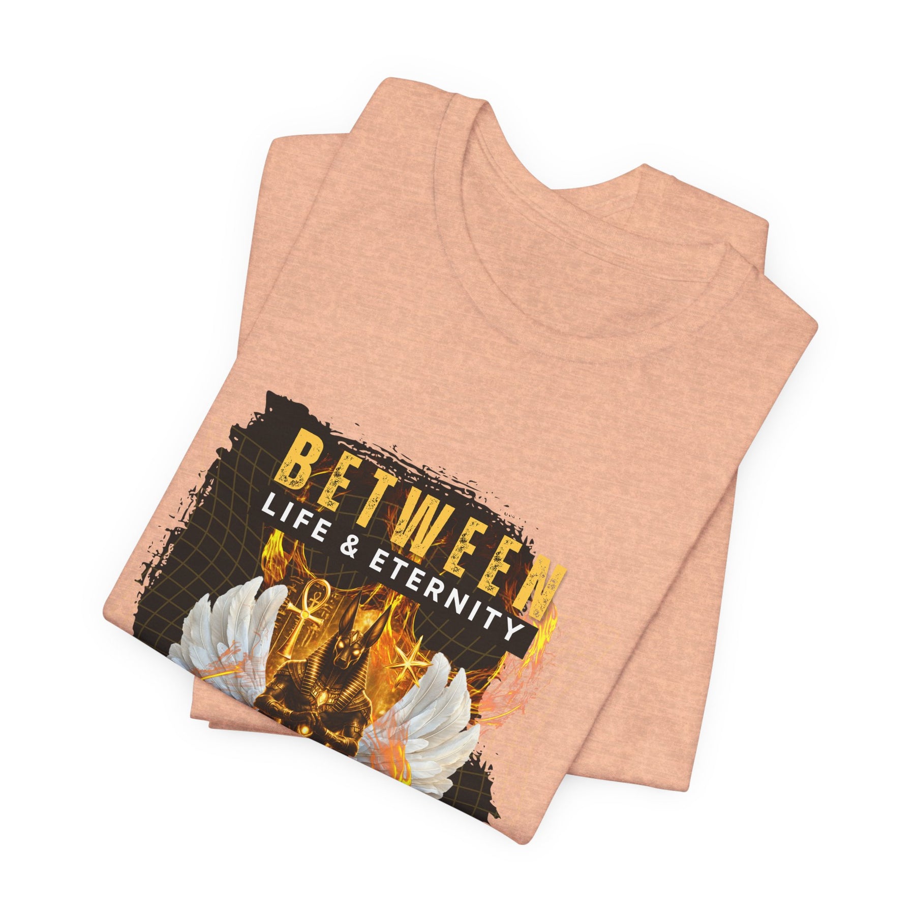 This semi-fitted cotton tee carries a bold, mythic design that reads “BETWEEN LIFE & ETERNITY” over a radiant, winged figure framed in smoldering golds and black brushstrokes. It feels like armor and story in equal measure — lightweight enough for everyday wear, substantial enough to hold its shape after repeated washes. Wear it when you want to tap into a dramatic, contemplative mood: layered under a leather jacket for night shows, paired with worn jeans for city wandering, or lounging at home while reading speculative fiction. The artwork invites quiet attention and conversation, a wearable piece that speaks to fans of epic symbolism and modern street art alike.