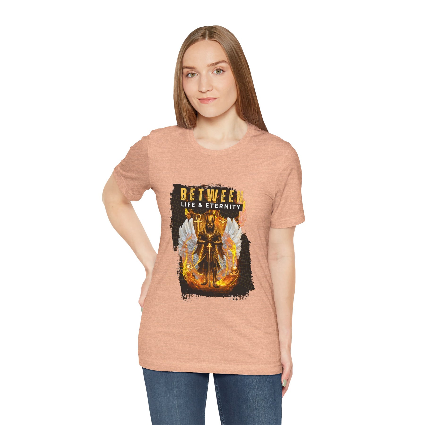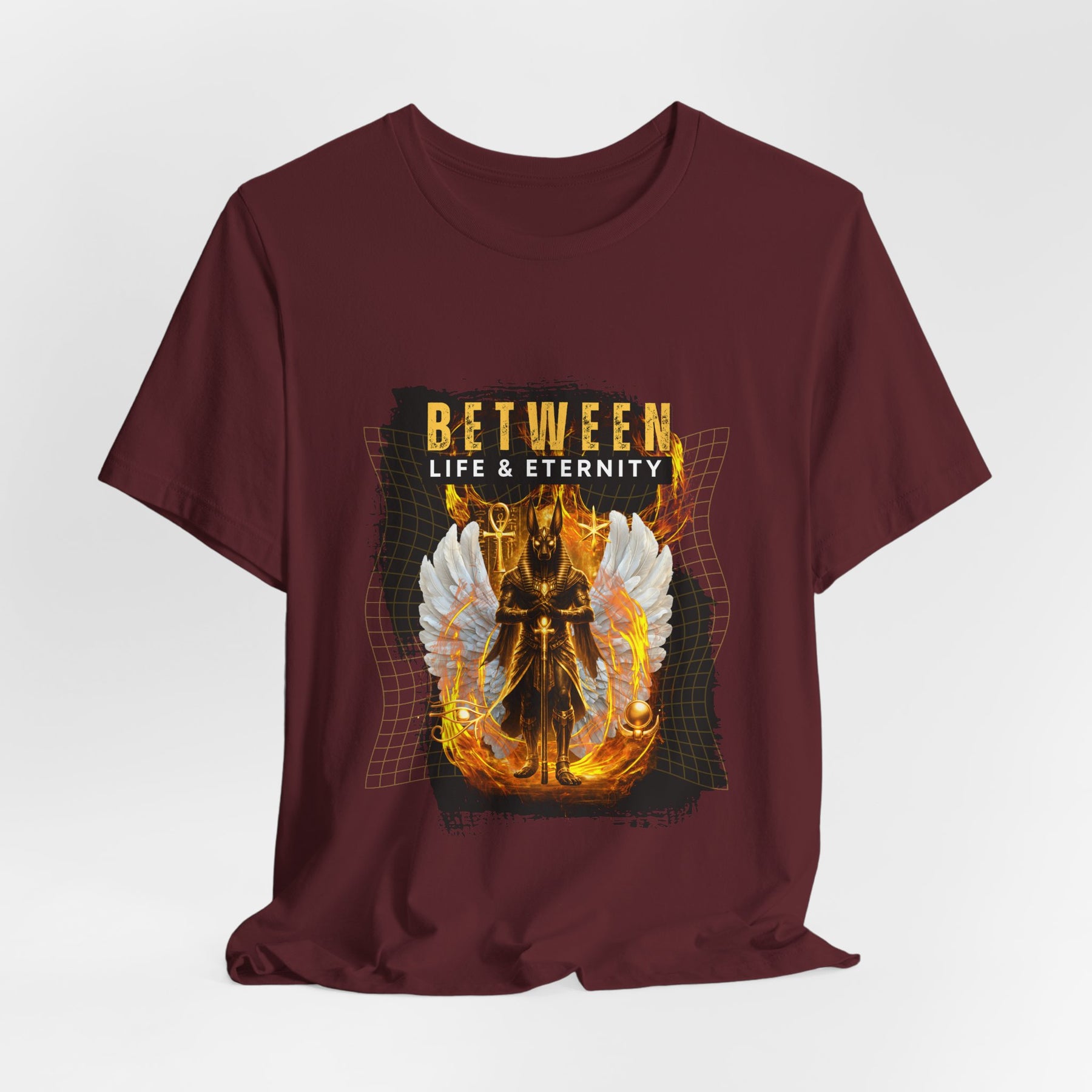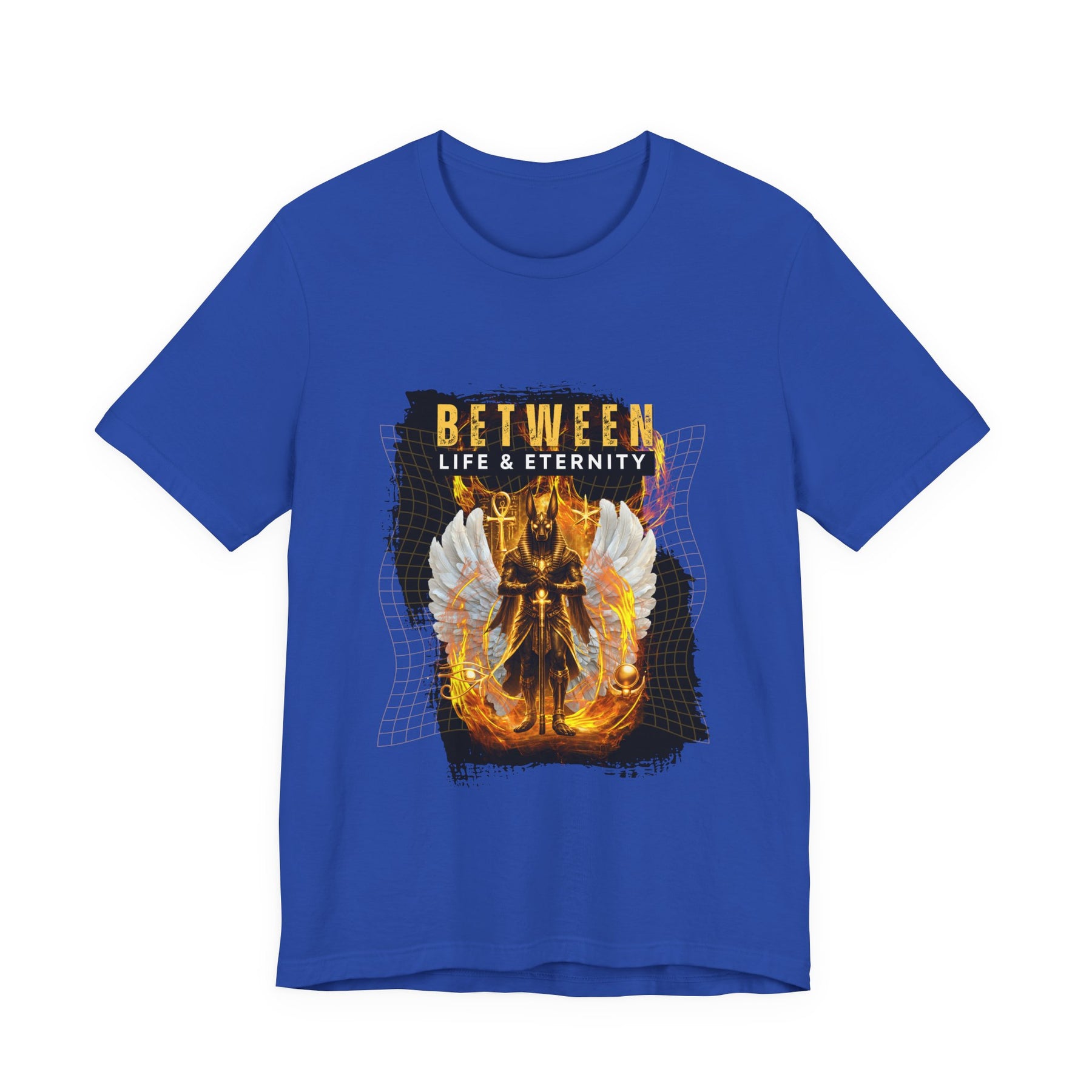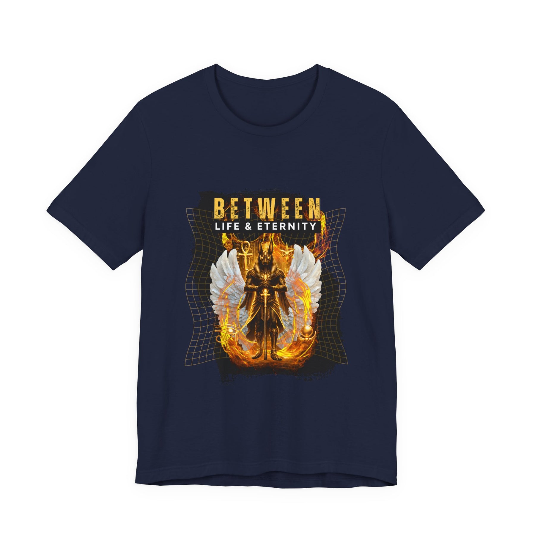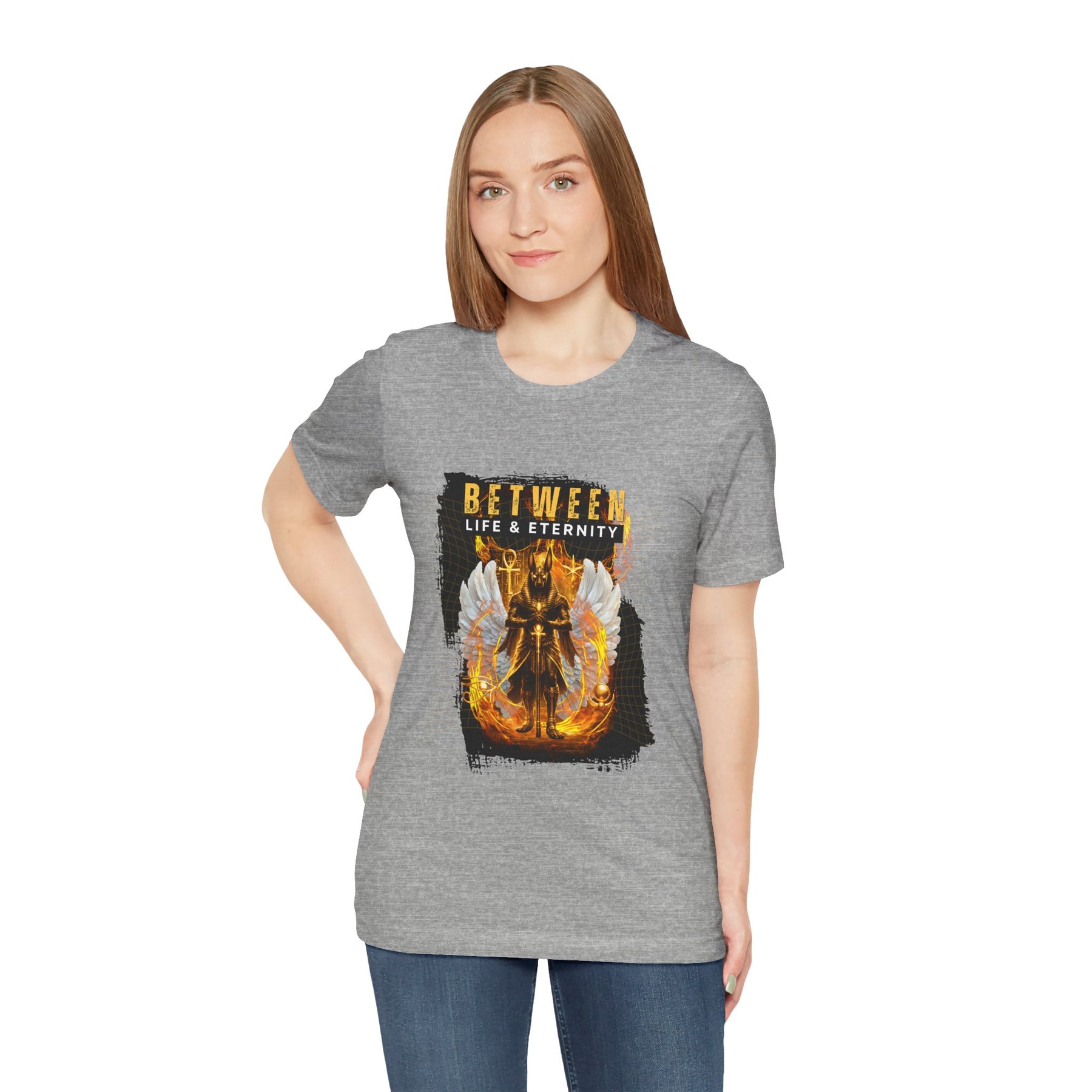 This semi-fitted cotton tee carries a bold, mythic design that reads “BETWEEN LIFE & ETERNITY” over a radiant, winged figure framed in smoldering golds and black brushstrokes. It feels like armor and story in equal measure — lightweight enough for everyday wear, substantial enough to hold its shape after repeated washes. Wear it when you want to tap into a dramatic, contemplative mood: layered under a leather jacket for night shows, paired with worn jeans for city wandering, or lounging at home while reading speculative fiction. The artwork invites quiet attention and conversation, a wearable piece that speaks to fans of epic symbolism and modern street art alike.