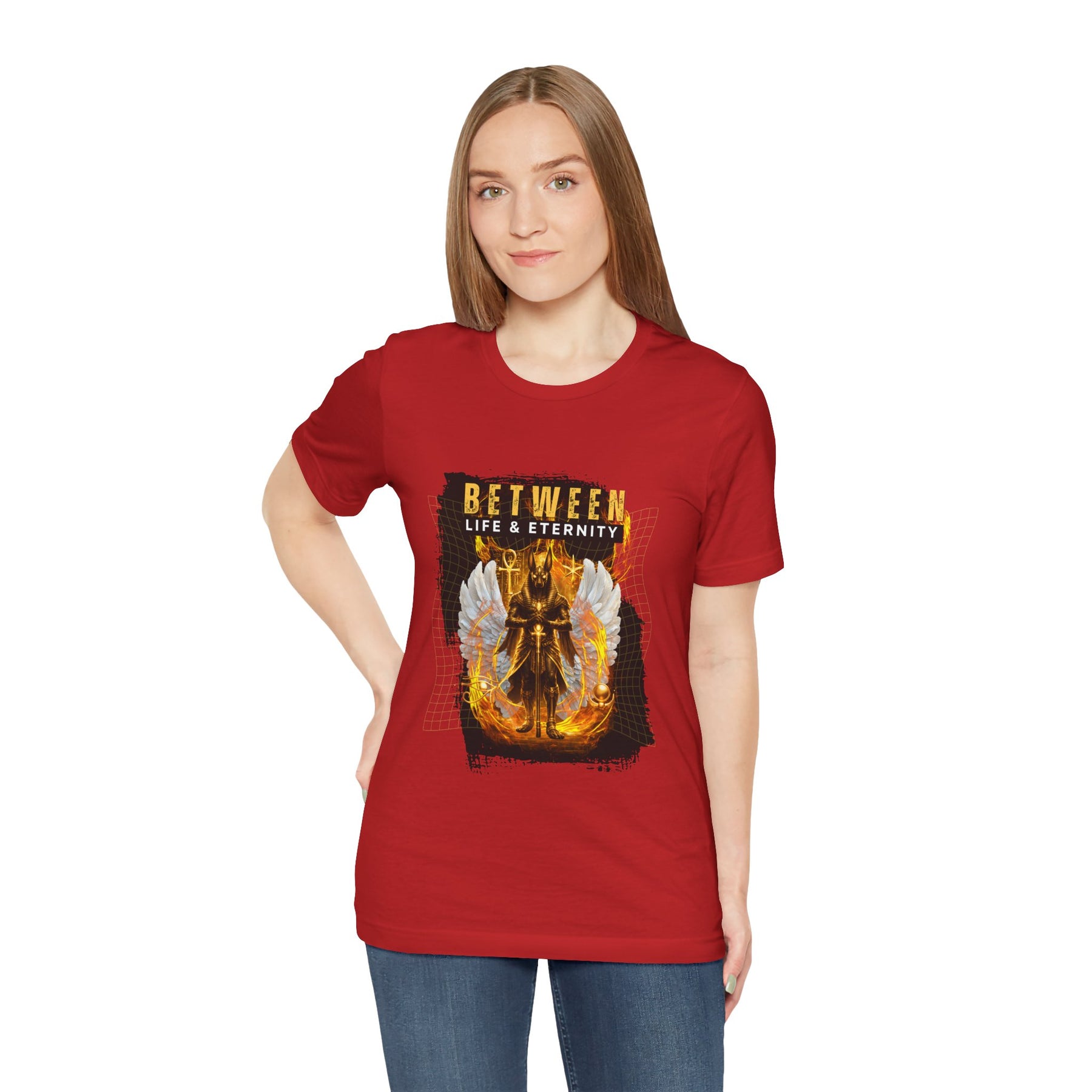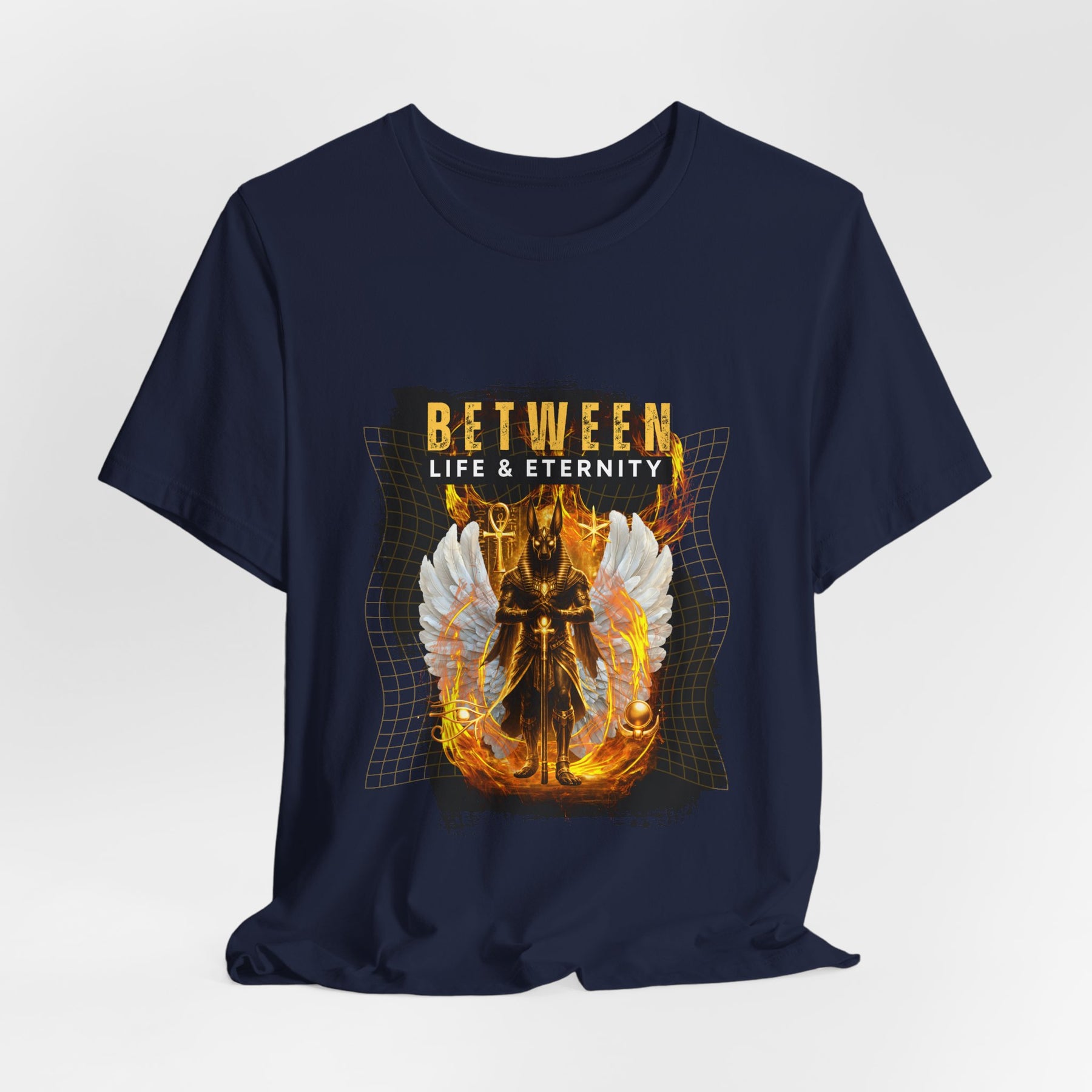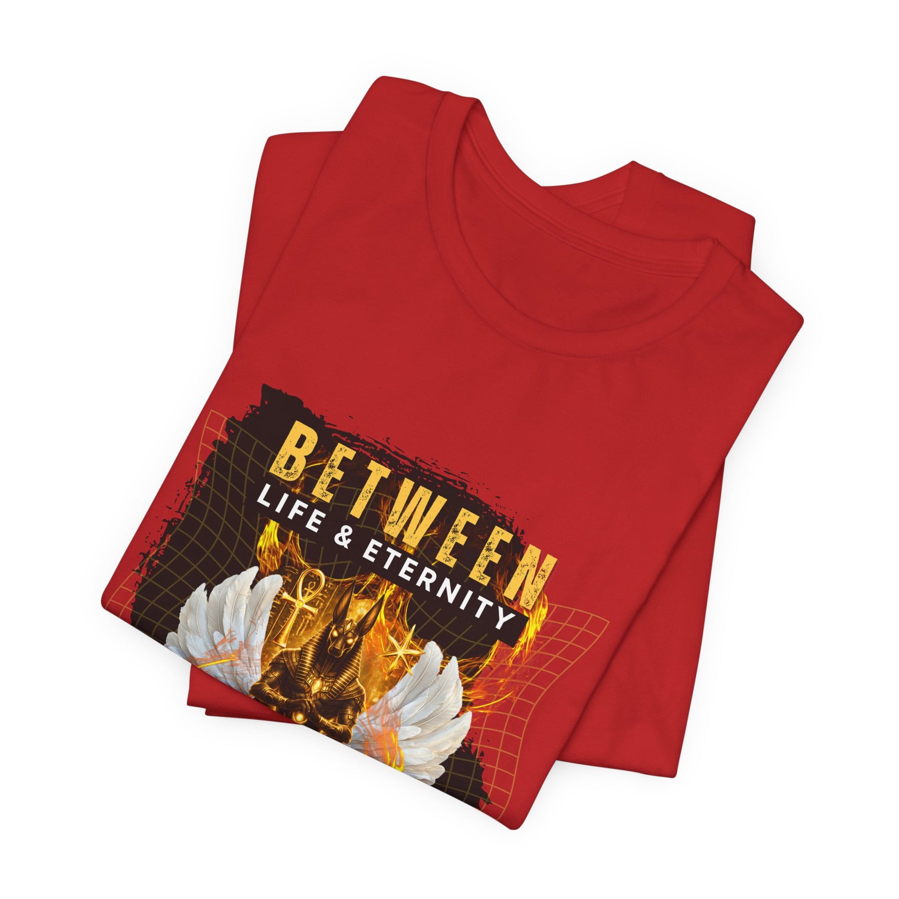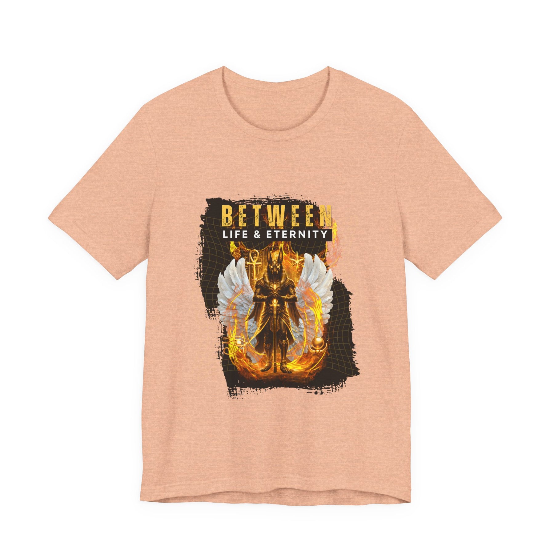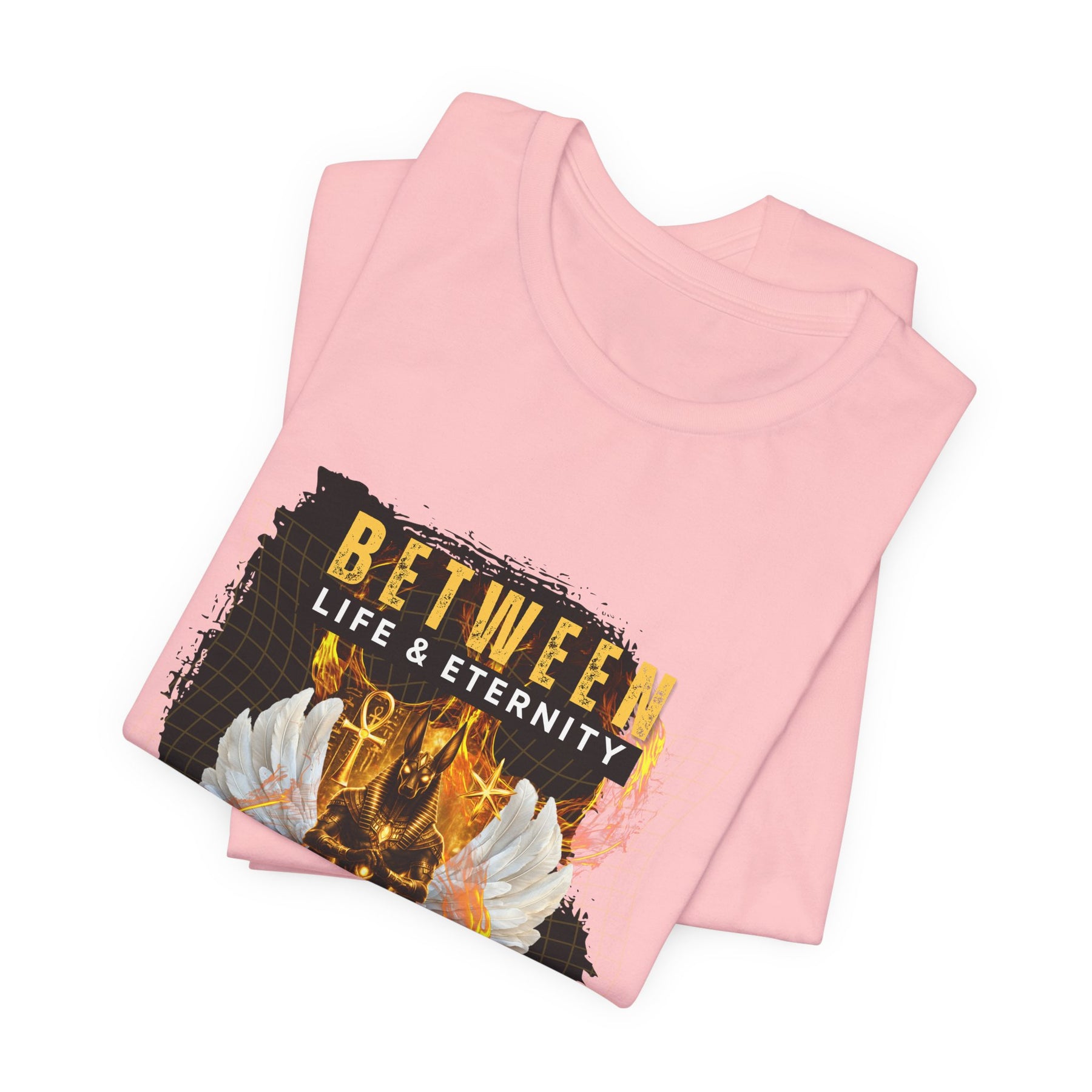 This semi-fitted cotton tee carries a bold, mythic design that reads “BETWEEN LIFE & ETERNITY” over a radiant, winged figure framed in smoldering golds and black brushstrokes. It feels like armor and story in equal measure — lightweight enough for everyday wear, substantial enough to hold its shape after repeated washes. Wear it when you want to tap into a dramatic, contemplative mood: layered under a leather jacket for night shows, paired with worn jeans for city wandering, or lounging at home while reading speculative fiction. The artwork invites quiet attention and conversation, a wearable piece that speaks to fans of epic symbolism and modern street art alike.