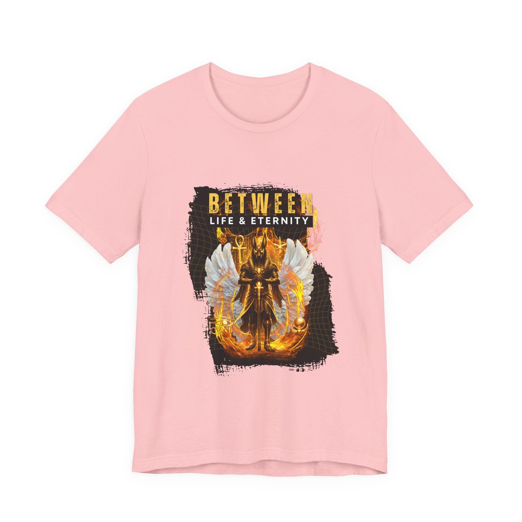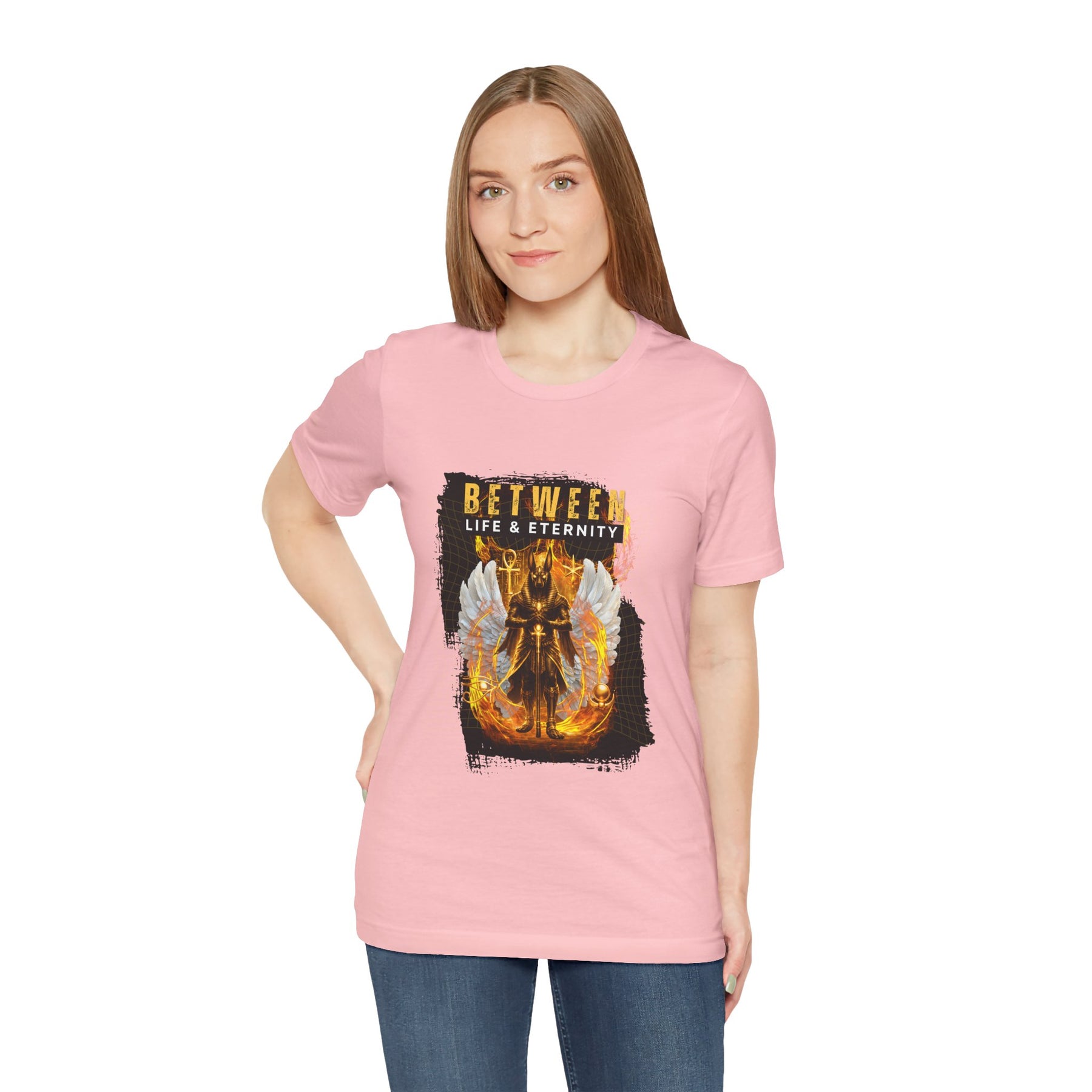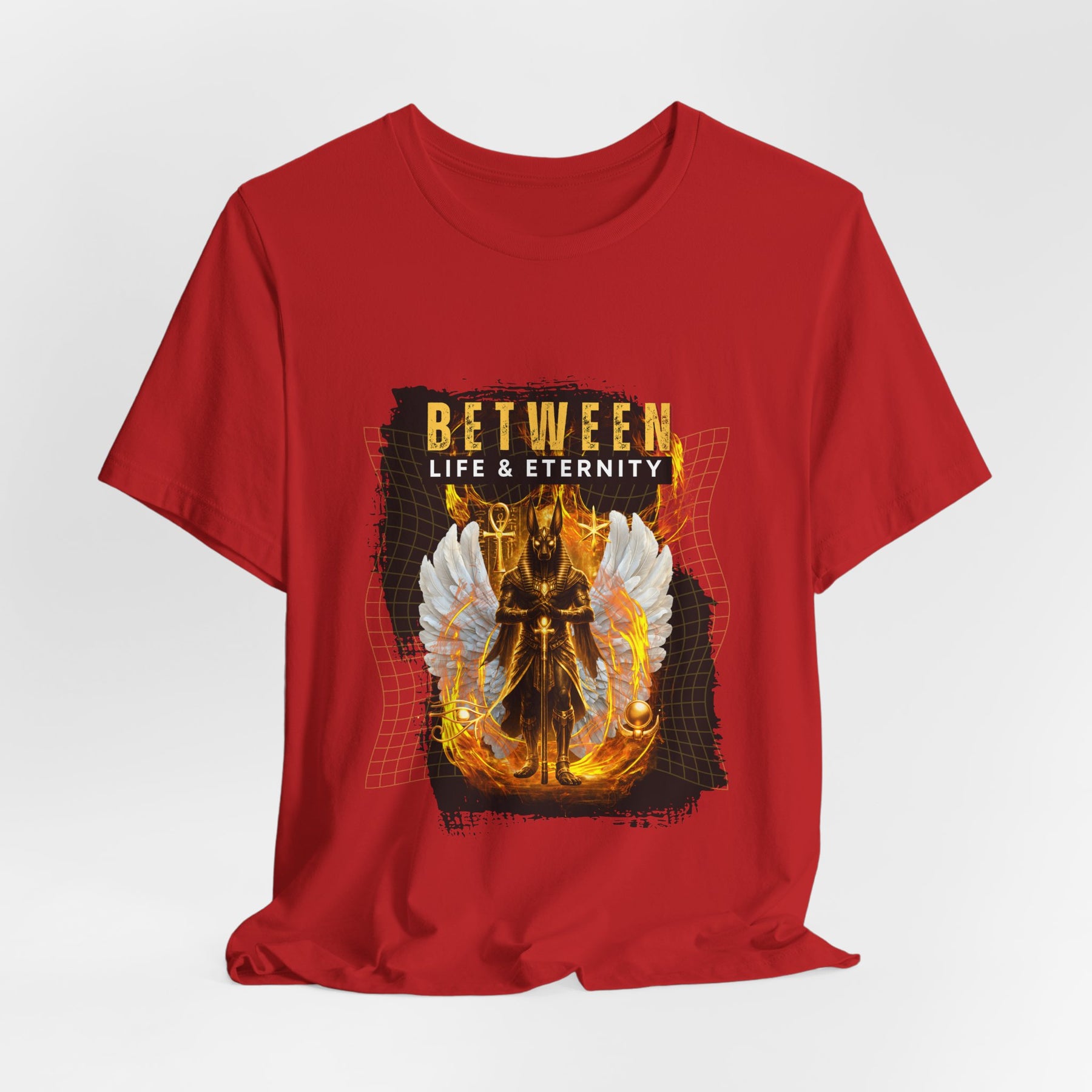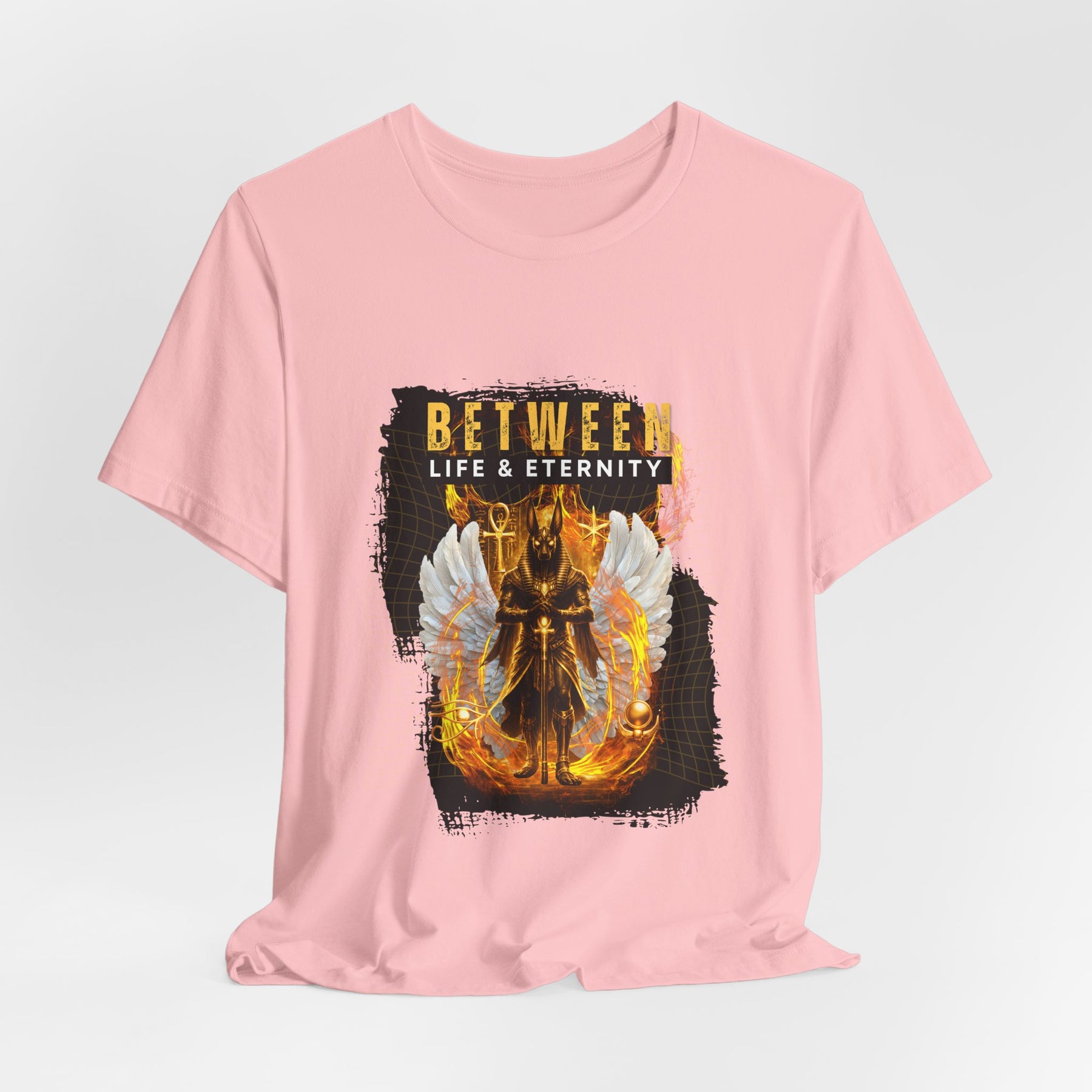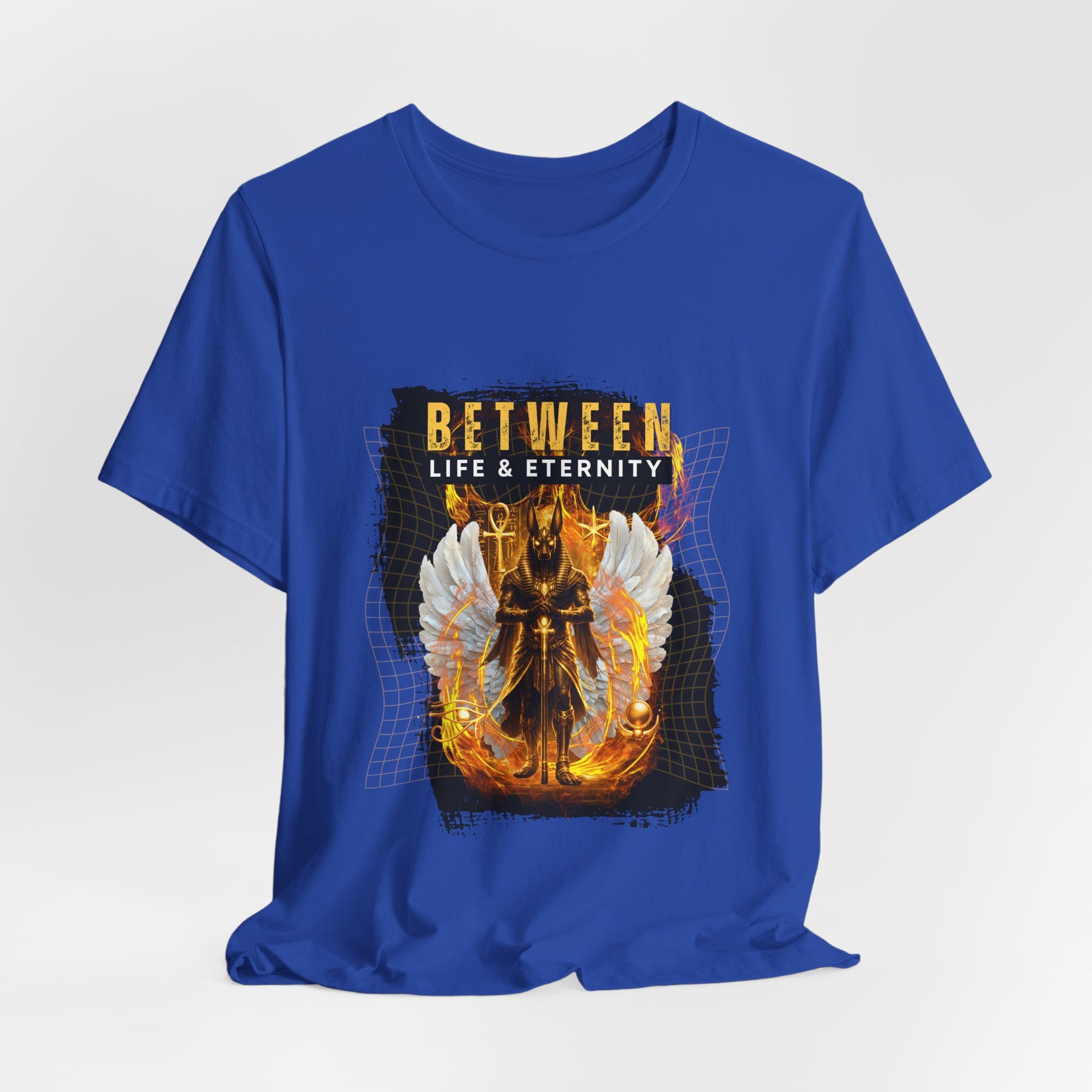 This semi-fitted cotton tee carries a bold, mythic design that reads “BETWEEN LIFE & ETERNITY” over a radiant, winged figure framed in smoldering golds and black brushstrokes. It feels like armor and story in equal measure — lightweight enough for everyday wear, substantial enough to hold its shape after repeated washes. Wear it when you want to tap into a dramatic, contemplative mood: layered under a leather jacket for night shows, paired with worn jeans for city wandering, or lounging at home while reading speculative fiction. The artwork invites quiet attention and conversation, a wearable piece that speaks to fans of epic symbolism and modern street art alike.