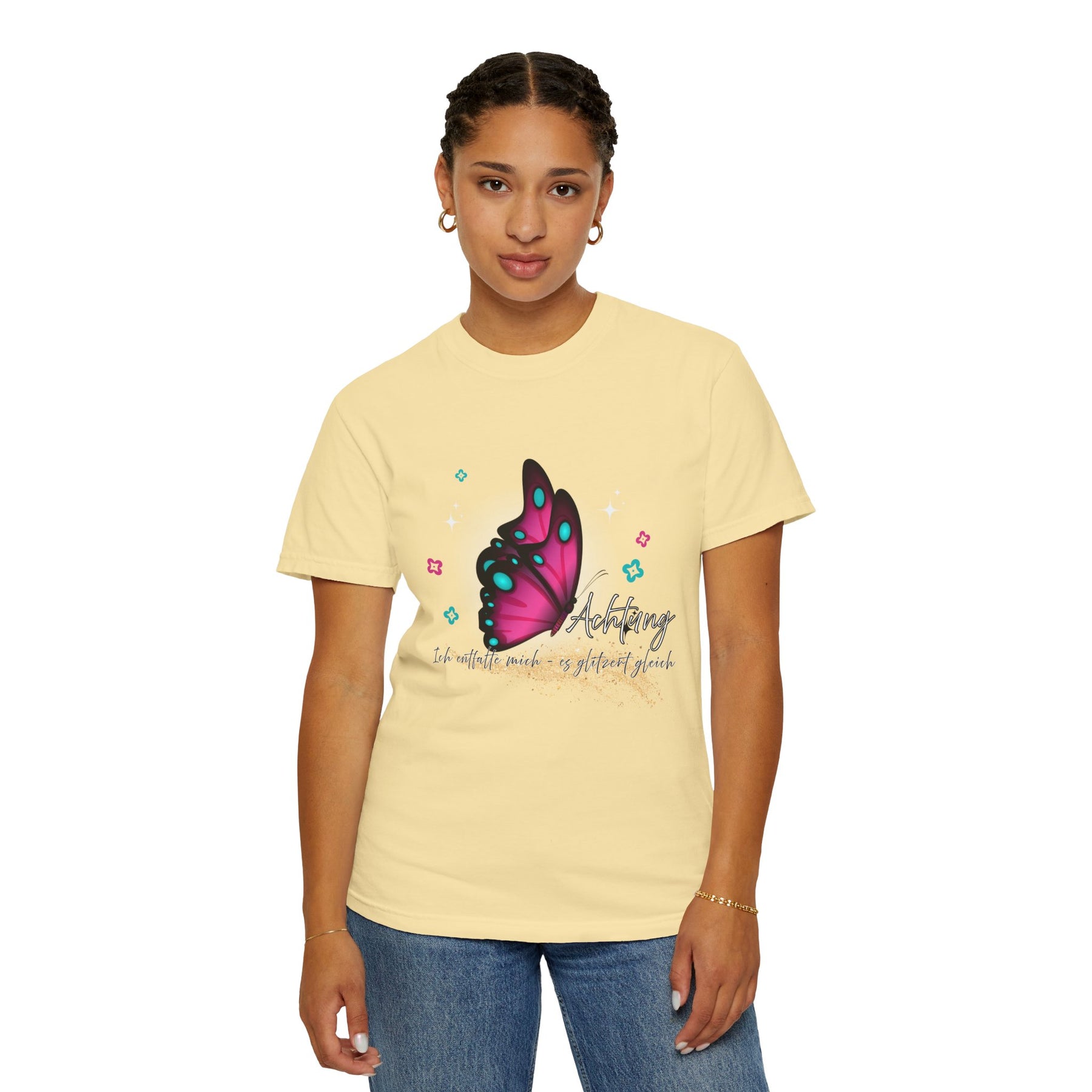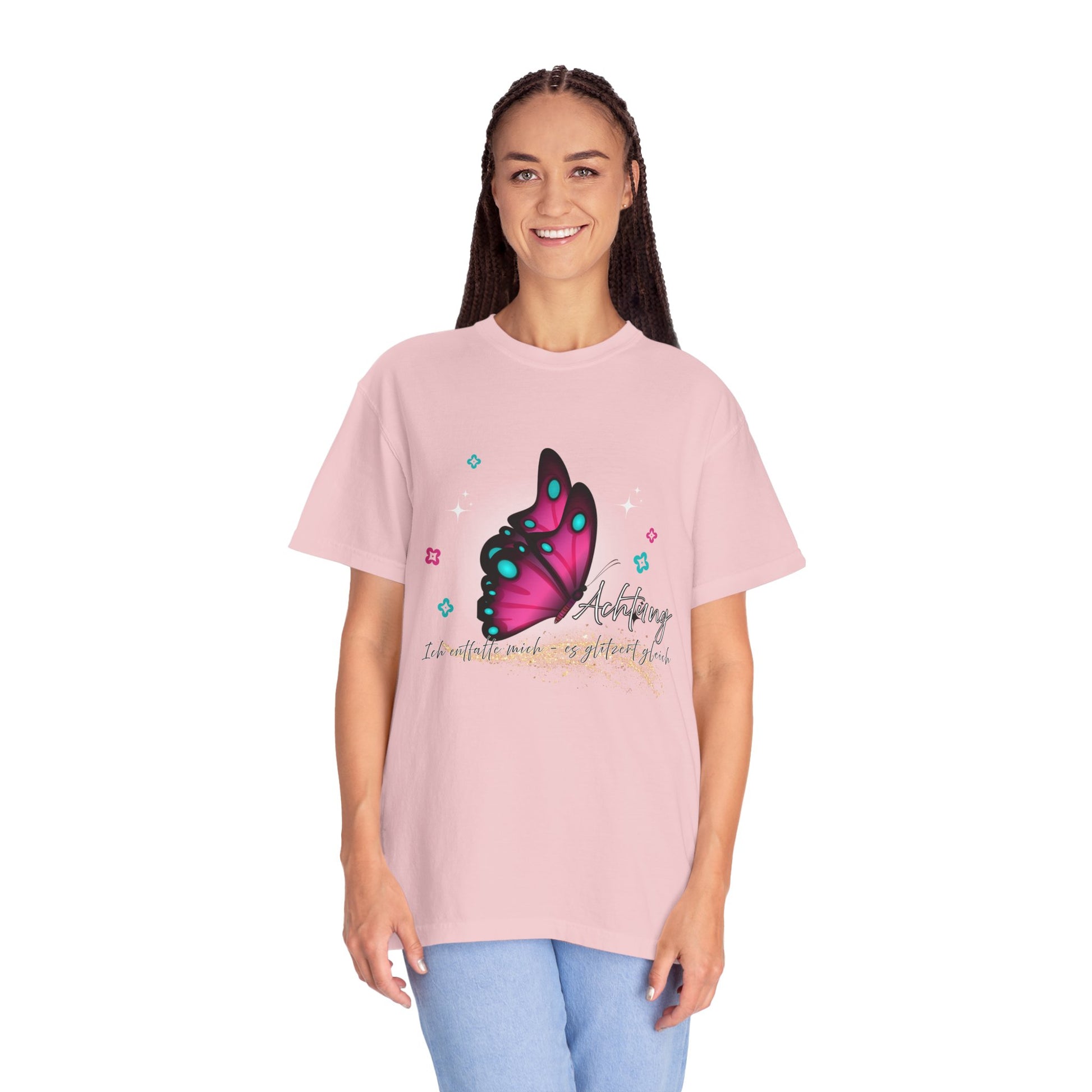 Dieses Motiv steht für Selbstbewusstsein, Transformation und Stärke. Der leuchtende Schmetterling mit Glitzer-Akzent symbolisiert Veränderung und neues Strahlen.