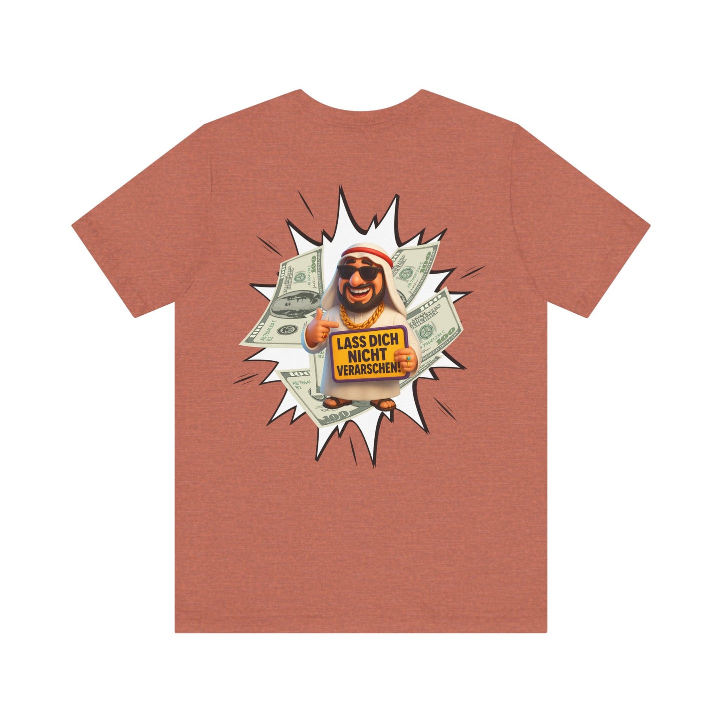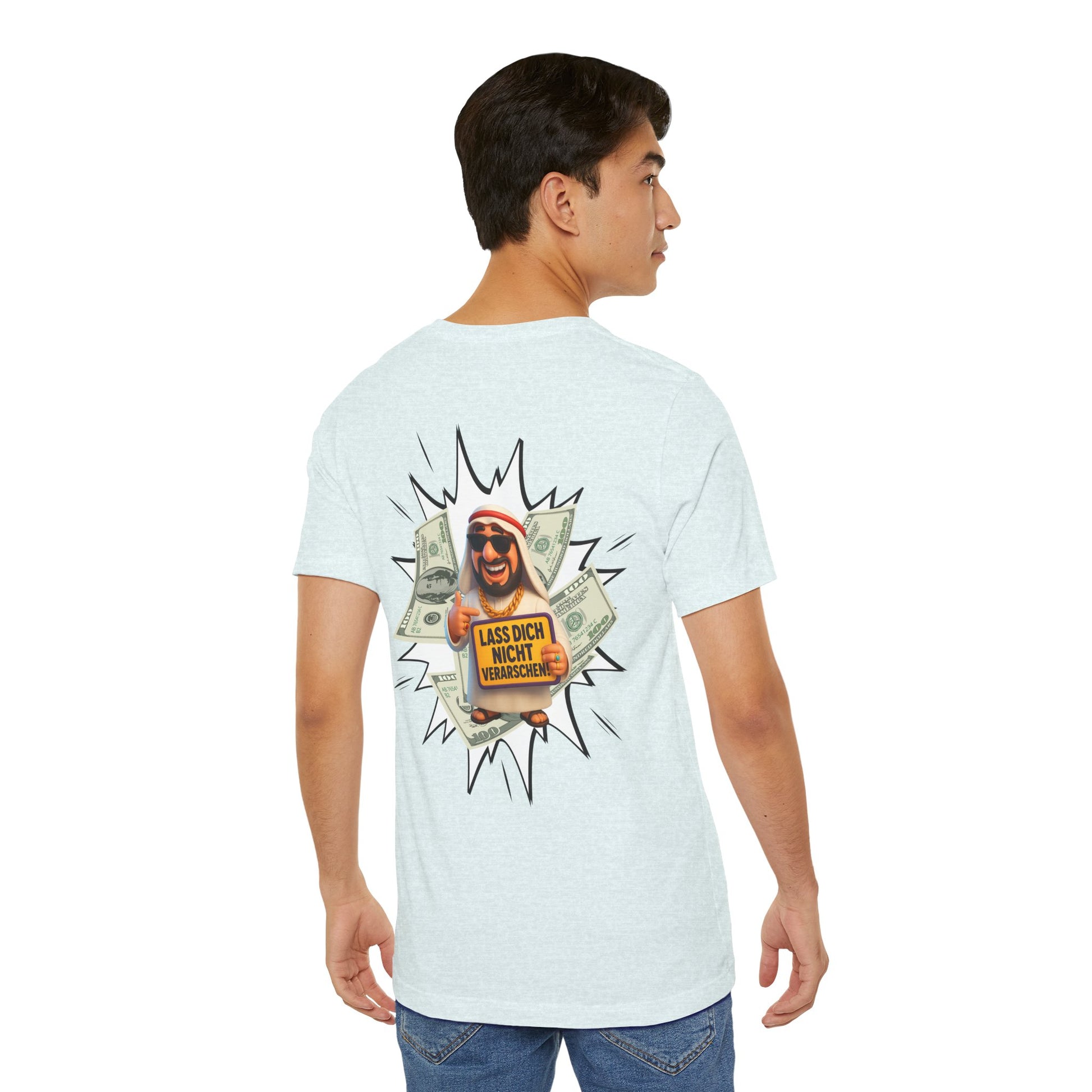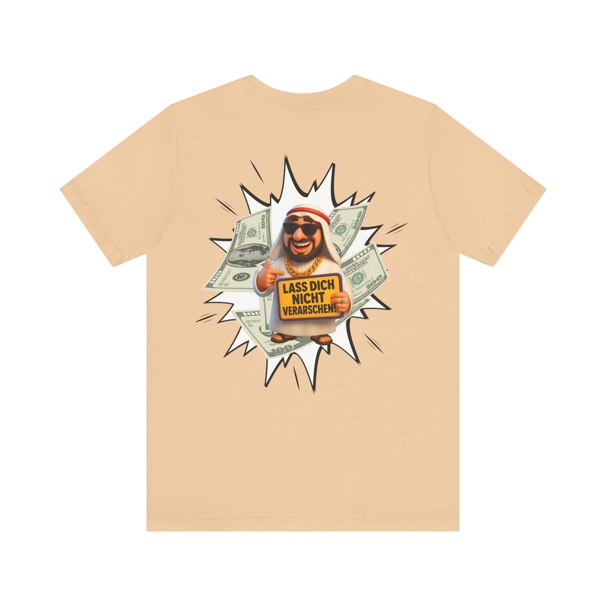 This shirt is more than just streetwear – it’s a statement! The front combines Bitcoin with Dubai vibes, while the back delivers the bold reminder “Don’t get fooled” in a money-splash cartoon style.