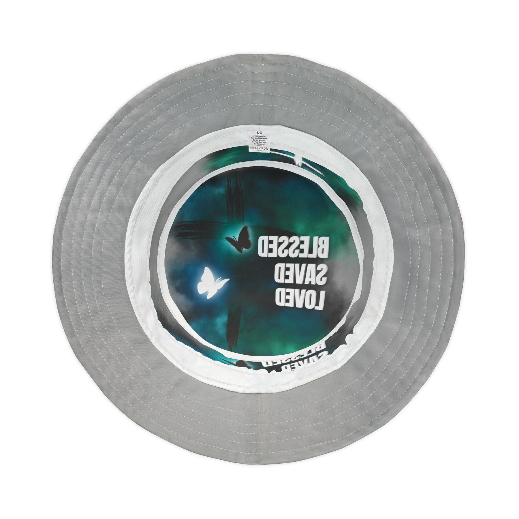 This bucket hat is the perfect accessory for those who want to combine faith and style. The green-black smoke look is paired with the statement “Blessed. Saved. Loved.” – accompanied by butterflies as symbols of hope and renewal.