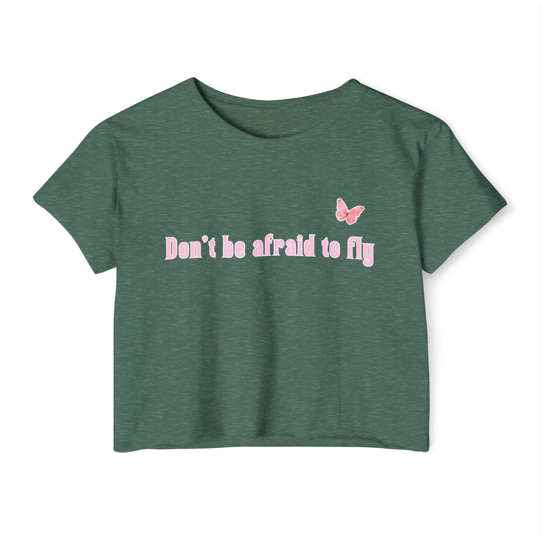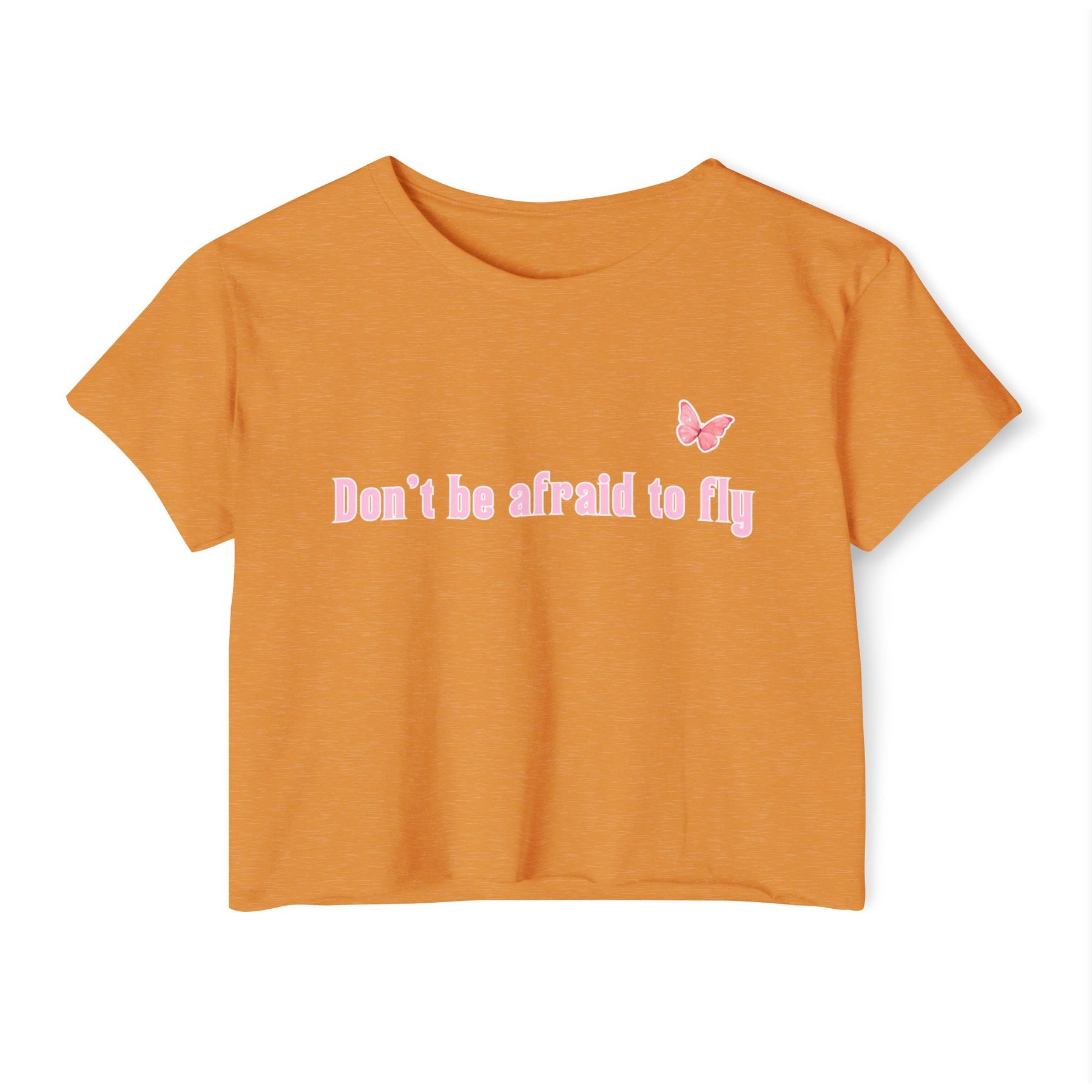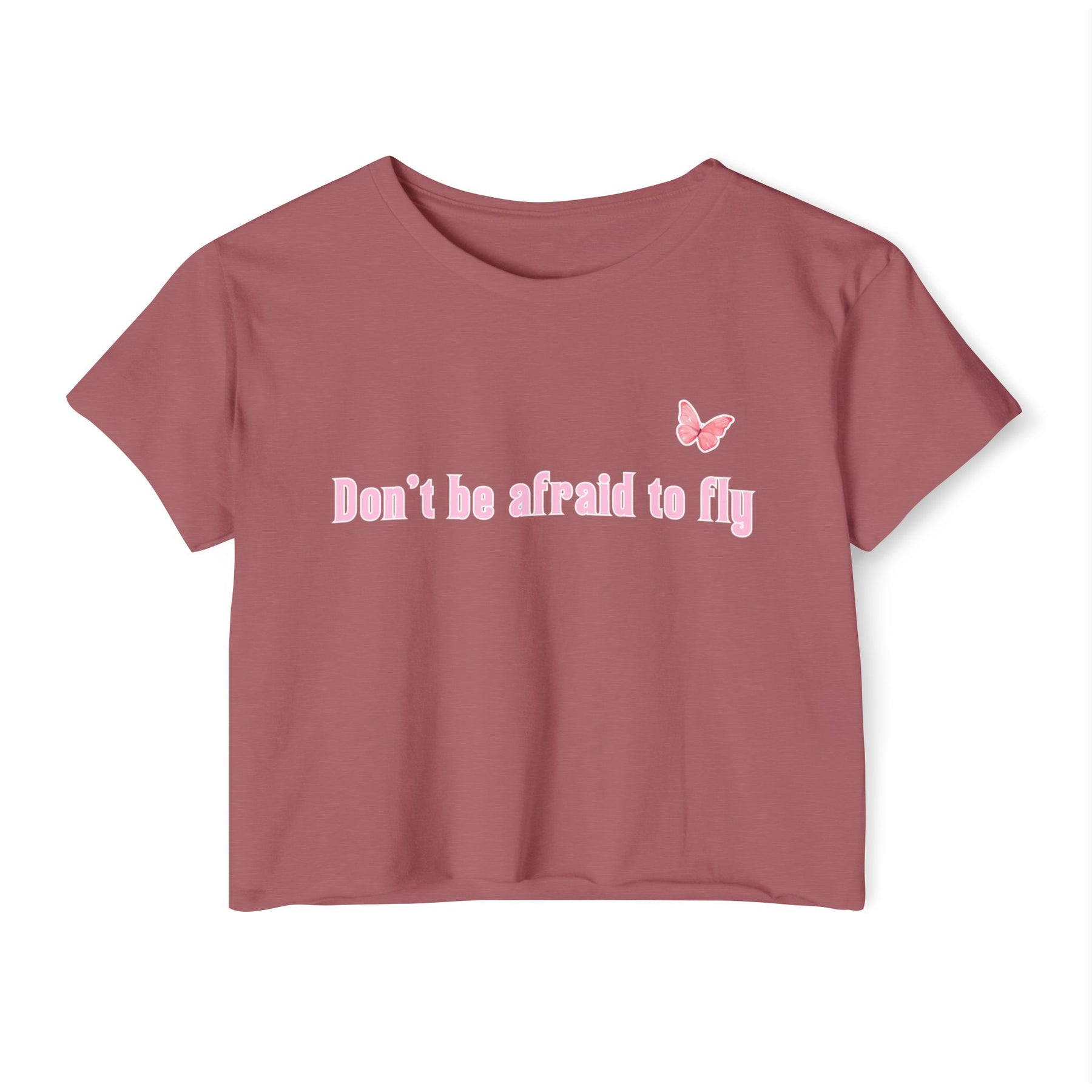 This playful crop tee is more than just a style piece – it's a gentle reminder to rise above fear and embrace your growth. The soft pink butterfly symbolizes transformation, courage, and lightness – ideal for anyone ready to take flight in their own direction. Pair it with high-waisted jeans or shorts for a cute and confident look.