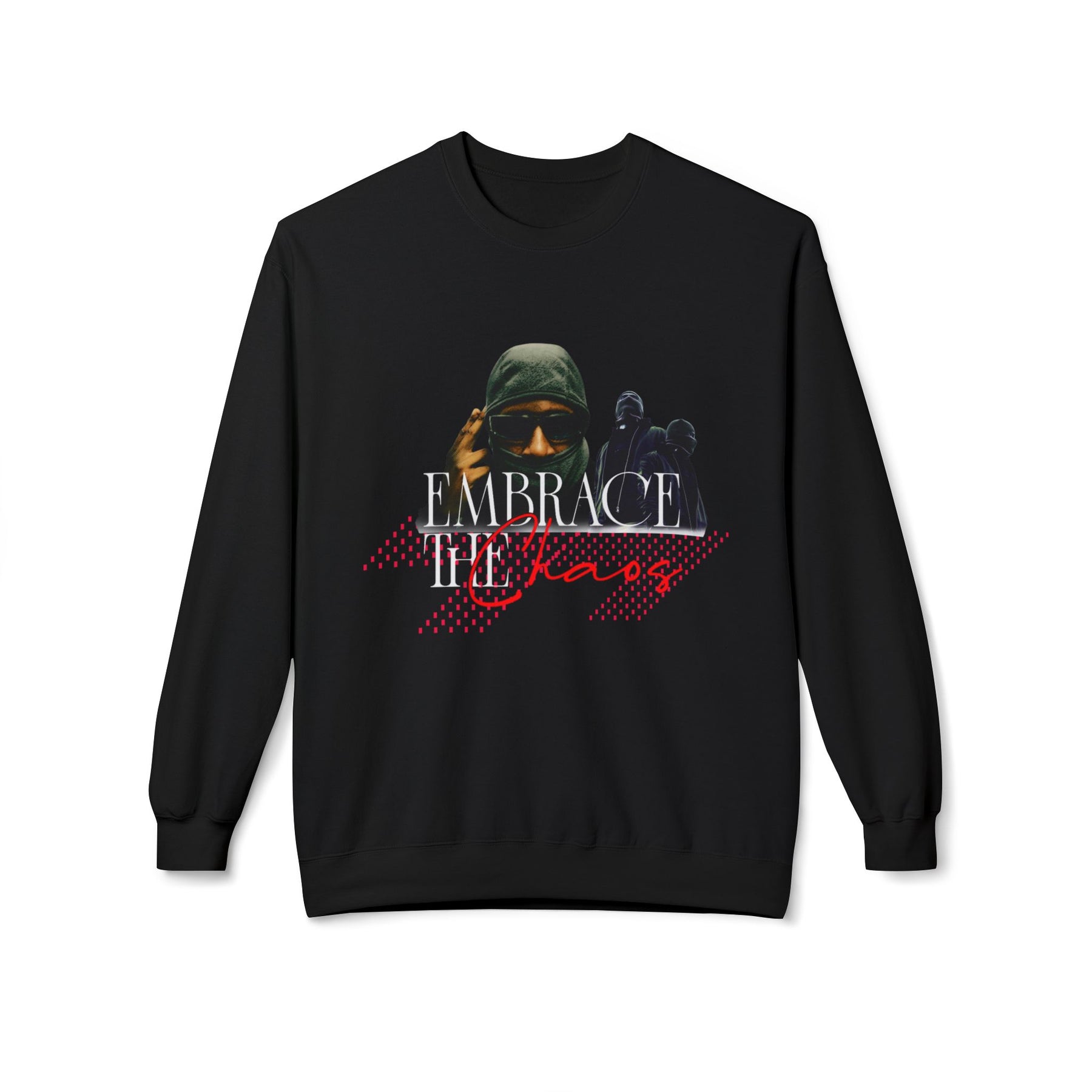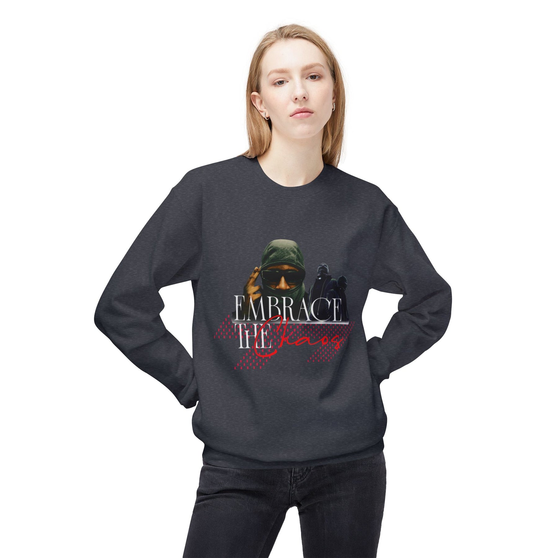 Typography: “Embrace the Chaos” in intense red – bold, glitchy, or spray-tag style