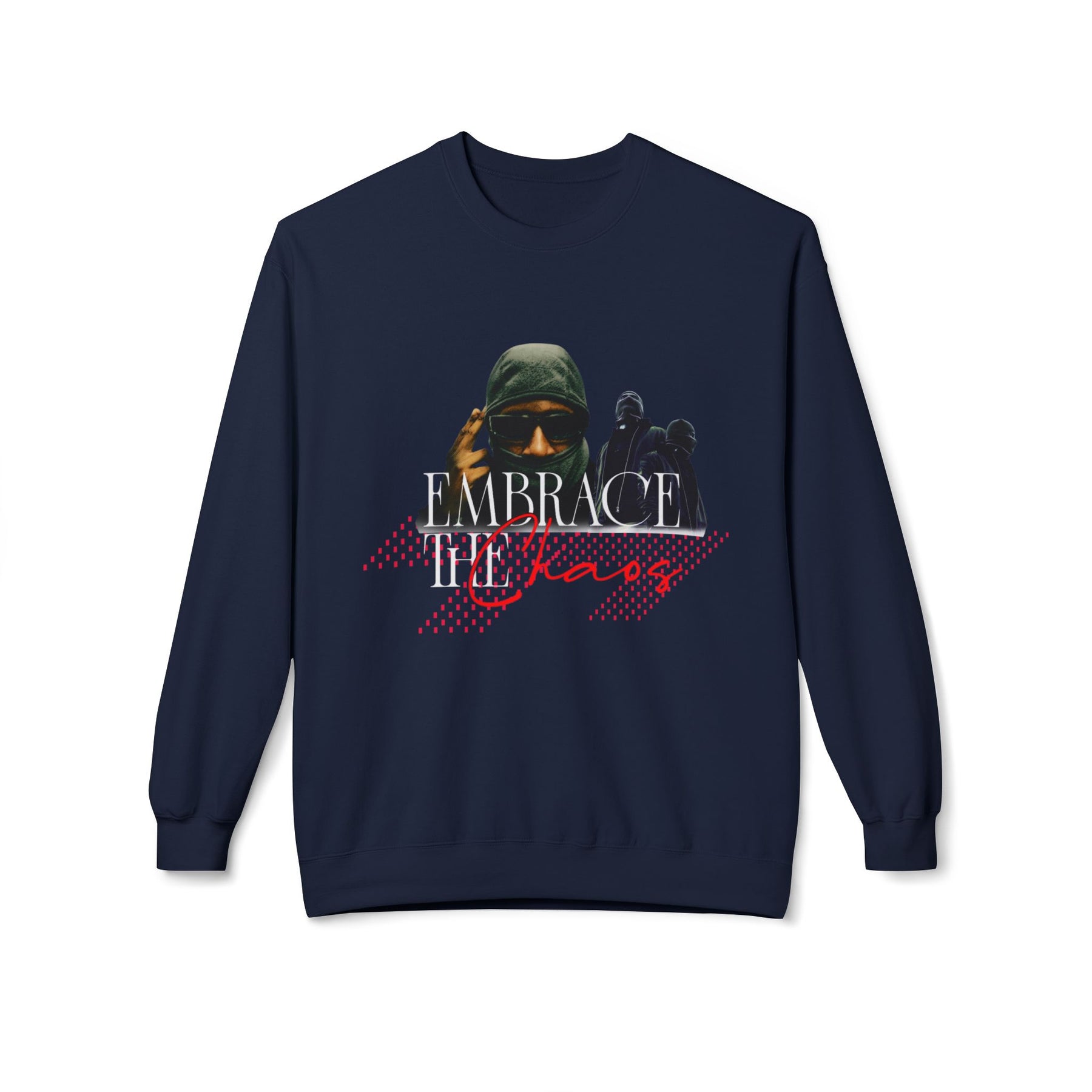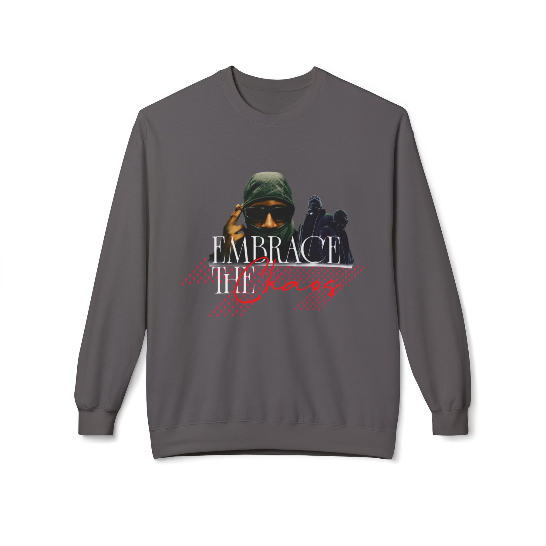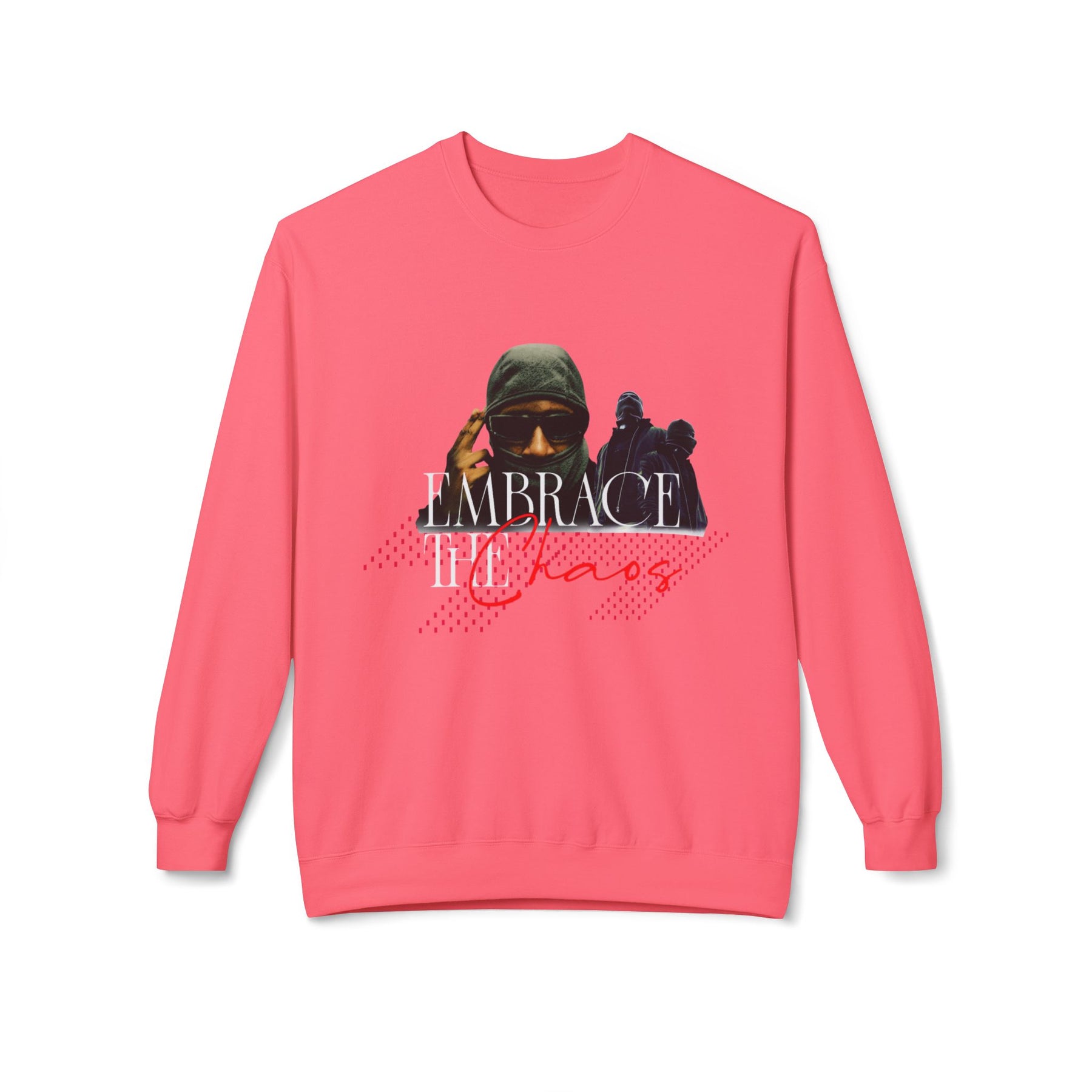 Lettering: “Embrace the Chaos” in intense, red-overlaid typography (e.g., spray, grunge, or block style)