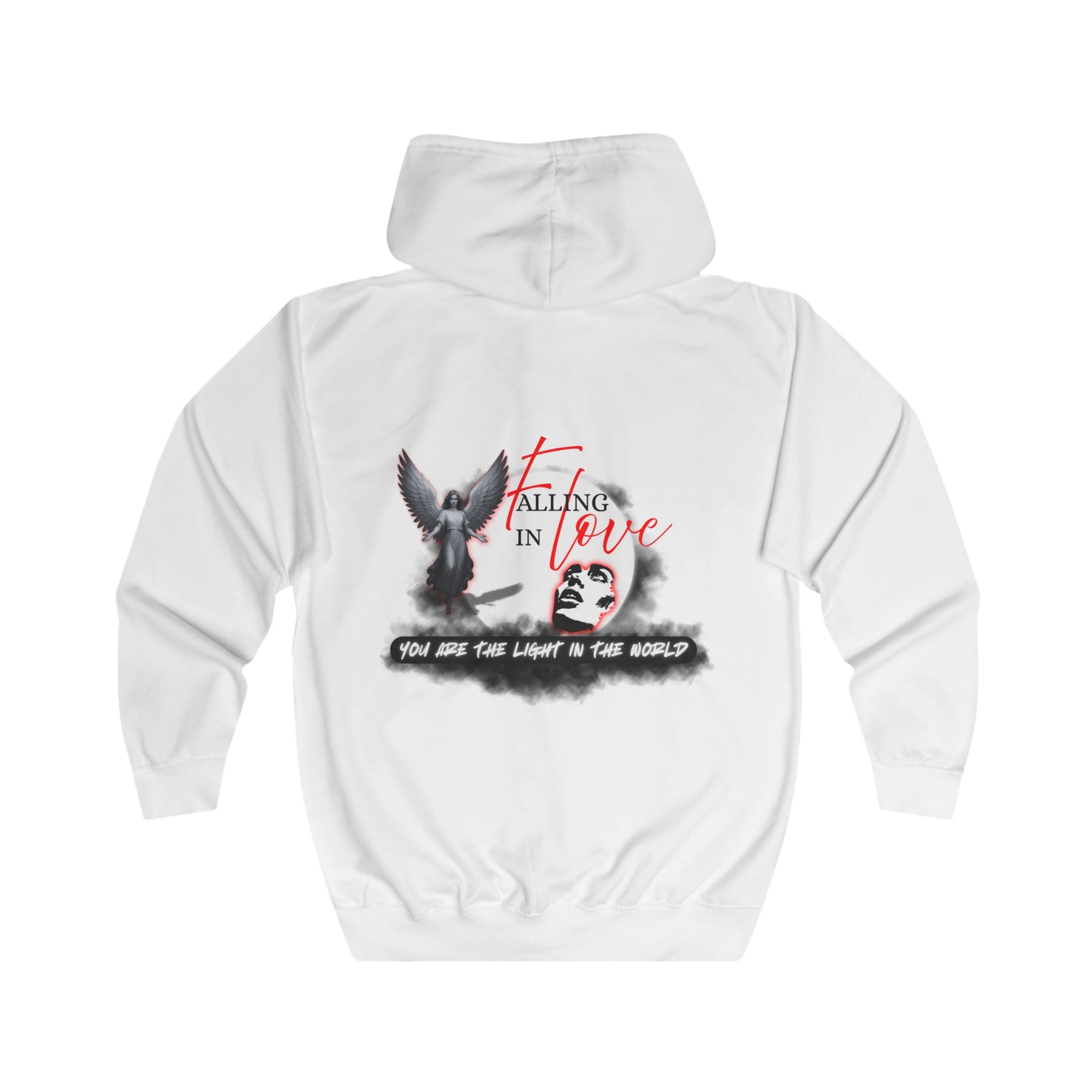 This hoodie is more than just streetwear – it’s a statement. The front features the artistic “Falling in Love” design with a bold face motif, while the back impresses with an angel, the message “You are the light in the world”, and powerful symbolism.
