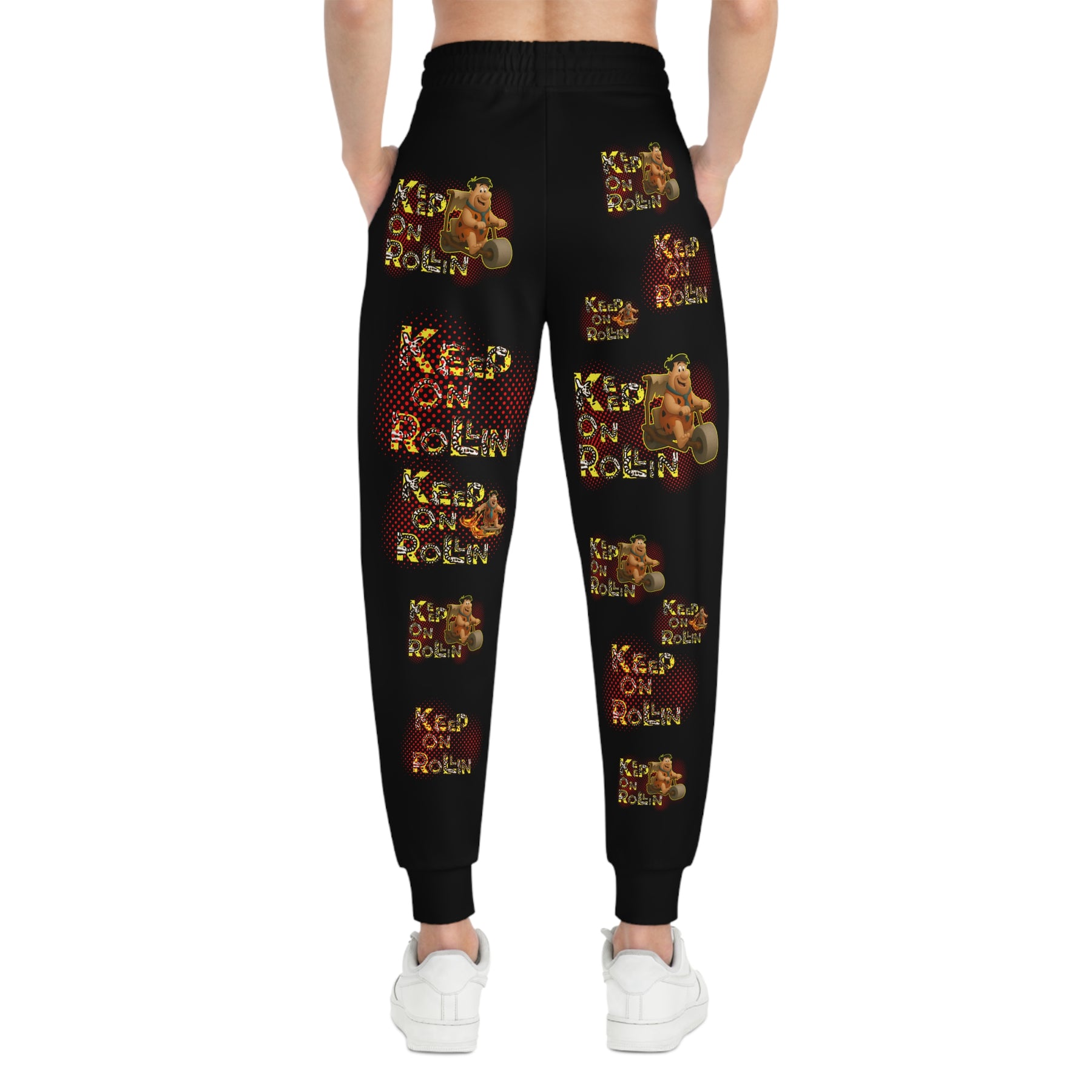 Bring the ultimate Stone Age vibe to your outfit! These black joggers are loaded with bold “Keep On Rollin” prints featuring Fred Flintstone in action – from riding a skateboard to cruising in his iconic stone-age car. Perfect for lounging, workouts, or making a statement.