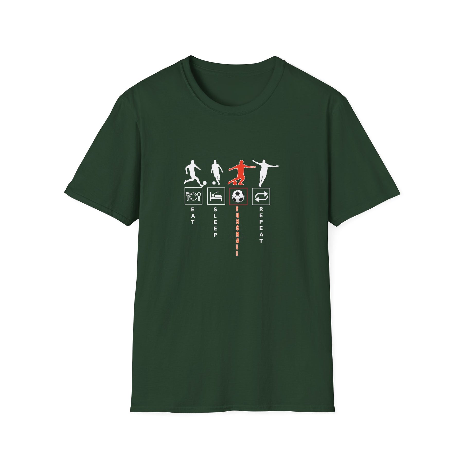 That's the game plan! This graphic tee spells out the ultimate playbook: four blocks of soccer devotion. From morning meals to match-winning goals – and repeat. With an orange highlight on the player and ball, it's clear: the pitch is life.