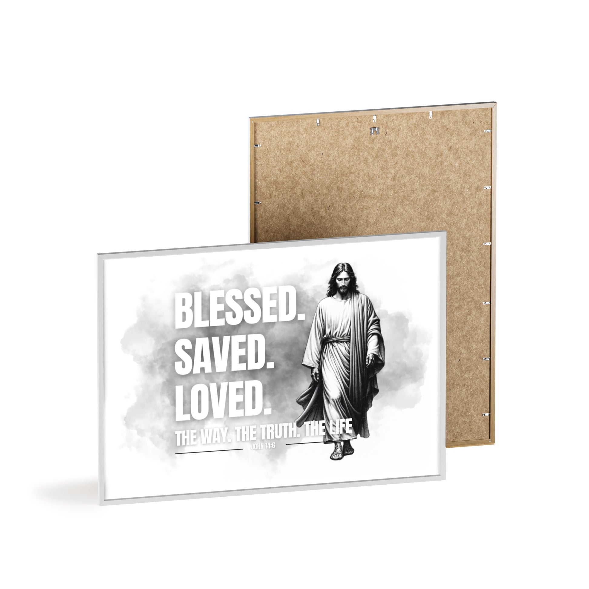 Inspirational Jesus Wall Art - Blessed, Saved, Loved - Framed Poster