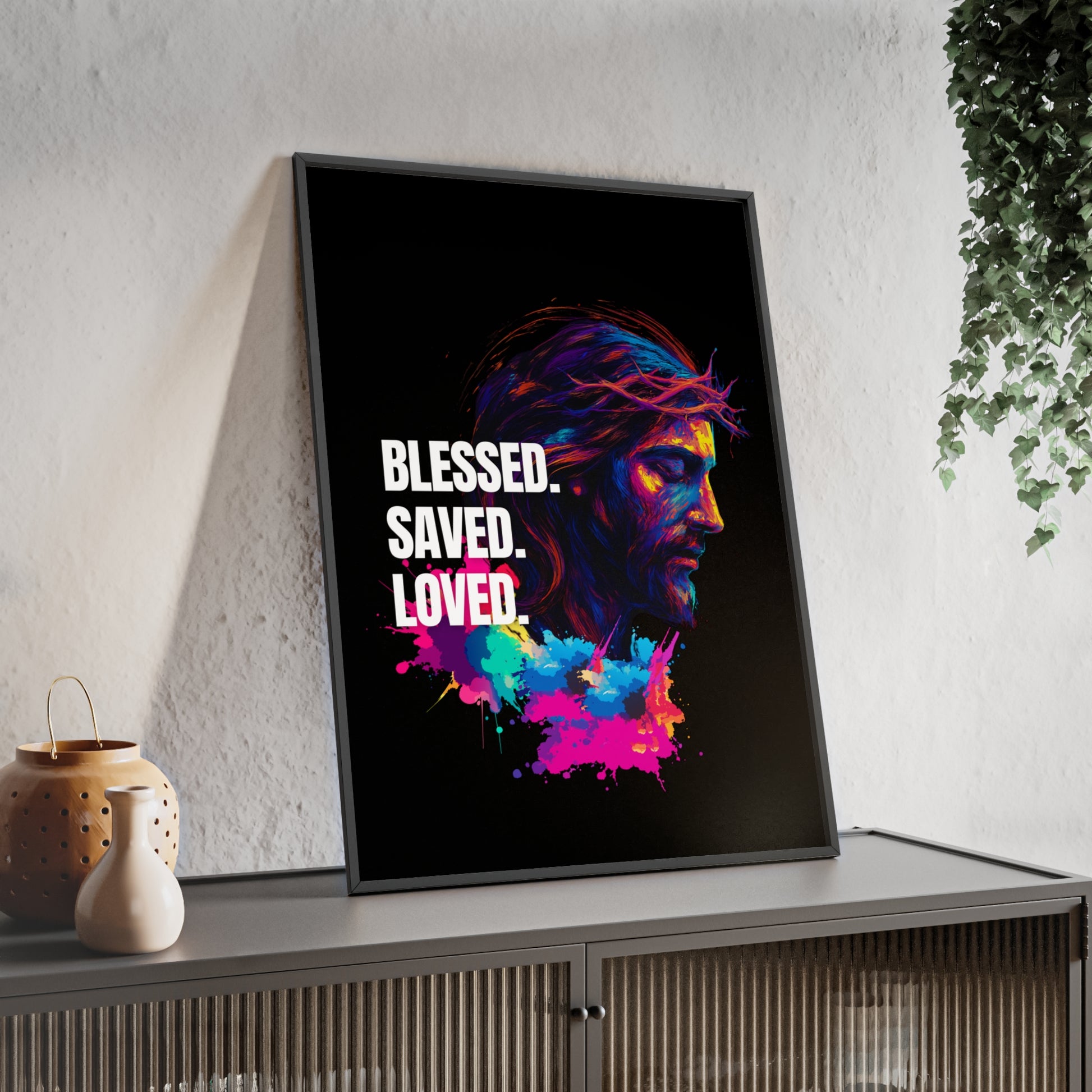 Inspirational Jesus Wall Art - 'Blessed, Saved, Loved' Poster with Wooden Frame