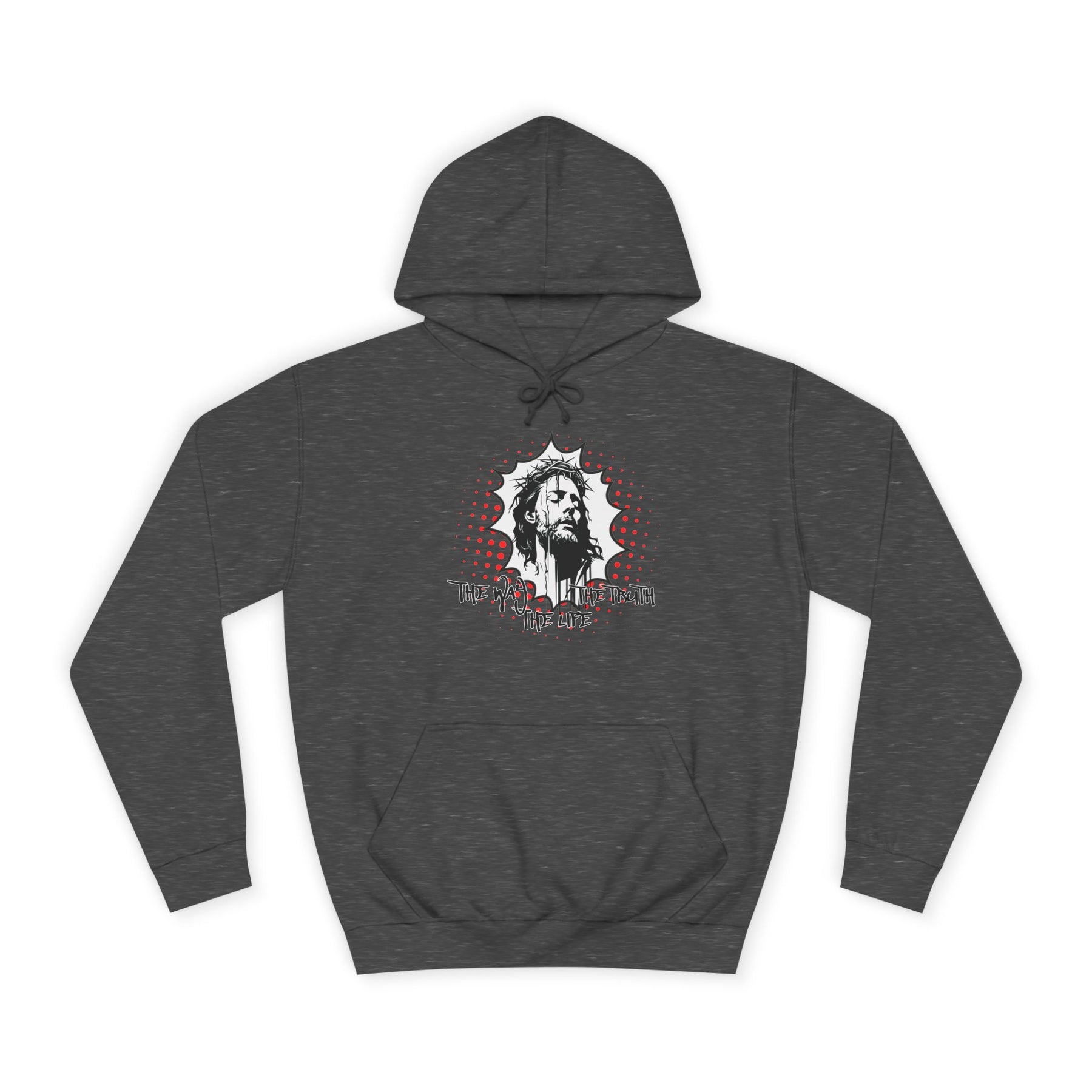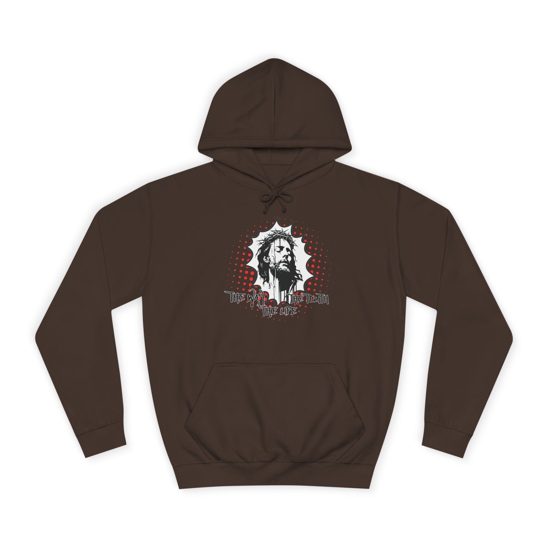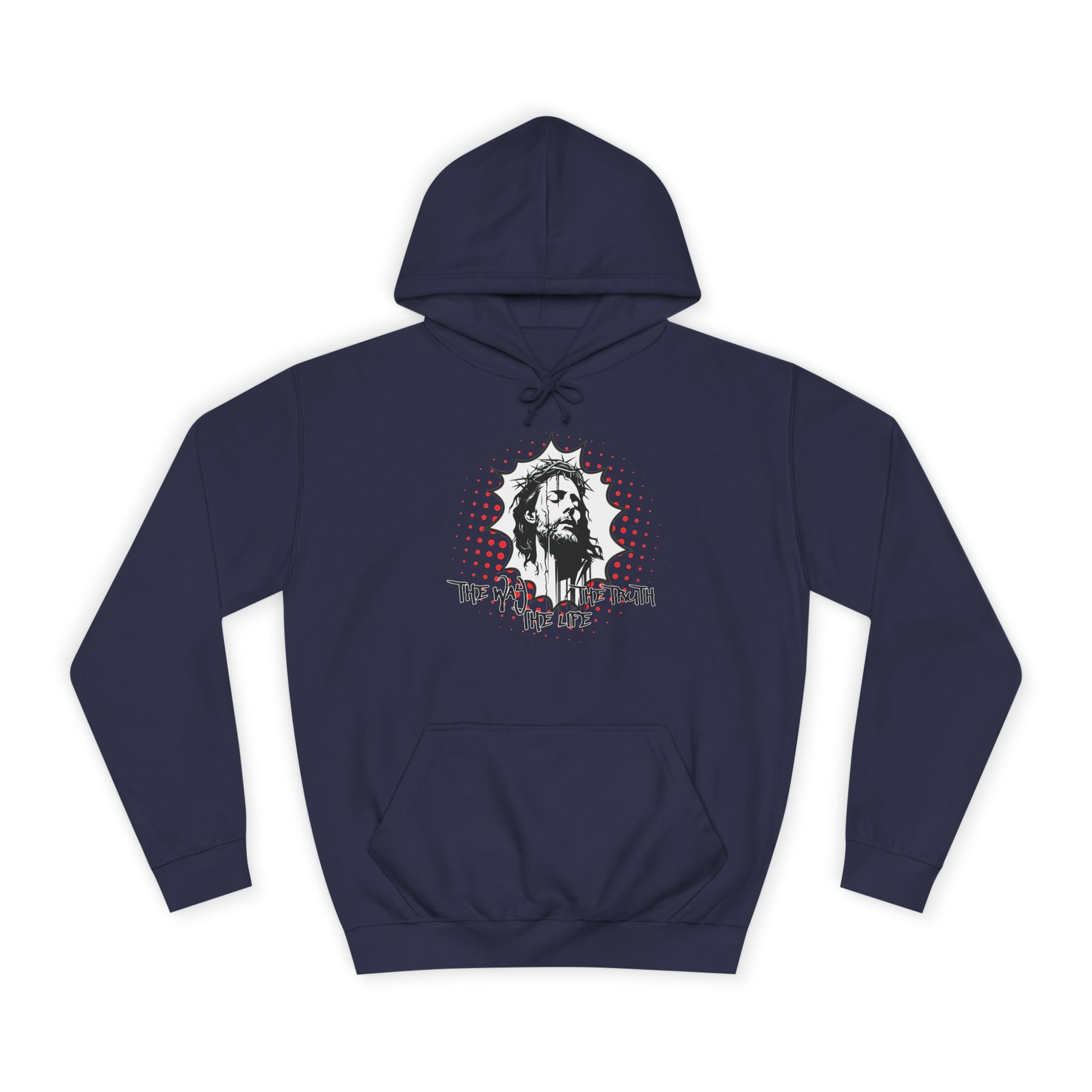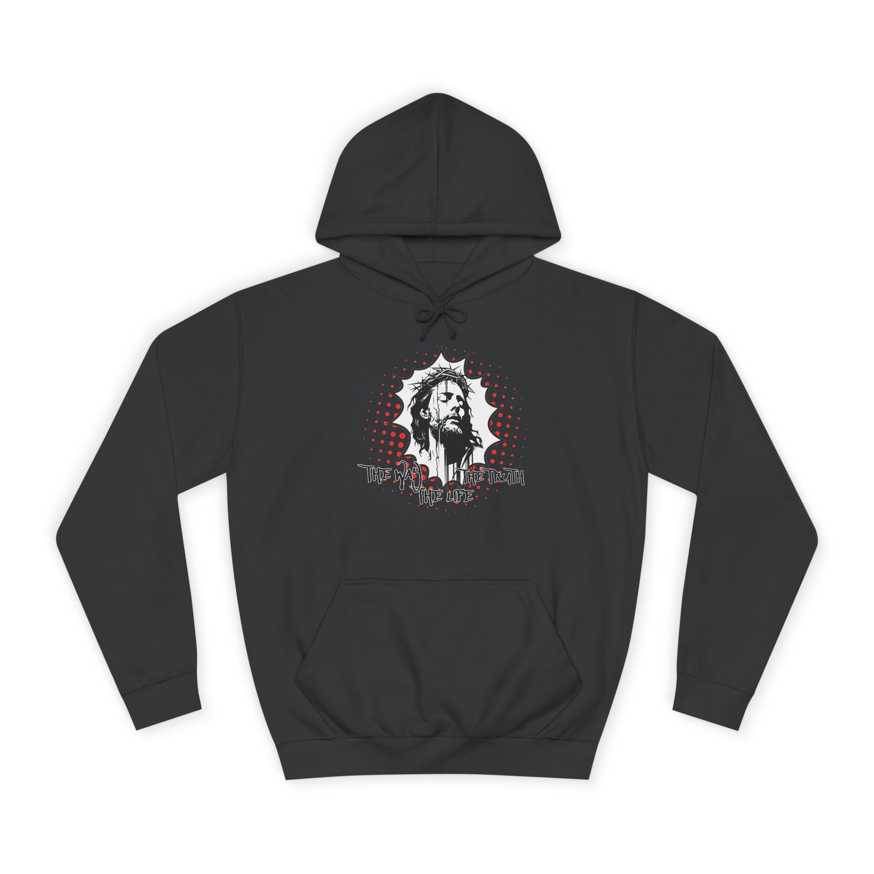 The design features Jesus with a crown of thorns in a modern streetwear style, combined with the message “The Way, The Truth, The Life”.