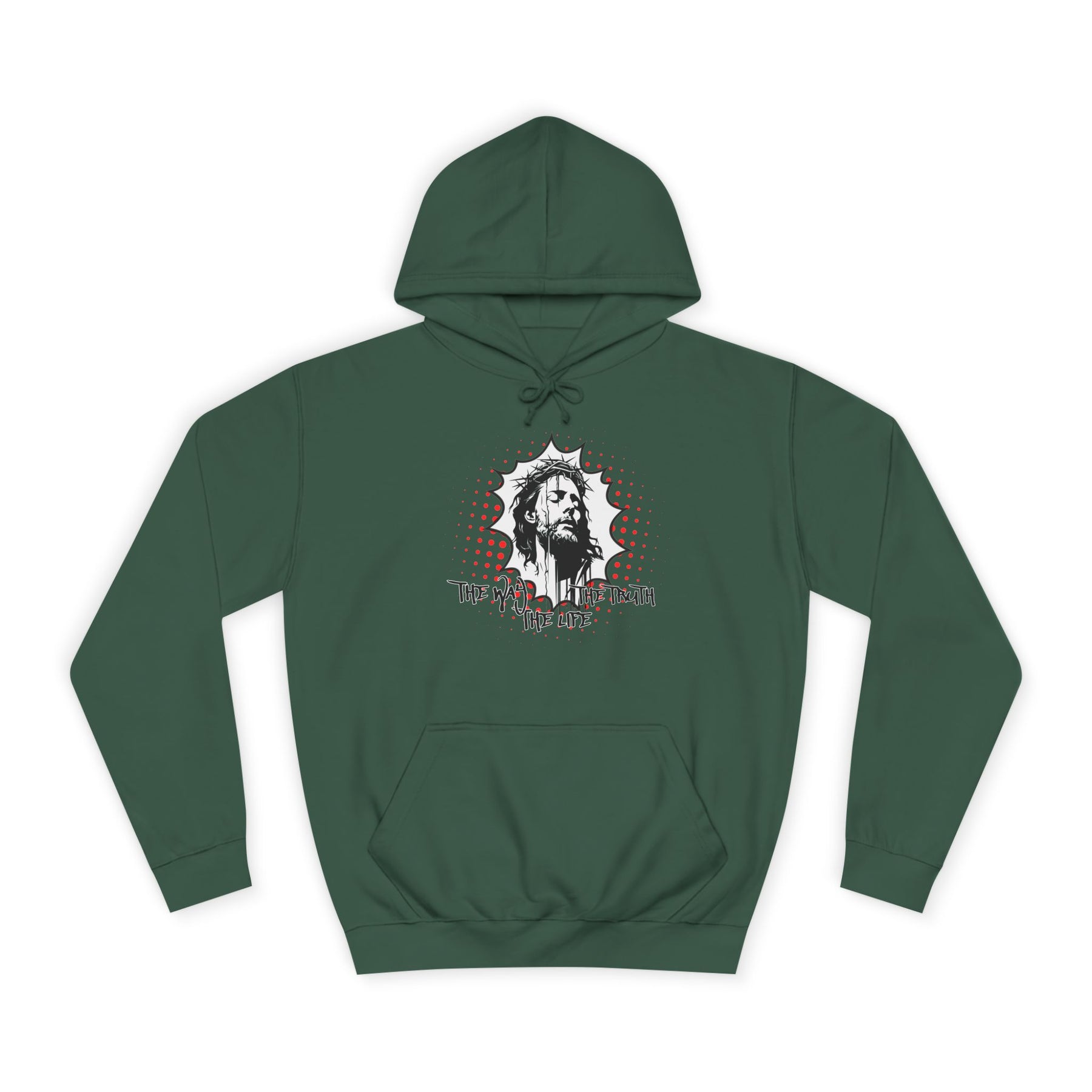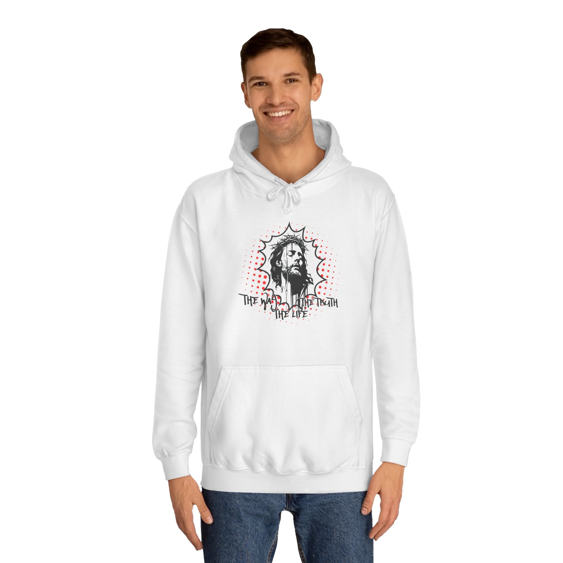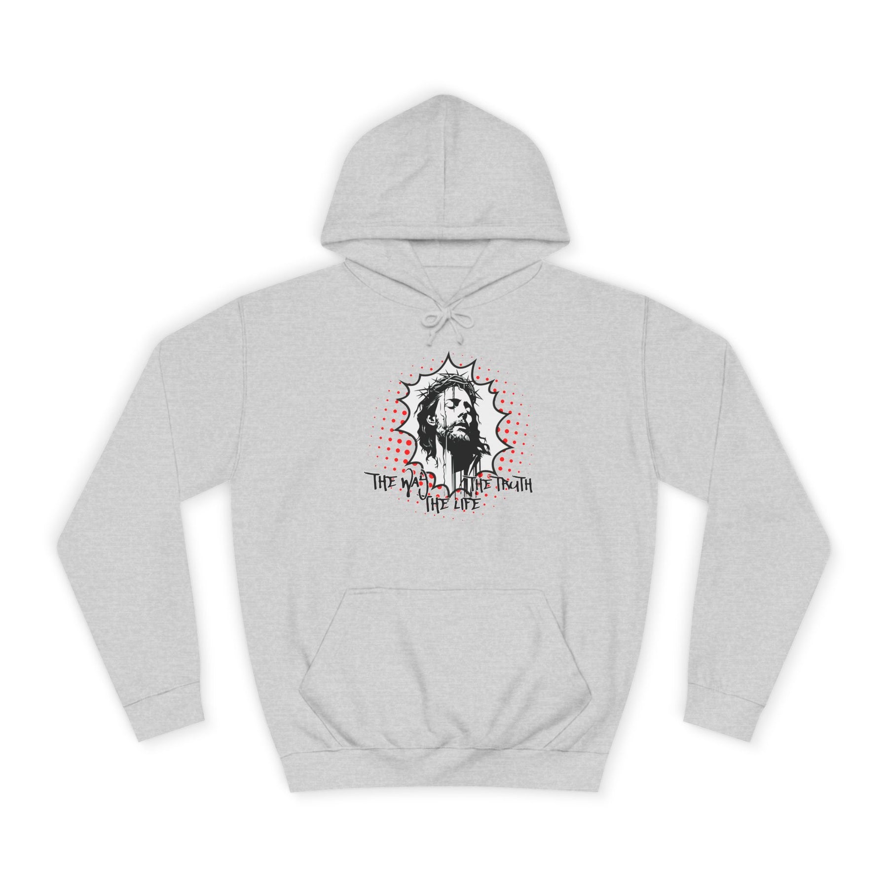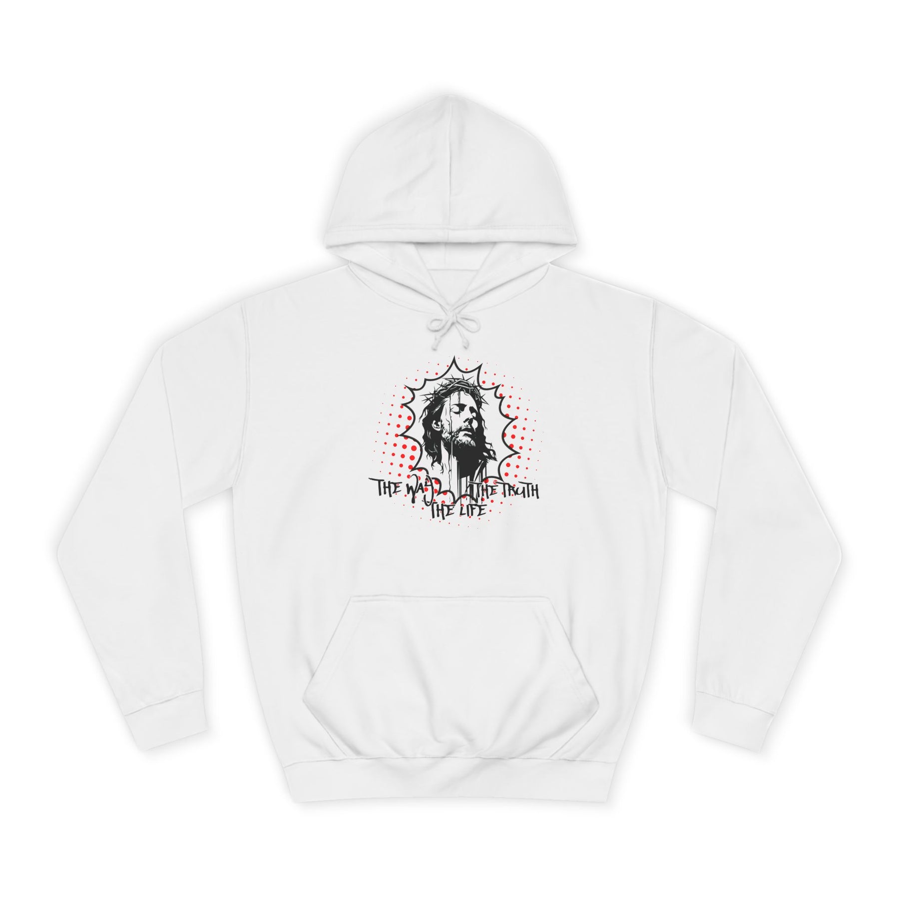 The design features Jesus with a crown of thorns in a modern streetwear style, combined with the message “The Way, The Truth, The Life”.