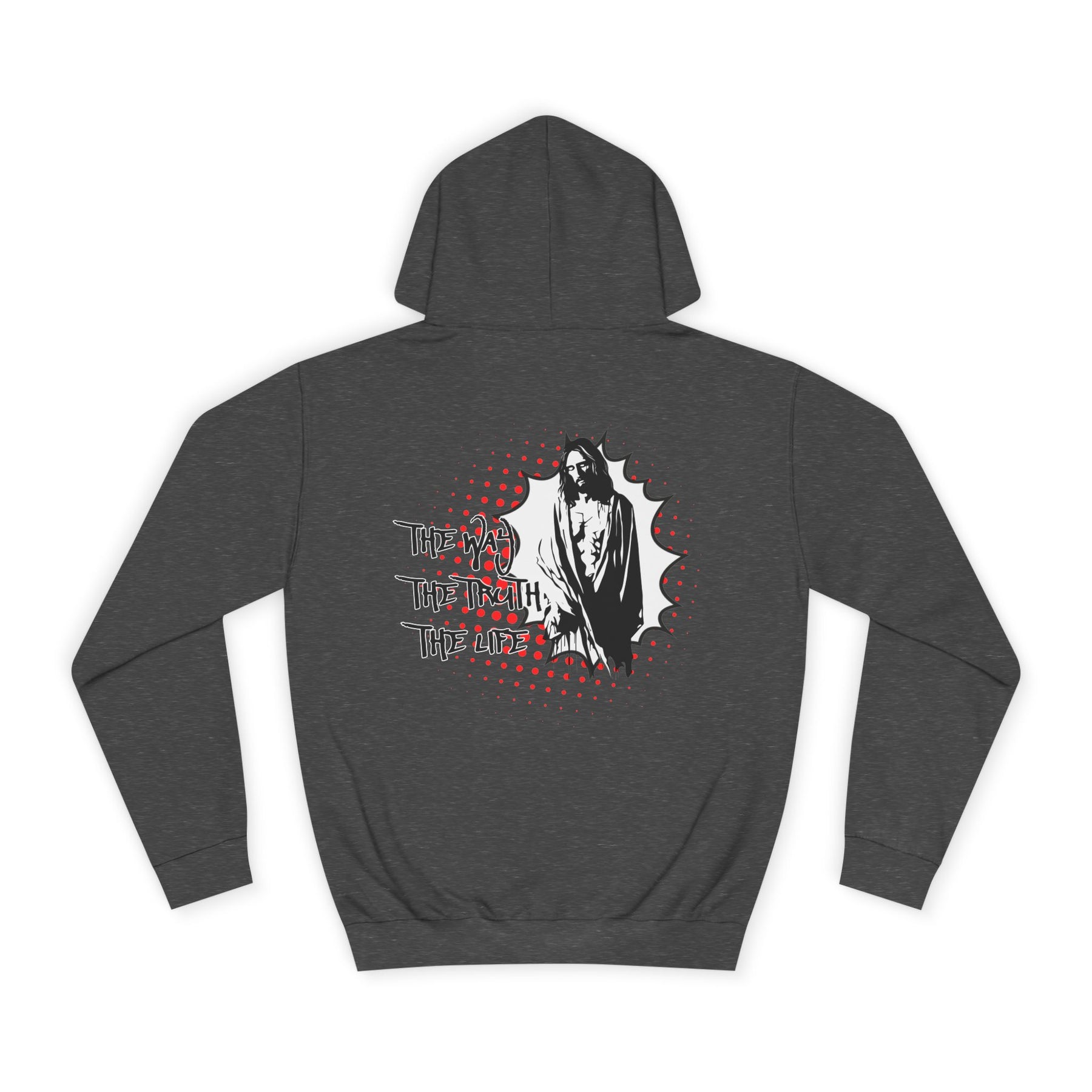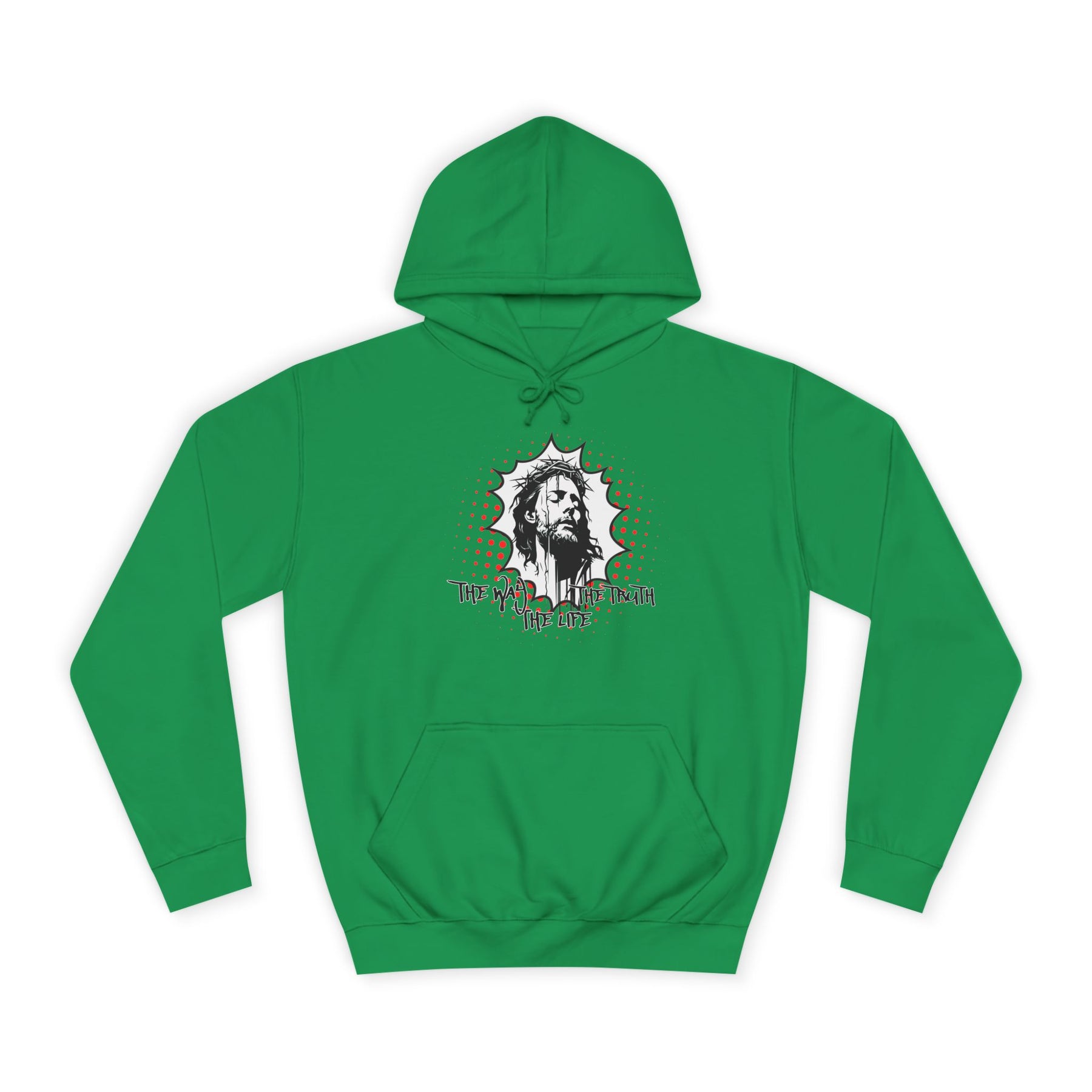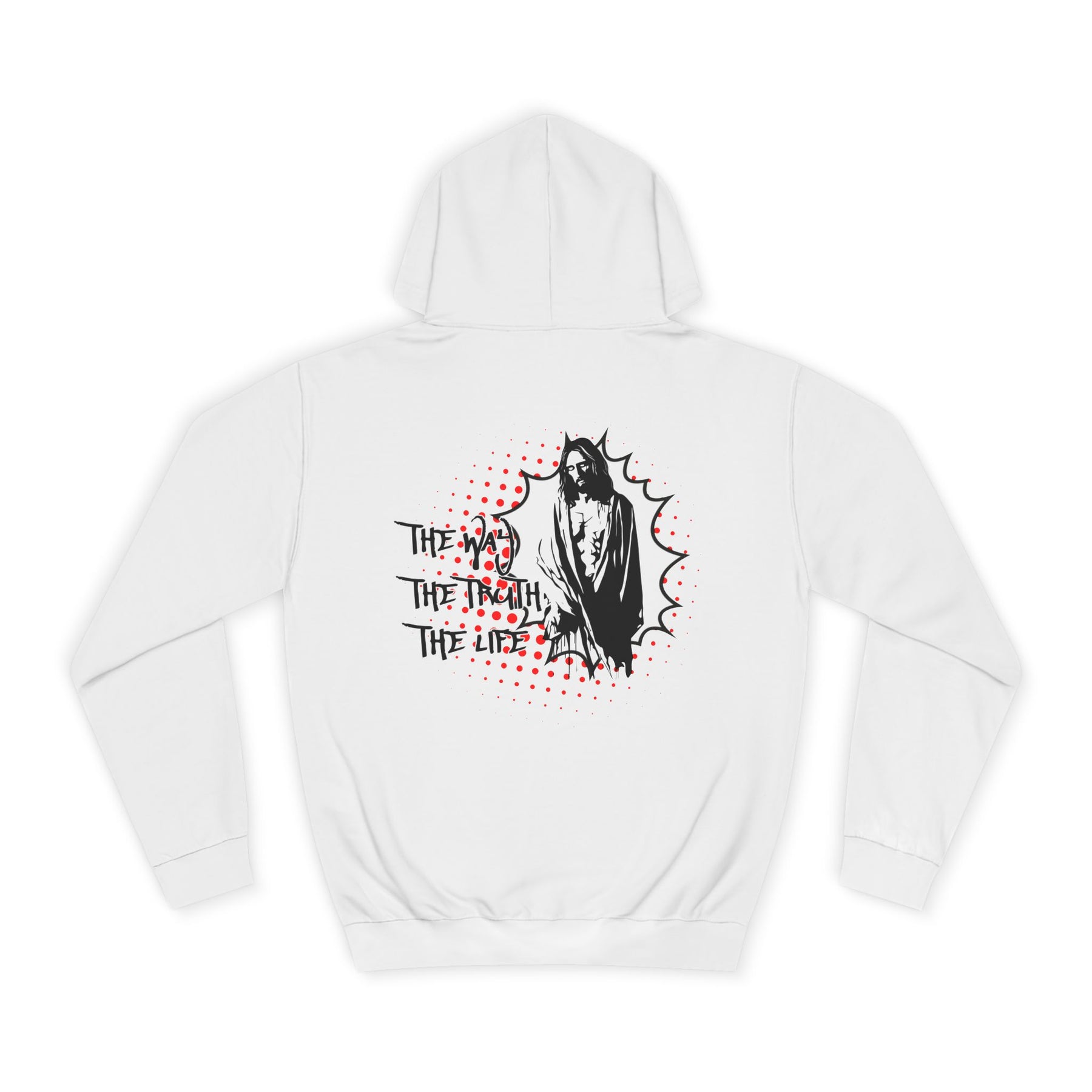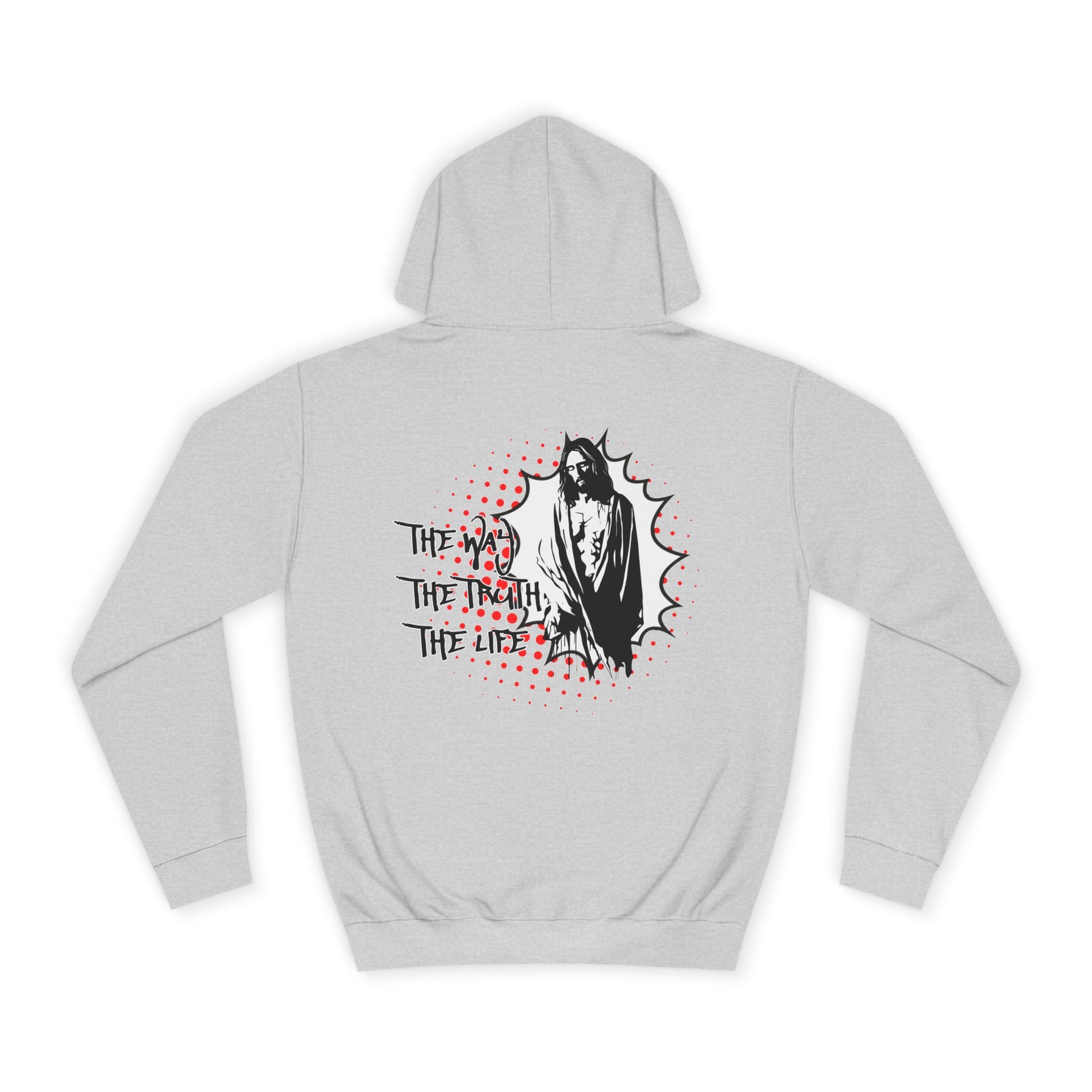 The design features Jesus with a crown of thorns in a modern streetwear style, combined with the message “The Way, The Truth, The Life”.