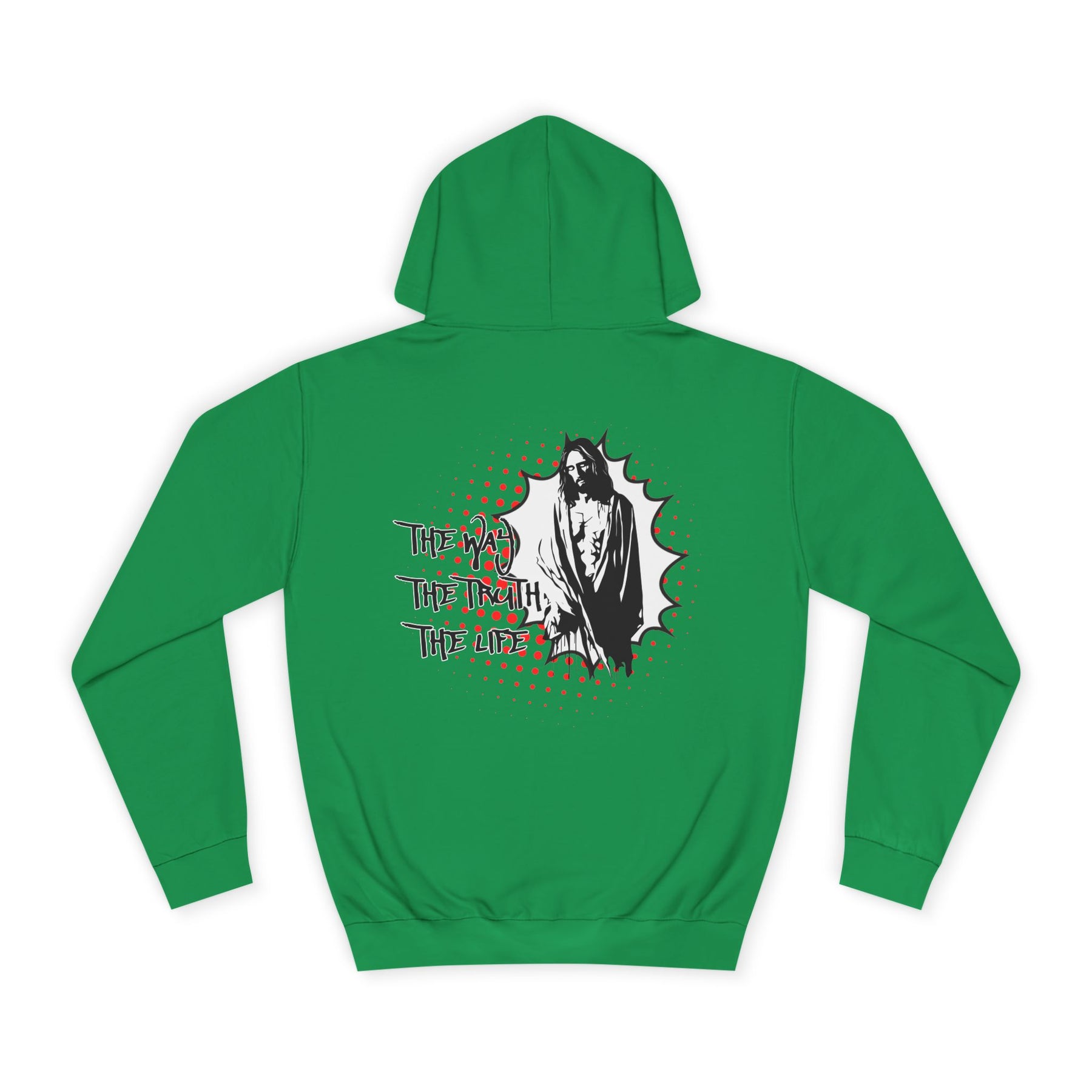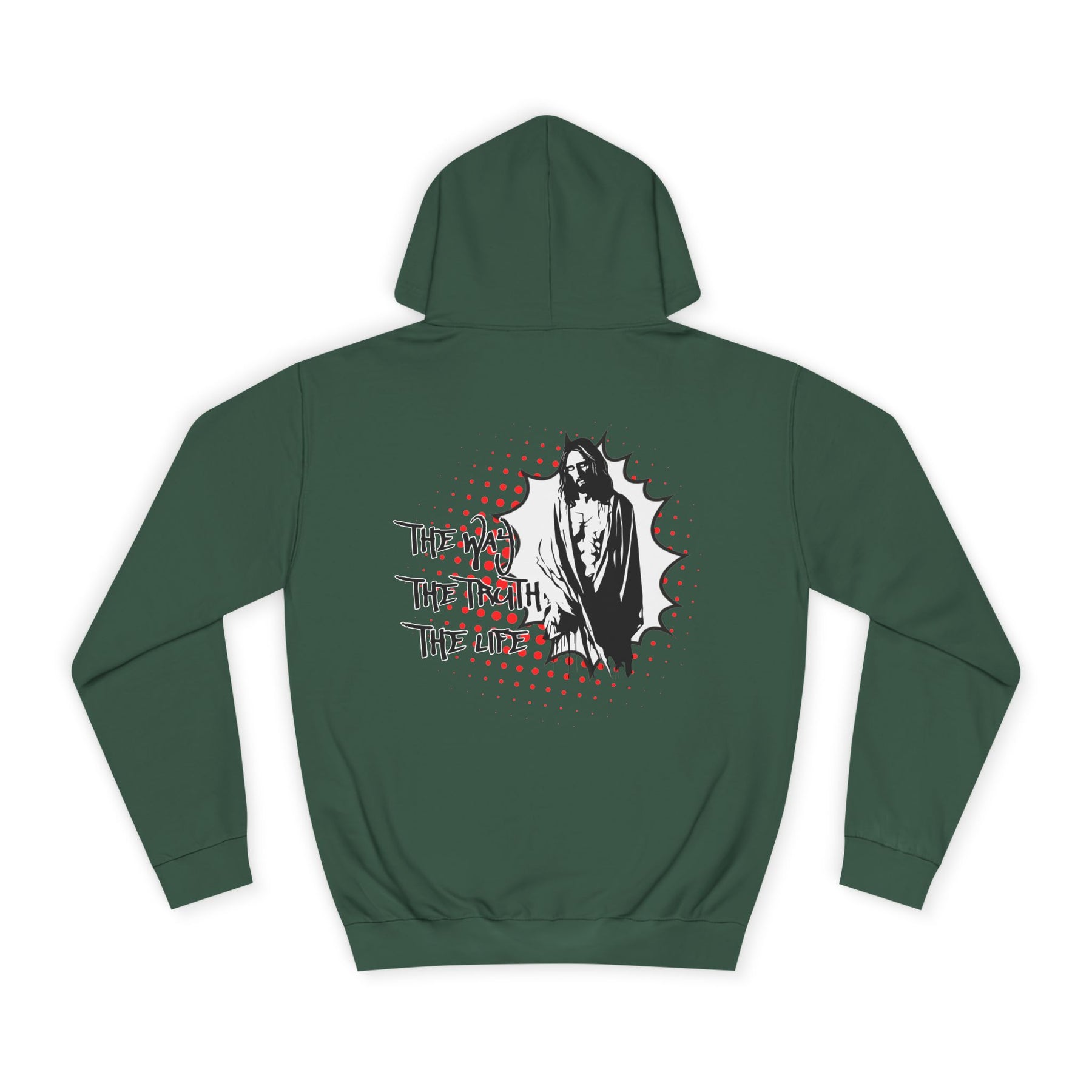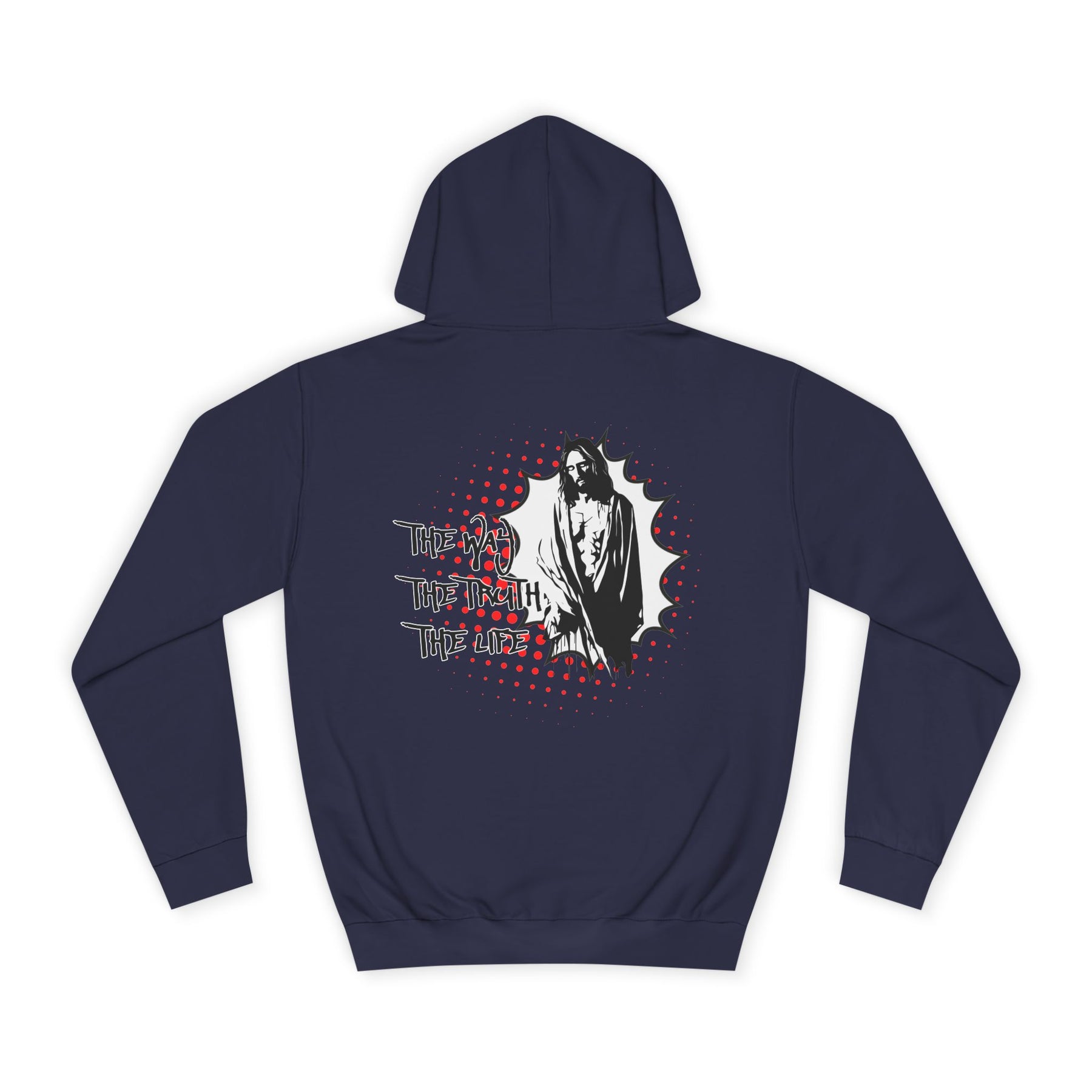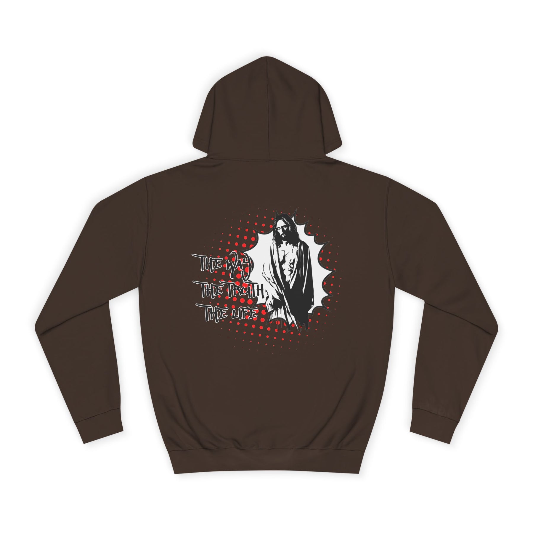 The design features Jesus with a crown of thorns in a modern streetwear style, combined with the message “The Way, The Truth, The Life”.