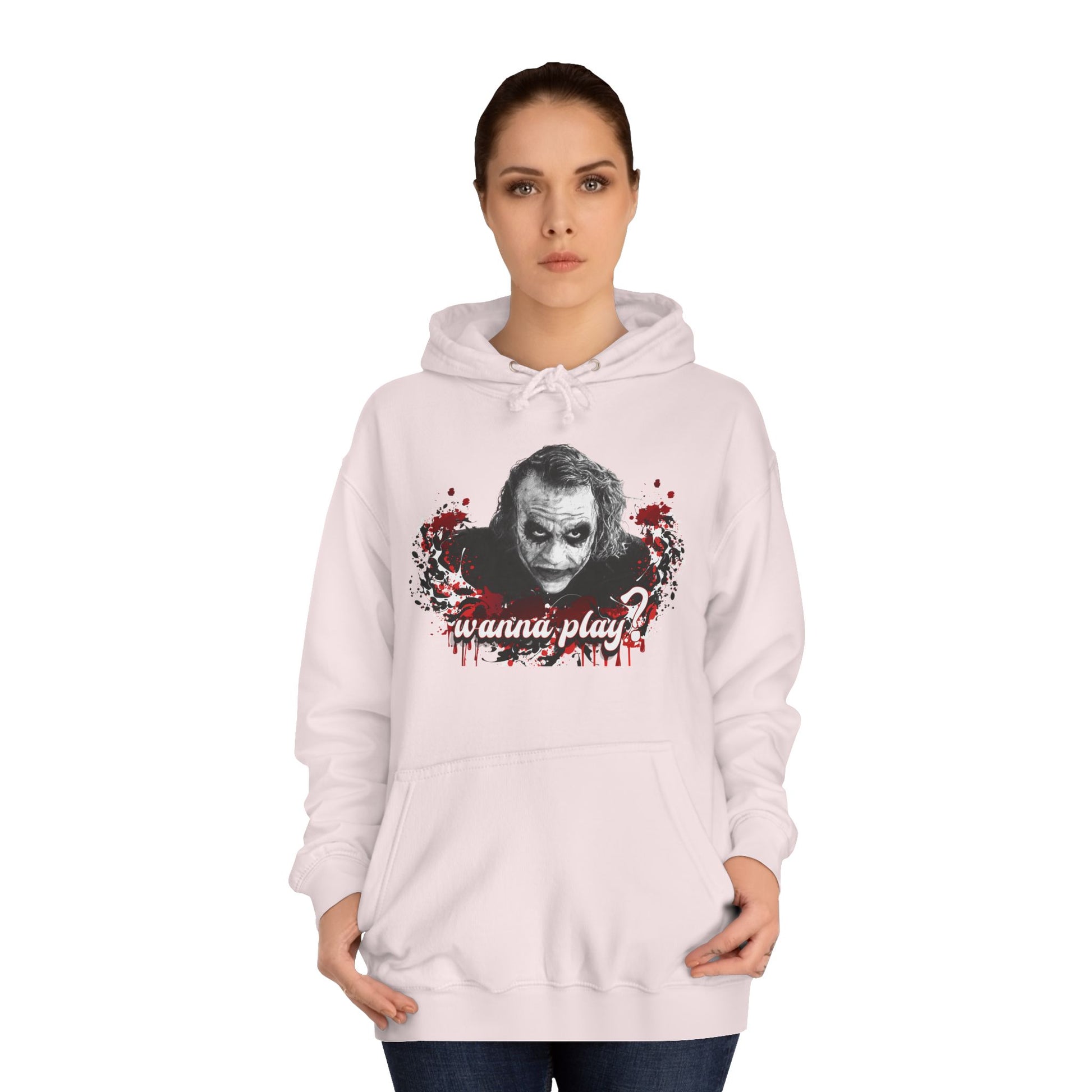 This design is not for the faint-hearted. The dark Joker look, combined with blood-red splatters and the provocative "wanna play?" lettering, makes a statement that combines madness, art, and profound expression. Ideal for those who can master chaosâor at least wear it elegantly.
