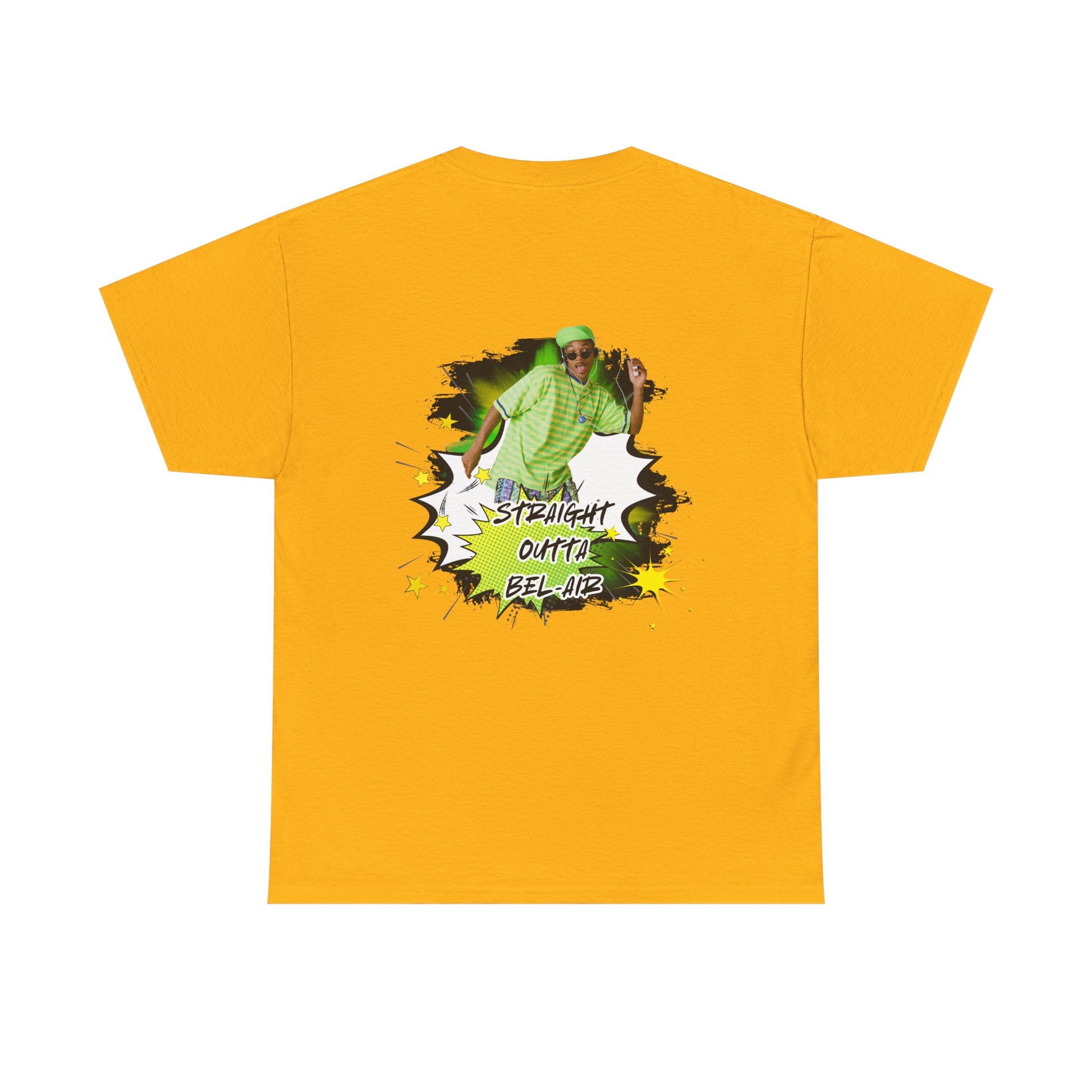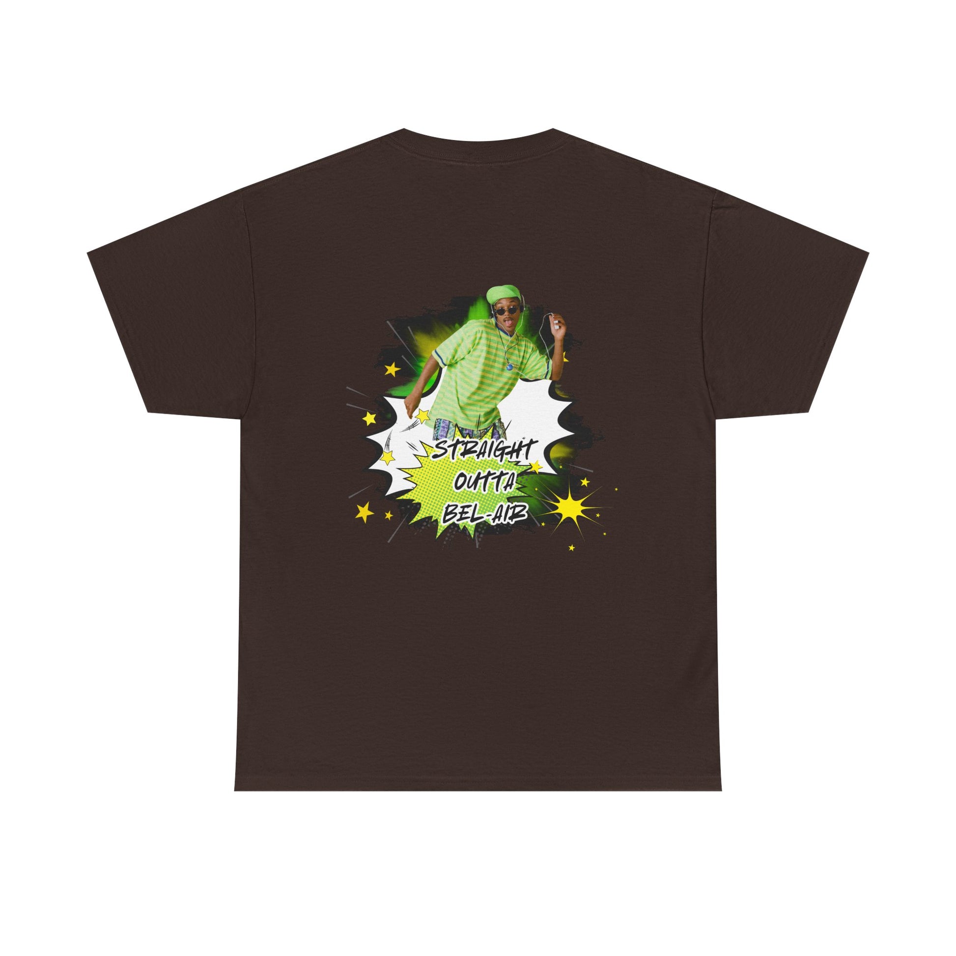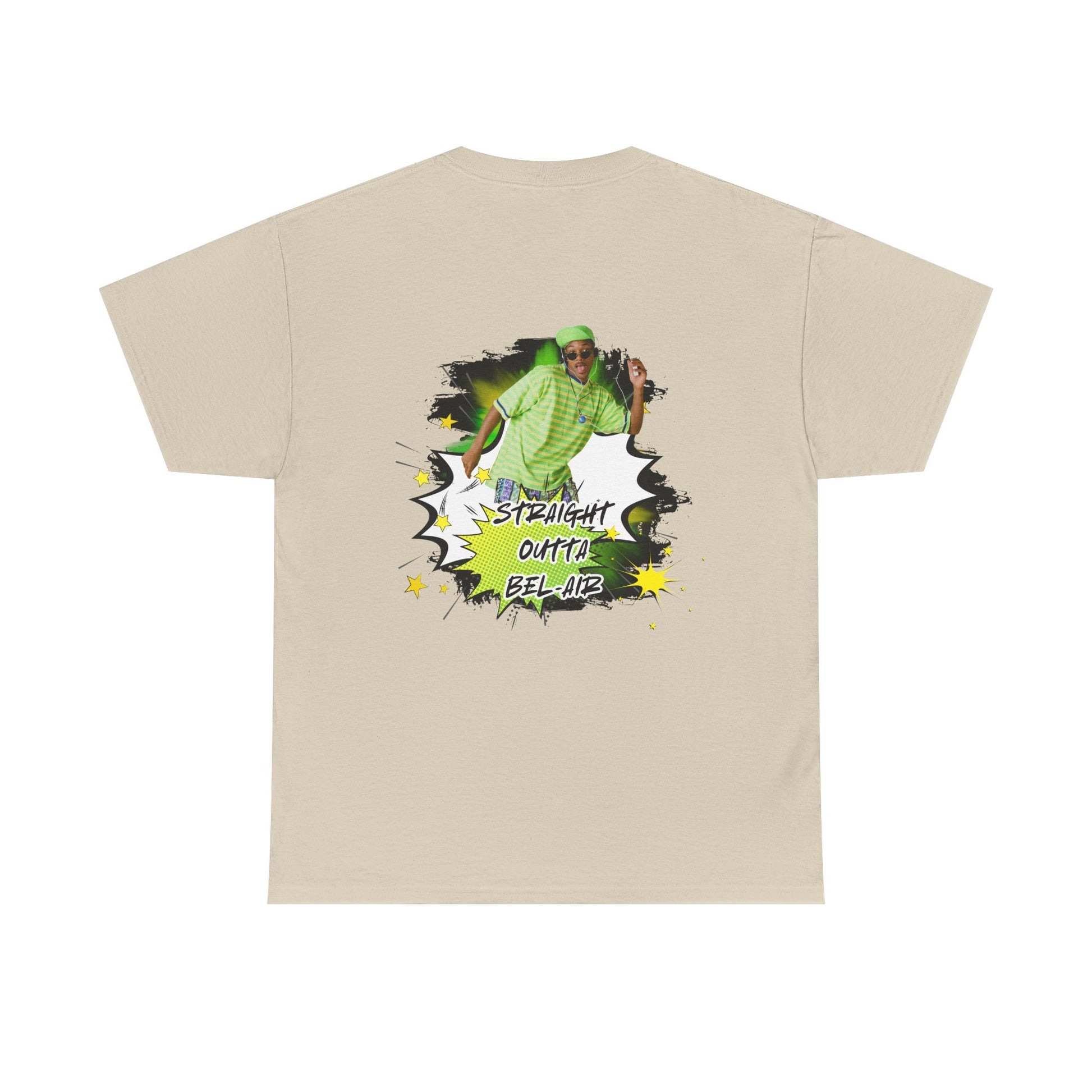 Hol dir den 90s-Kult direkt in deinen Kleiderschrank! Auf der Vorderseite strahlt die gesamte Fresh-Prince-Crew im bunten Comic-Design – auf der Rückseite sorgt Will Smith alias The Fresh Prince mit „Straight Outta Bel-Air“ für das perfekte Statement.