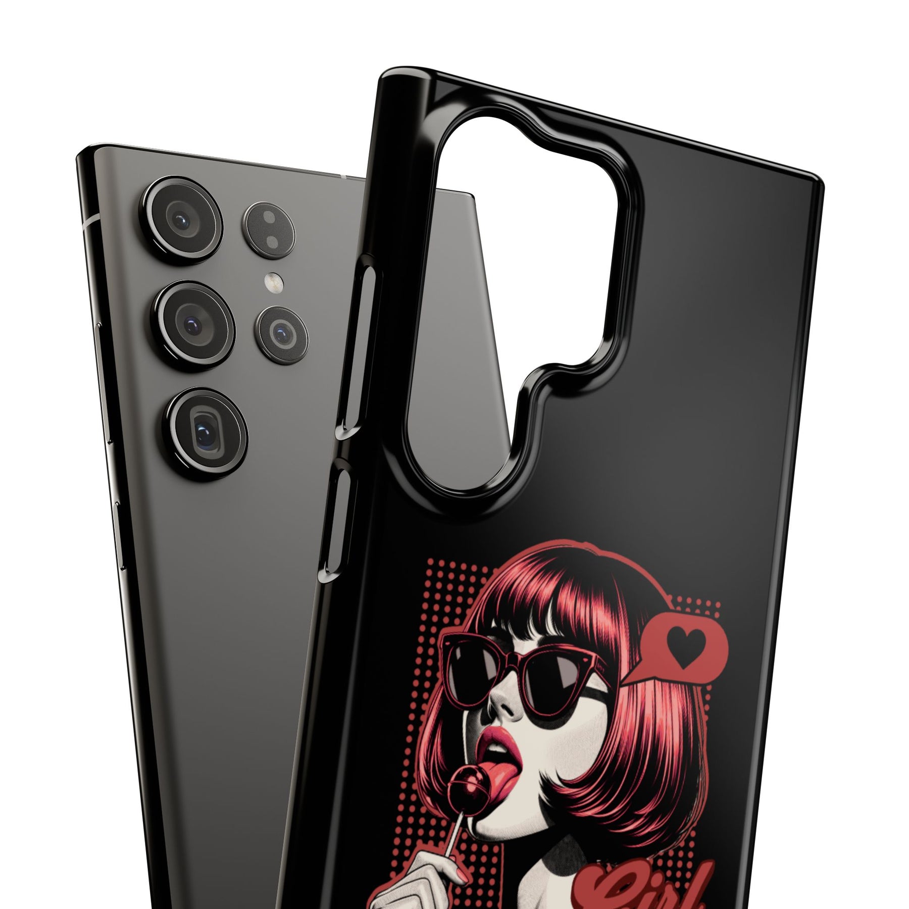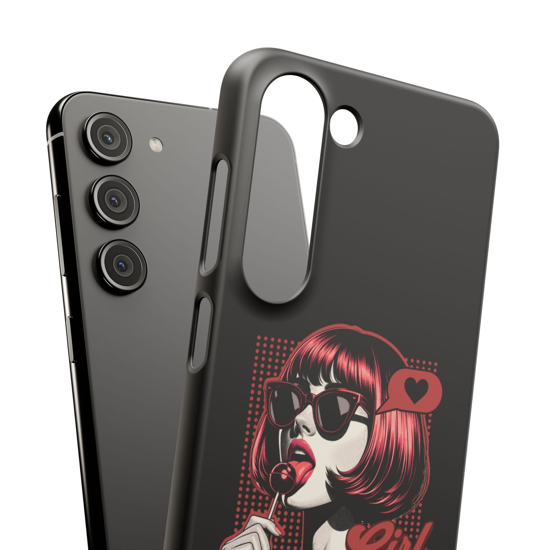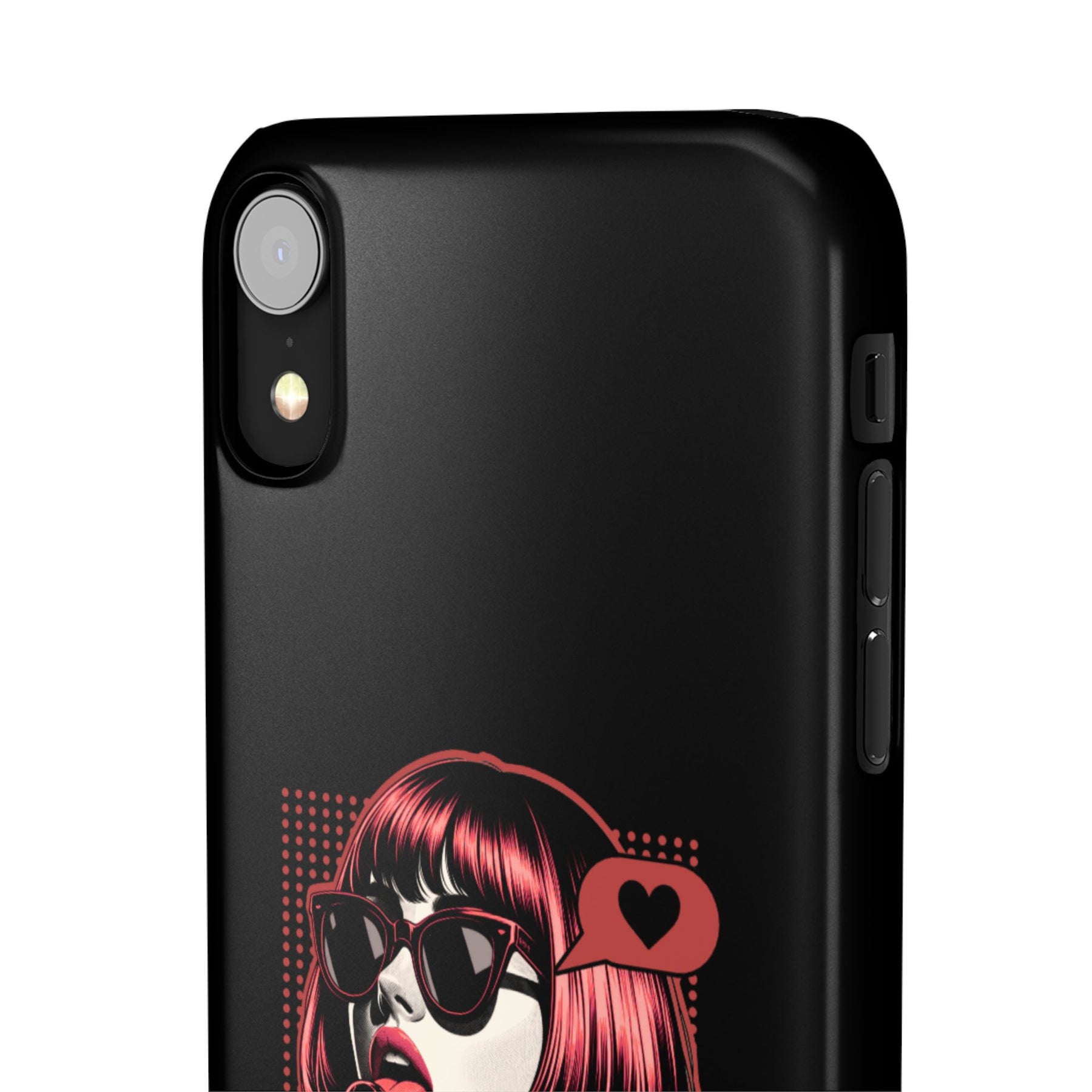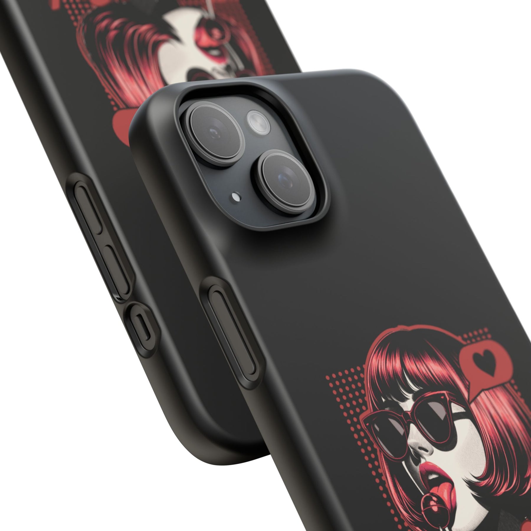 Pop-Art trifft Coolness: Diese Hülle ist ein Statement für starke Frauen mit Retro-Vibes. Die coole Lady mit Sonnenbrille, knallrotem Bob und Lolli bringt Attitüde in deine Handtasche – oder Hosentasche. Ideal für alle, die Vintage-Ästhetik und moderne Power lieben.