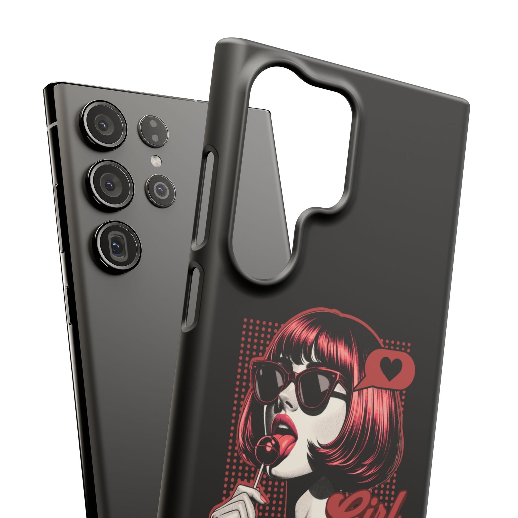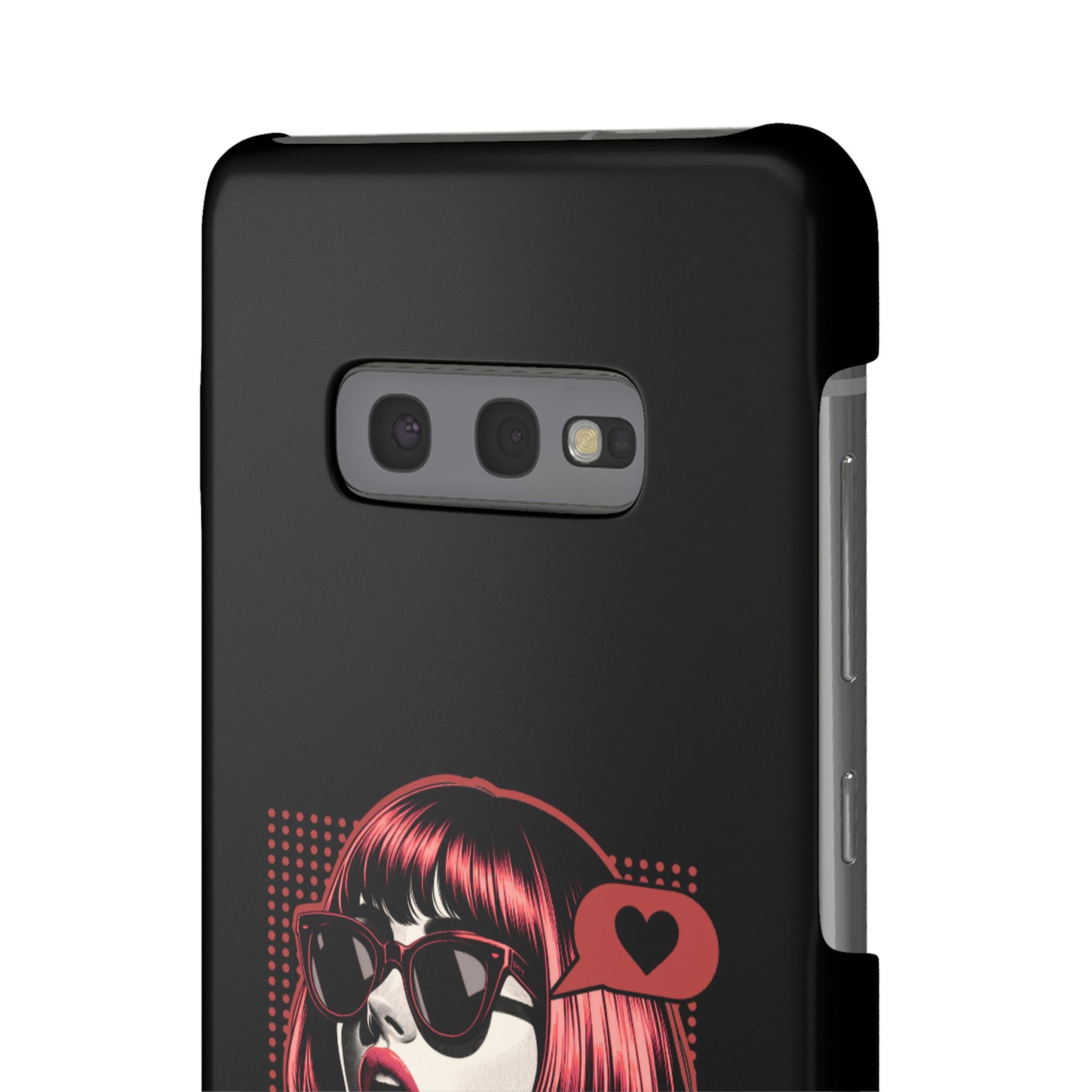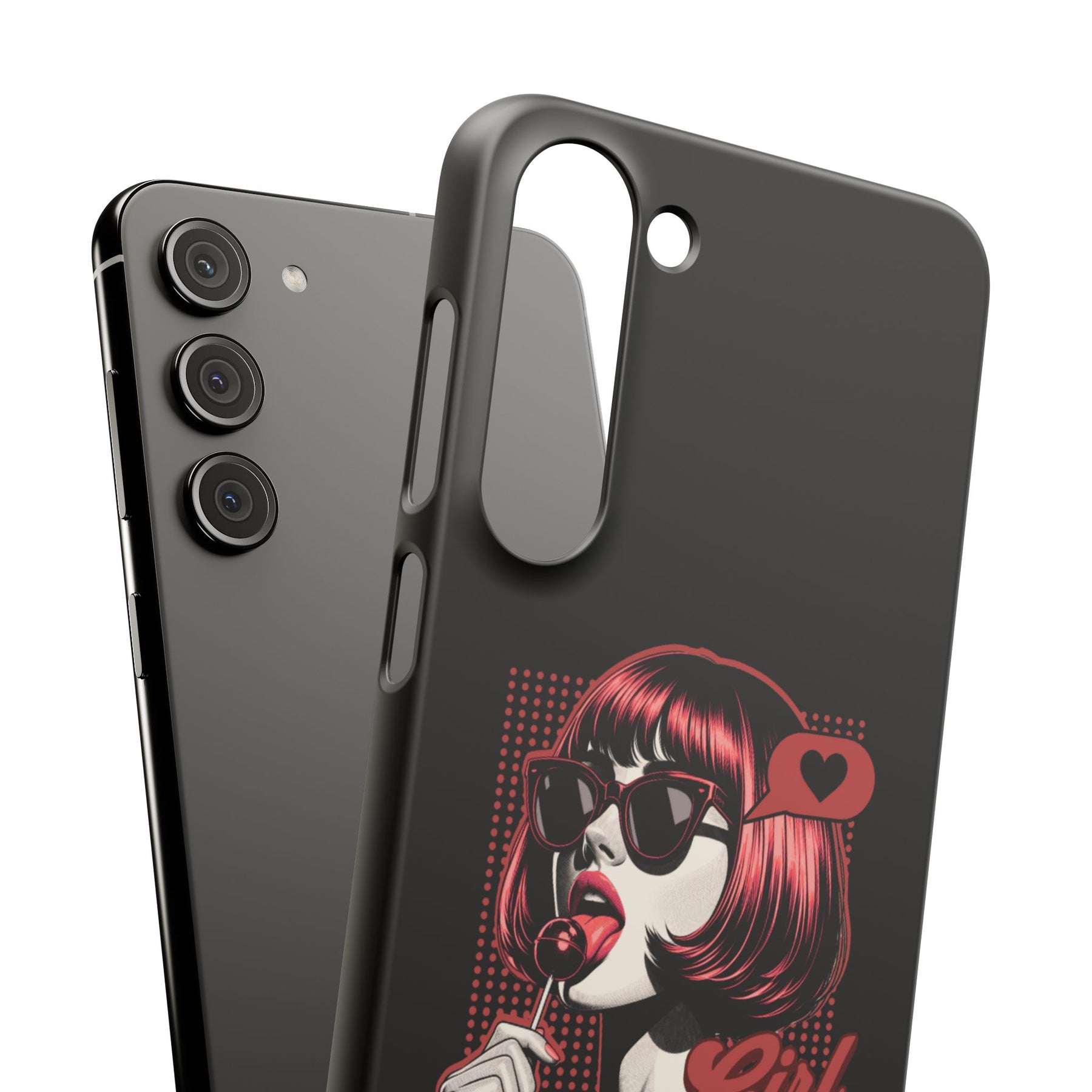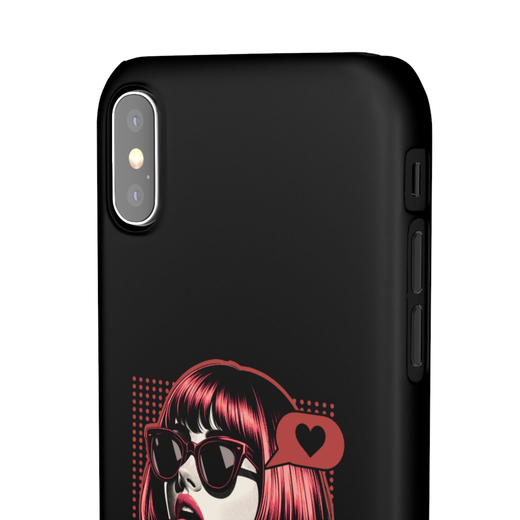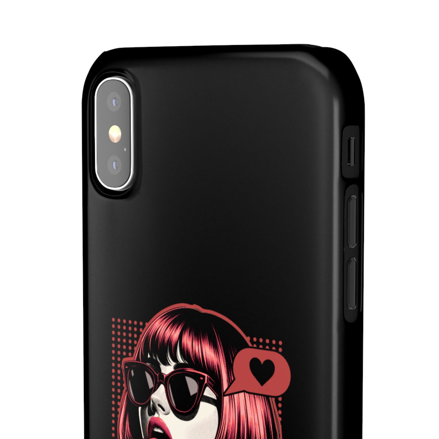 Pop-Art trifft Coolness: Diese Hülle ist ein Statement für starke Frauen mit Retro-Vibes. Die coole Lady mit Sonnenbrille, knallrotem Bob und Lolli bringt Attitüde in deine Handtasche – oder Hosentasche. Ideal für alle, die Vintage-Ästhetik und moderne Power lieben.