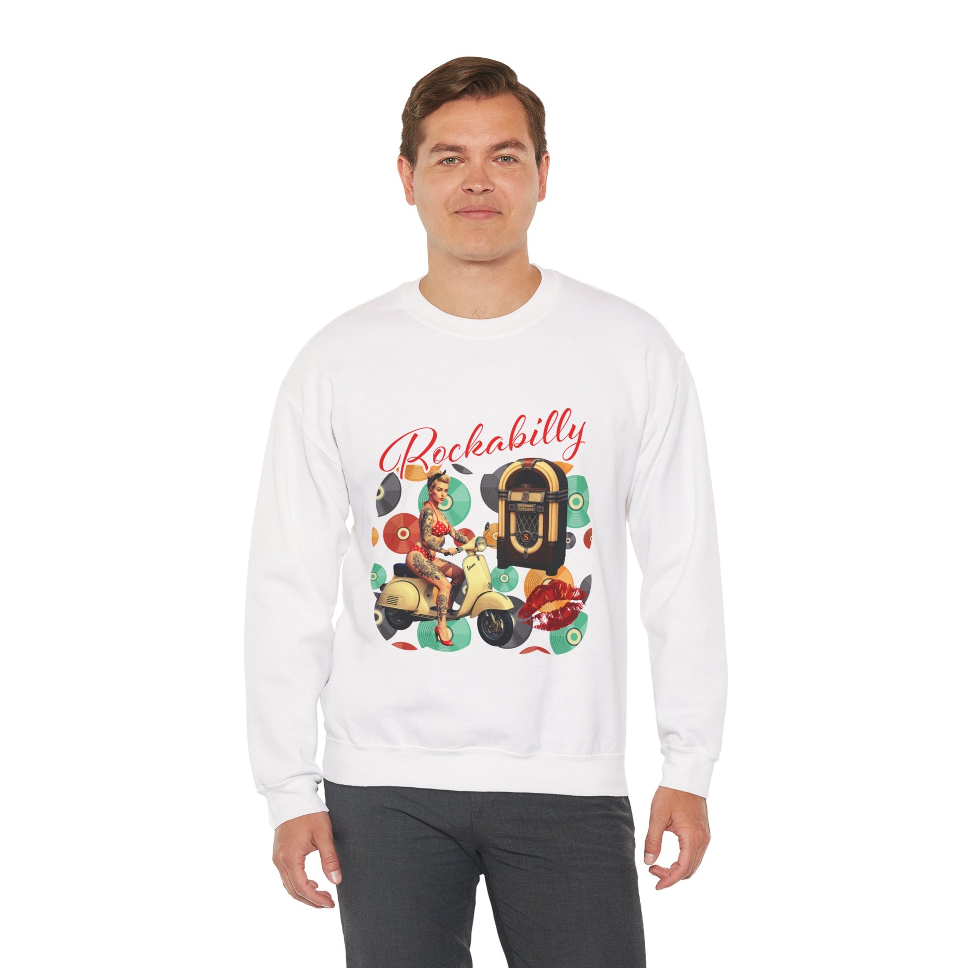 Introducing our cozy and stylish Unisex Heavy Blend⢠Crewneck Sweatshirt, designed to elevate your casual wardrobe. This sweatshirt brings a classic vibe with its clean-cut style and comfy fit, making it perfect for layering or wearing on its own. The vibrant Rockabilly design captures a retro-inspired feel, perfect for those who appreciate vintage aesthetics. Ideal for everyday wear or special occasions, this sweatshirt is a great gift for music lovers, rockabilly enthusiasts, or anyone looking to add a touch of flair to their outfit. Wear it during the chilly fall days, cozy winter nights, or while celebrating retro-themed events and parties. It's also a thoughtful choice for holidays such as Christmas, Halloween, or birthdays, ensuring you or your loved ones stay stylish and warm.
