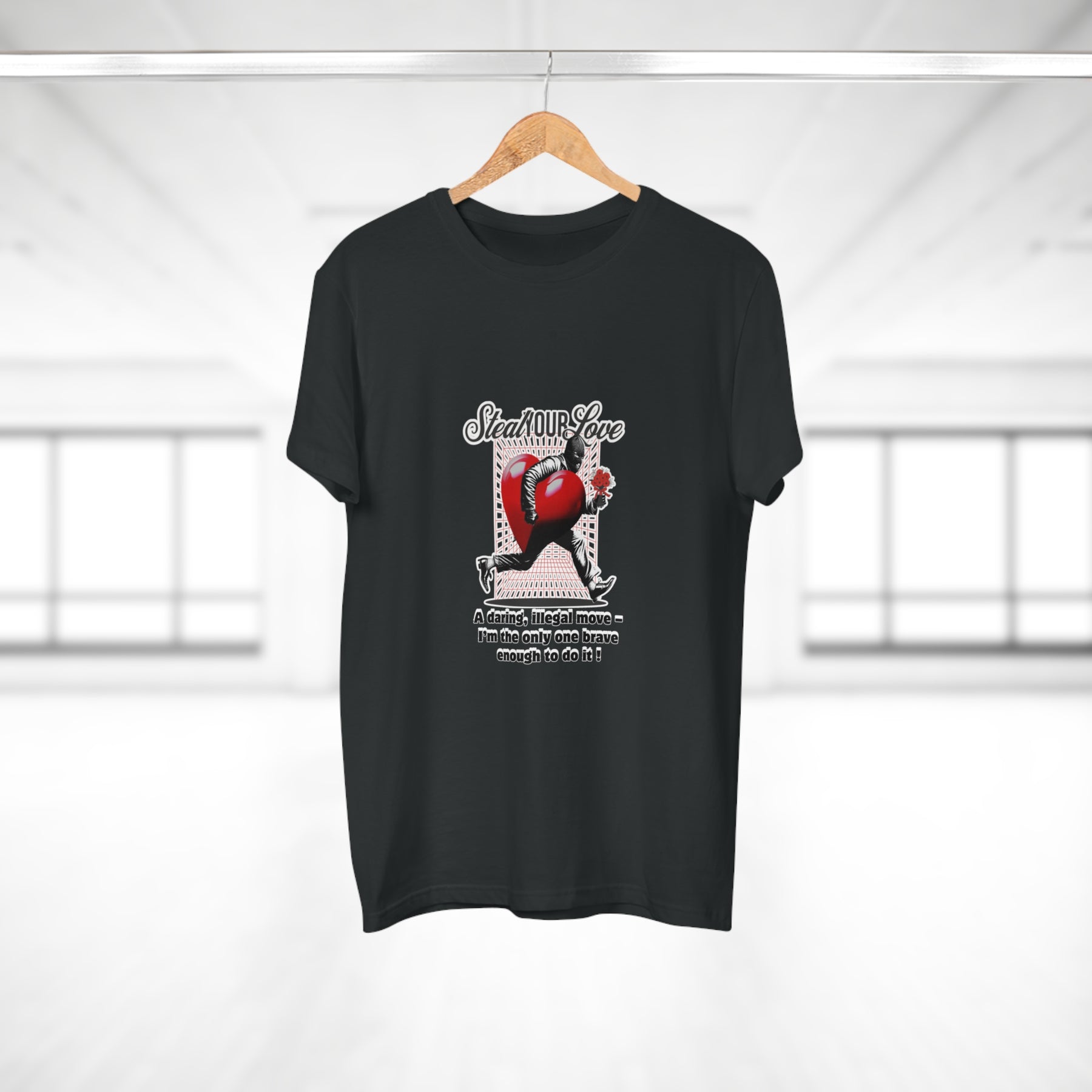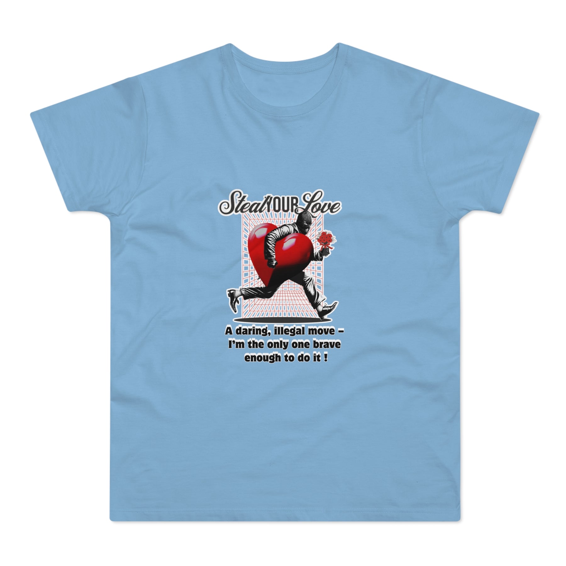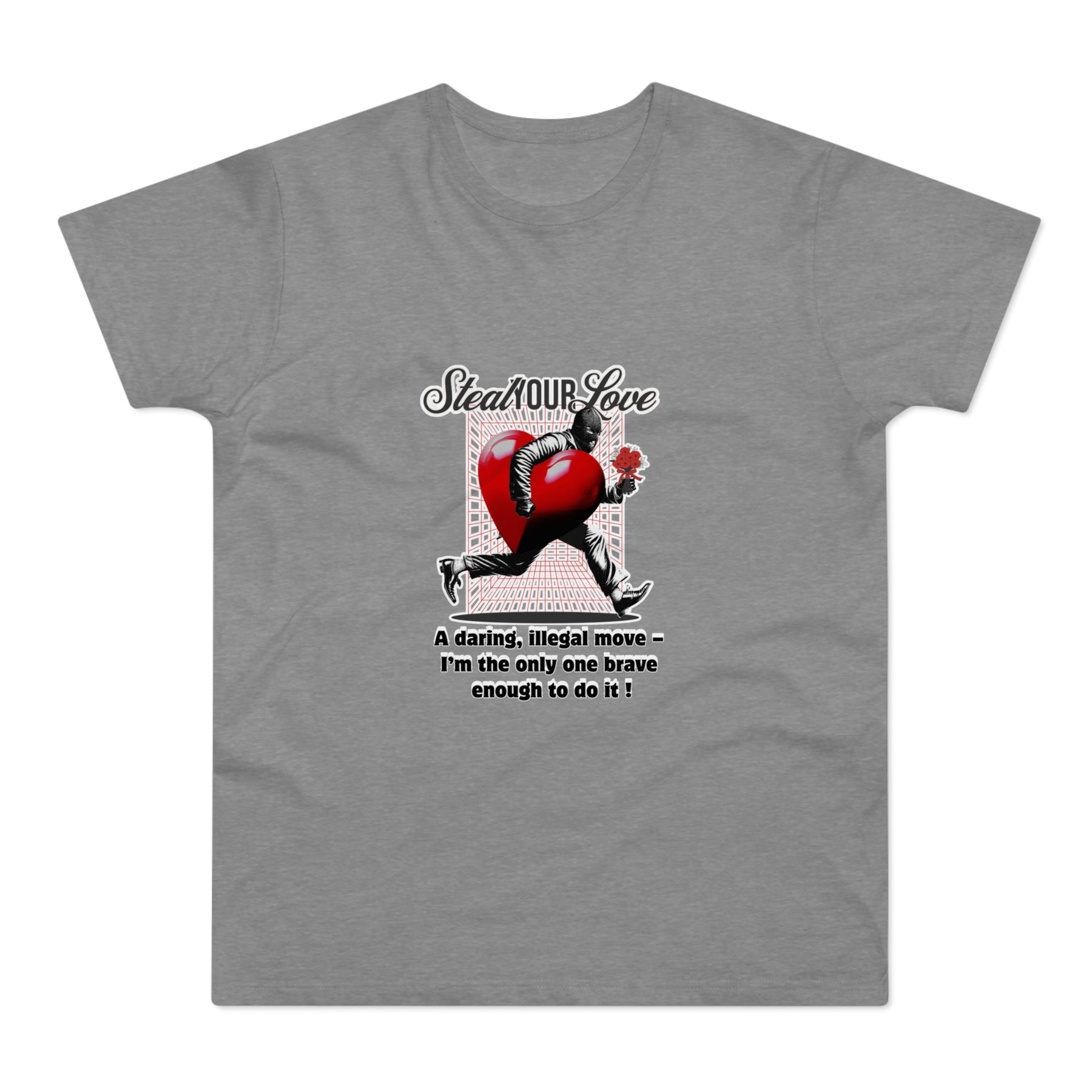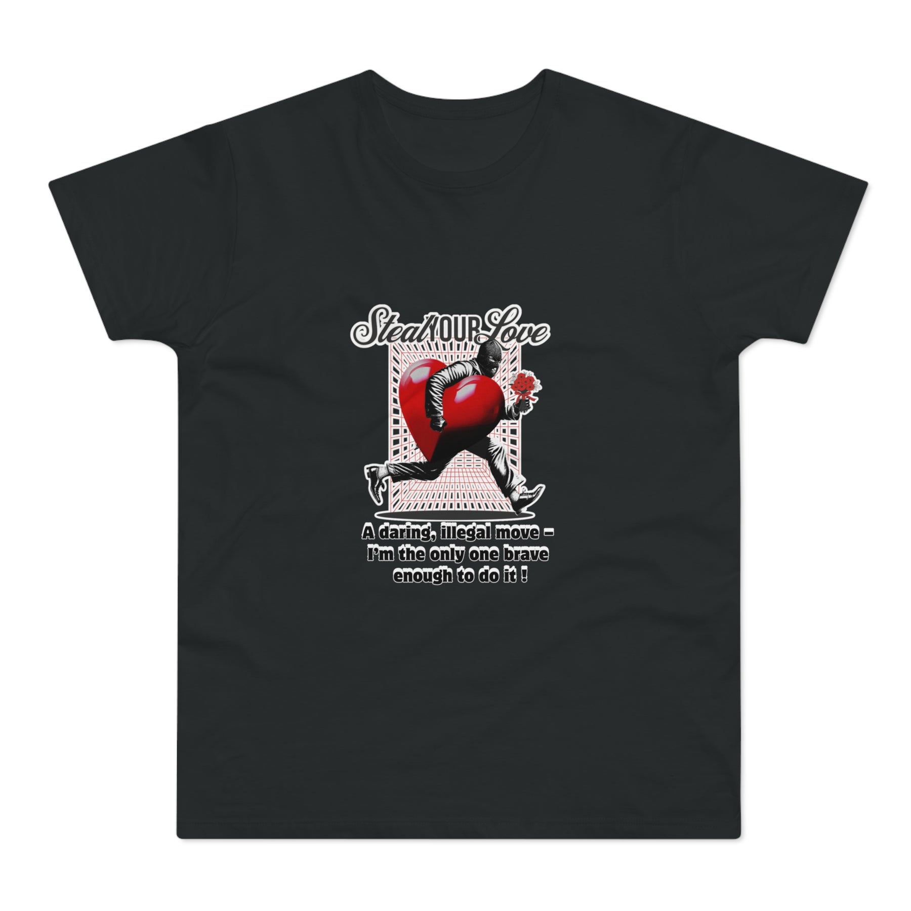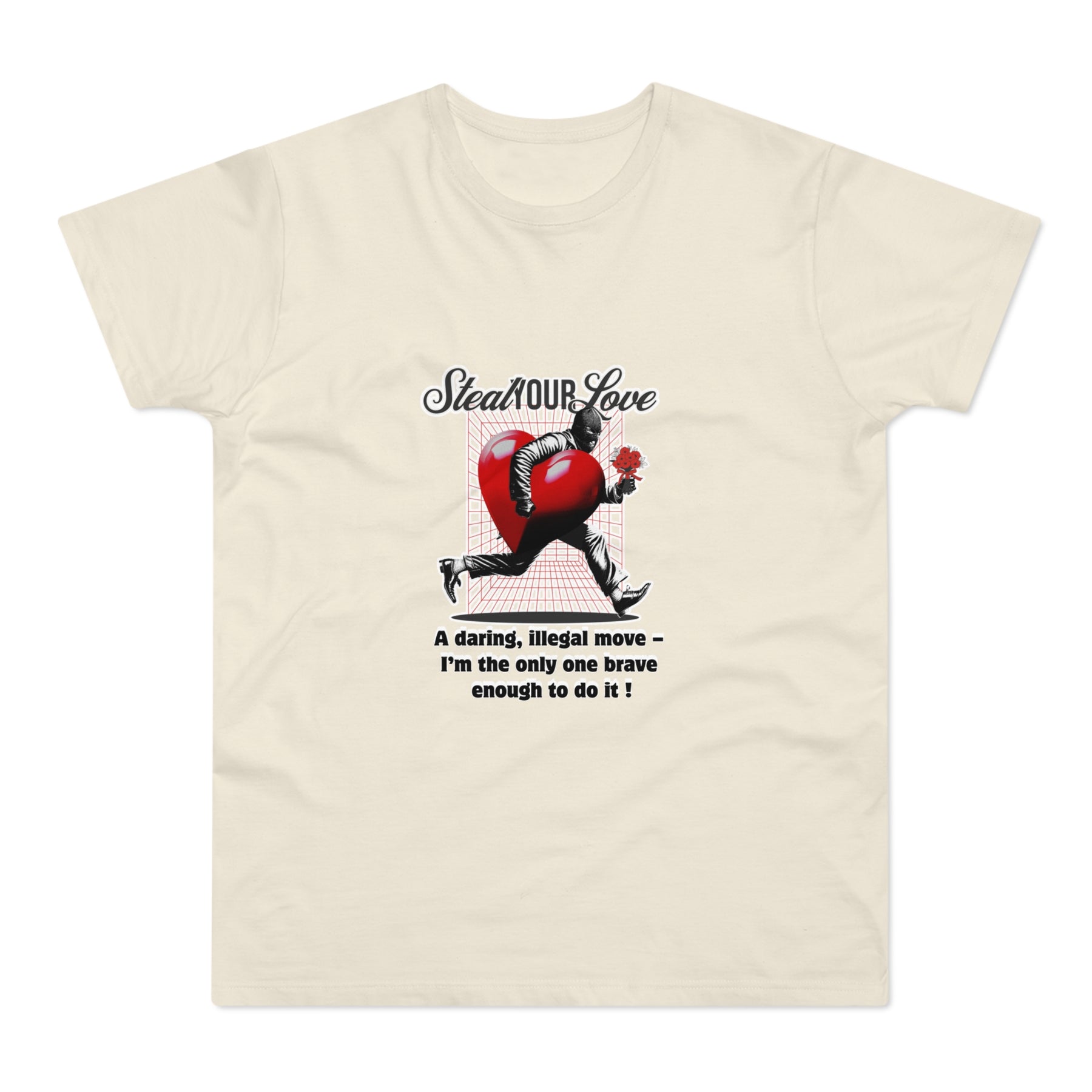 A cheeky crime of the heart: This shirt tells the story of someone brave enough to risk it all for love. The heart thief with a flower captures charm, wit, and a touch of rebellion. A perfect design for anyone who believes that true love is worth the risk – and maybe even a little mischief.