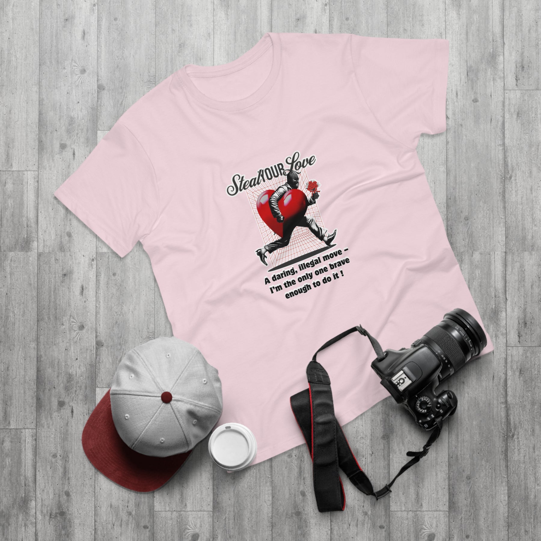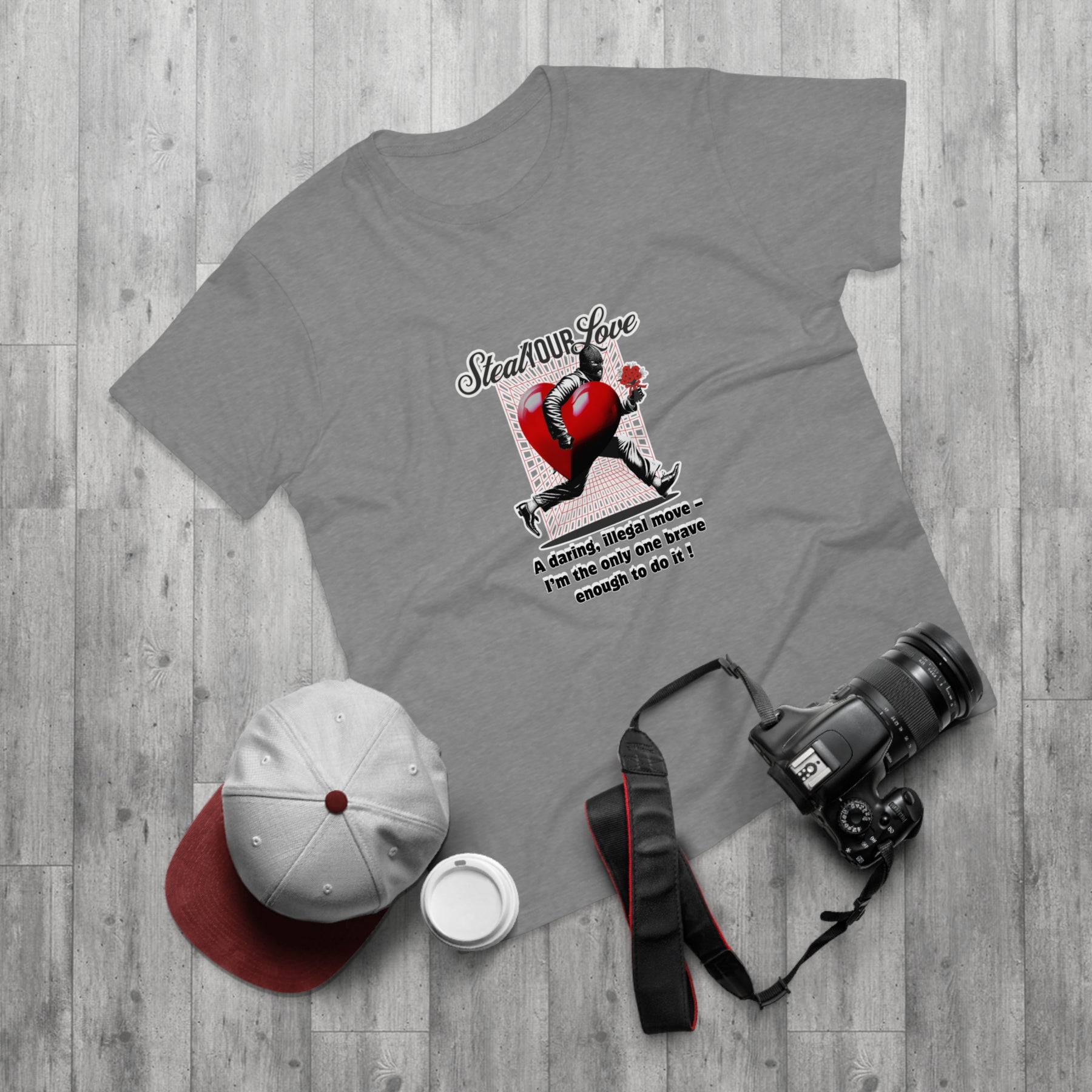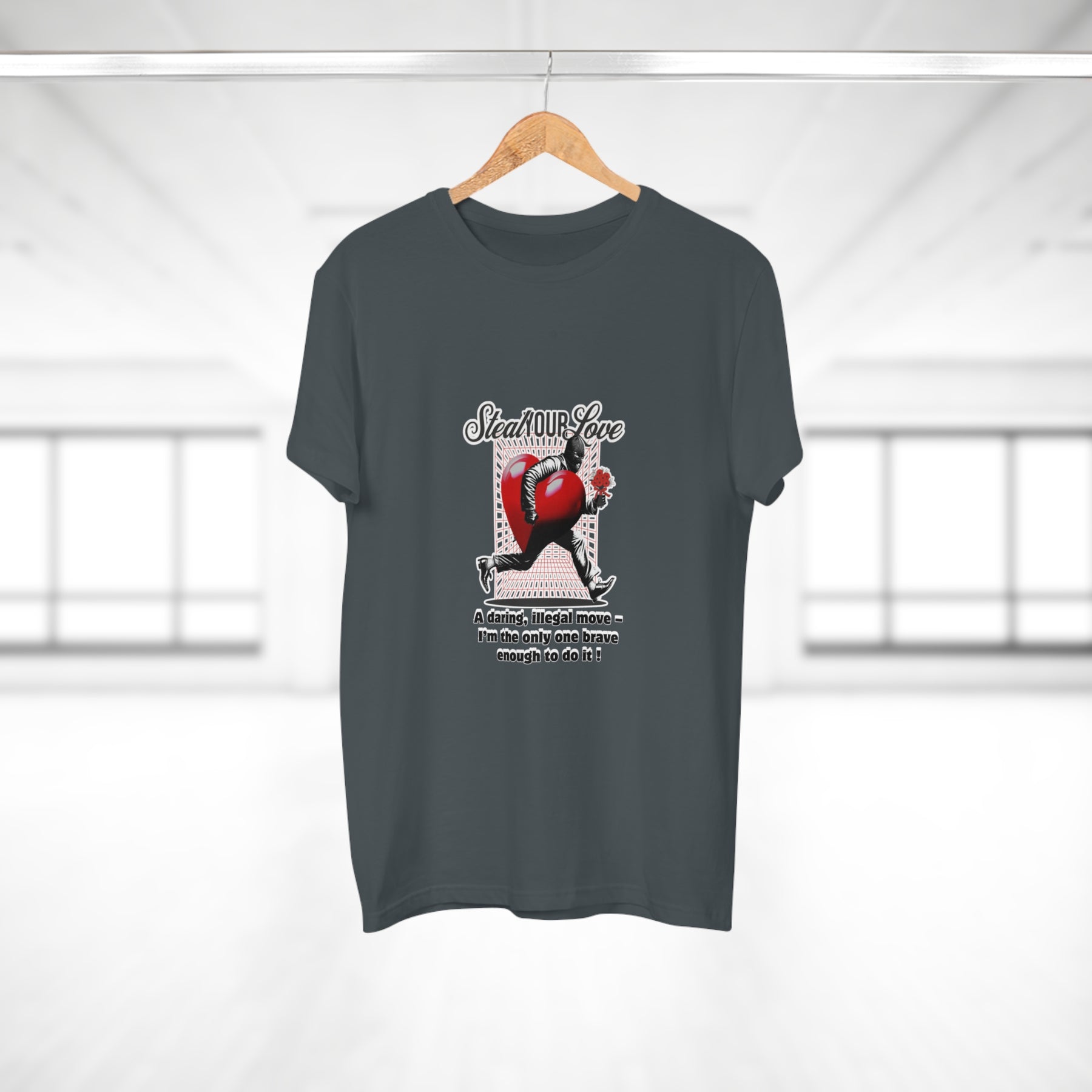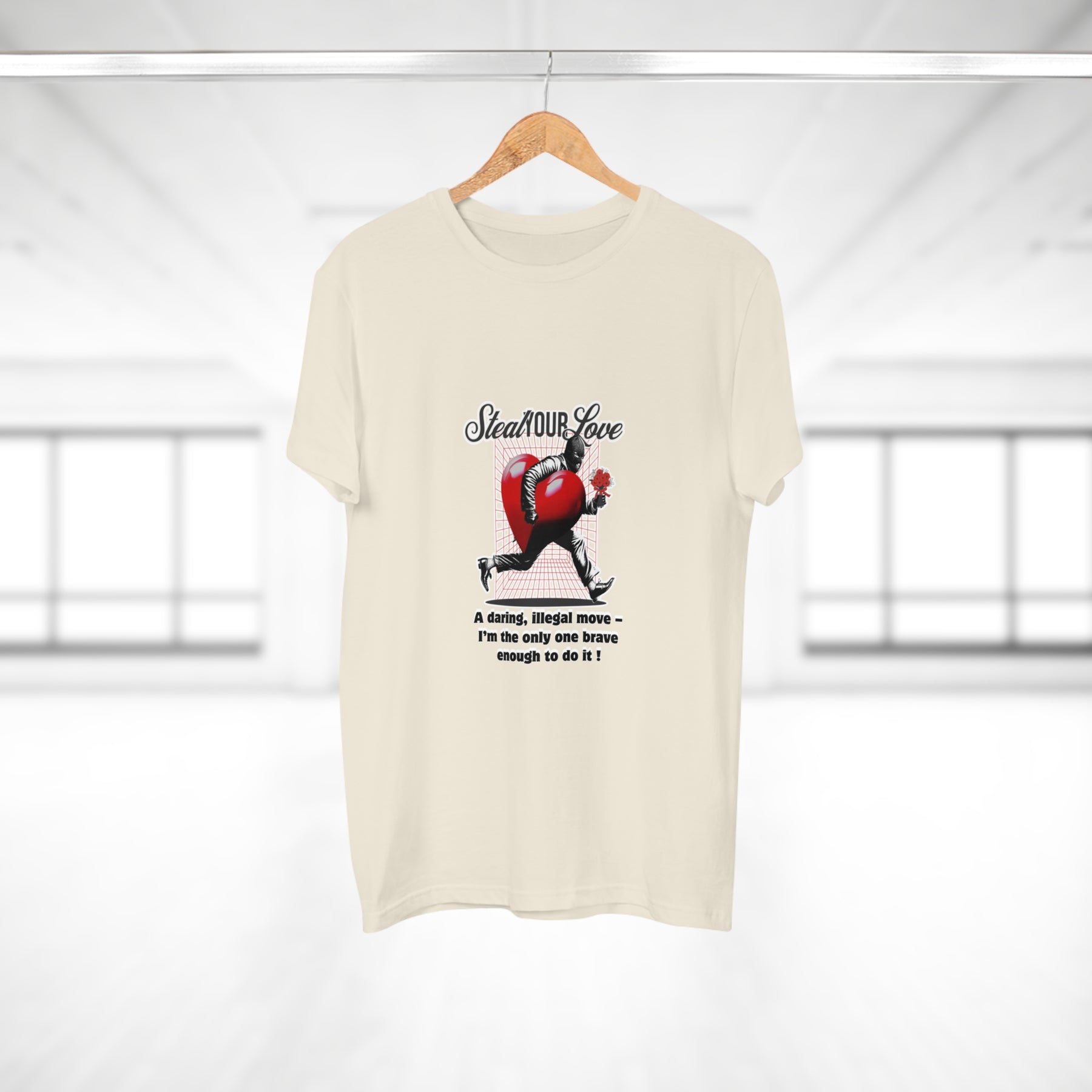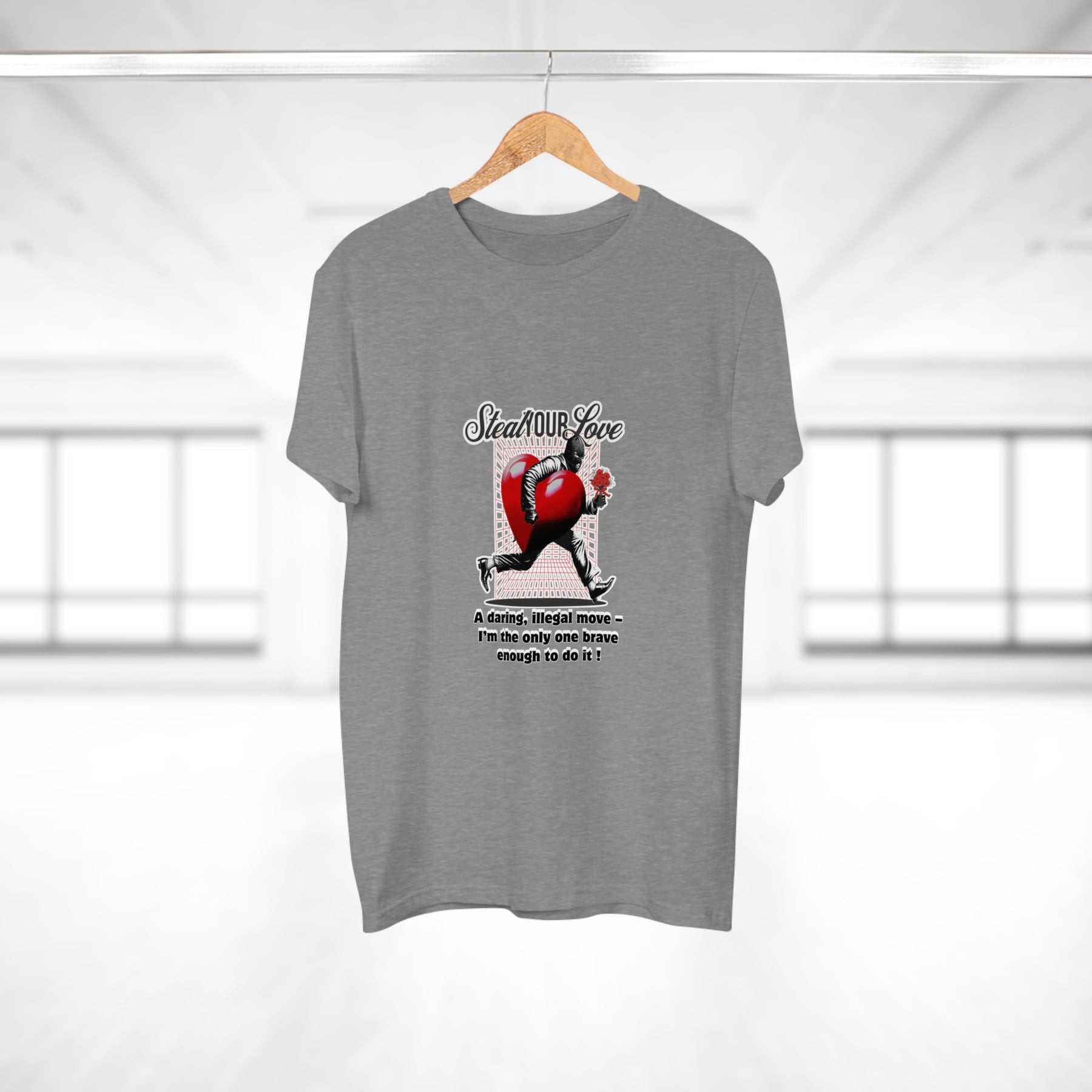 A cheeky crime of the heart: This shirt tells the story of someone brave enough to risk it all for love. The heart thief with a flower captures charm, wit, and a touch of rebellion. A perfect design for anyone who believes that true love is worth the risk – and maybe even a little mischief.