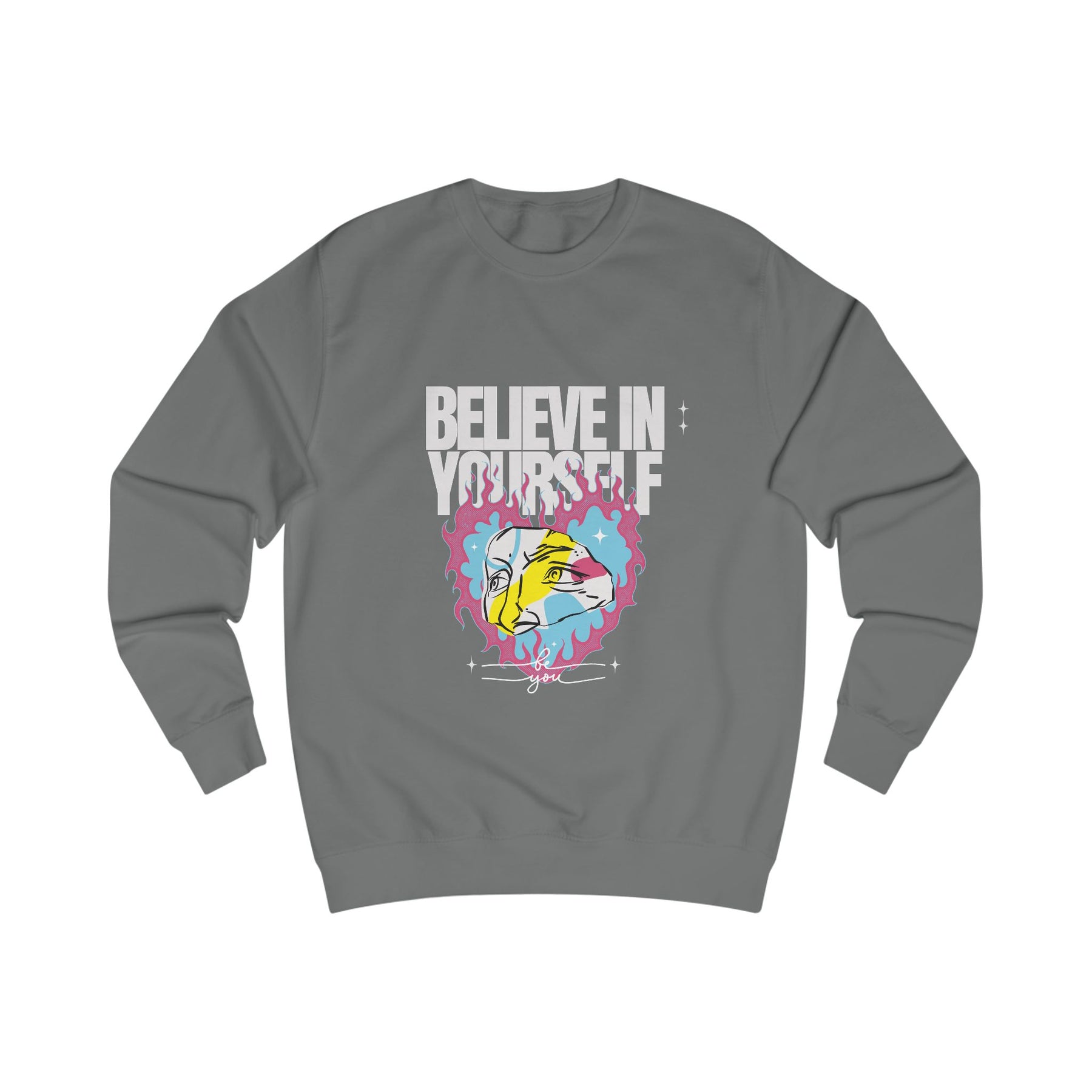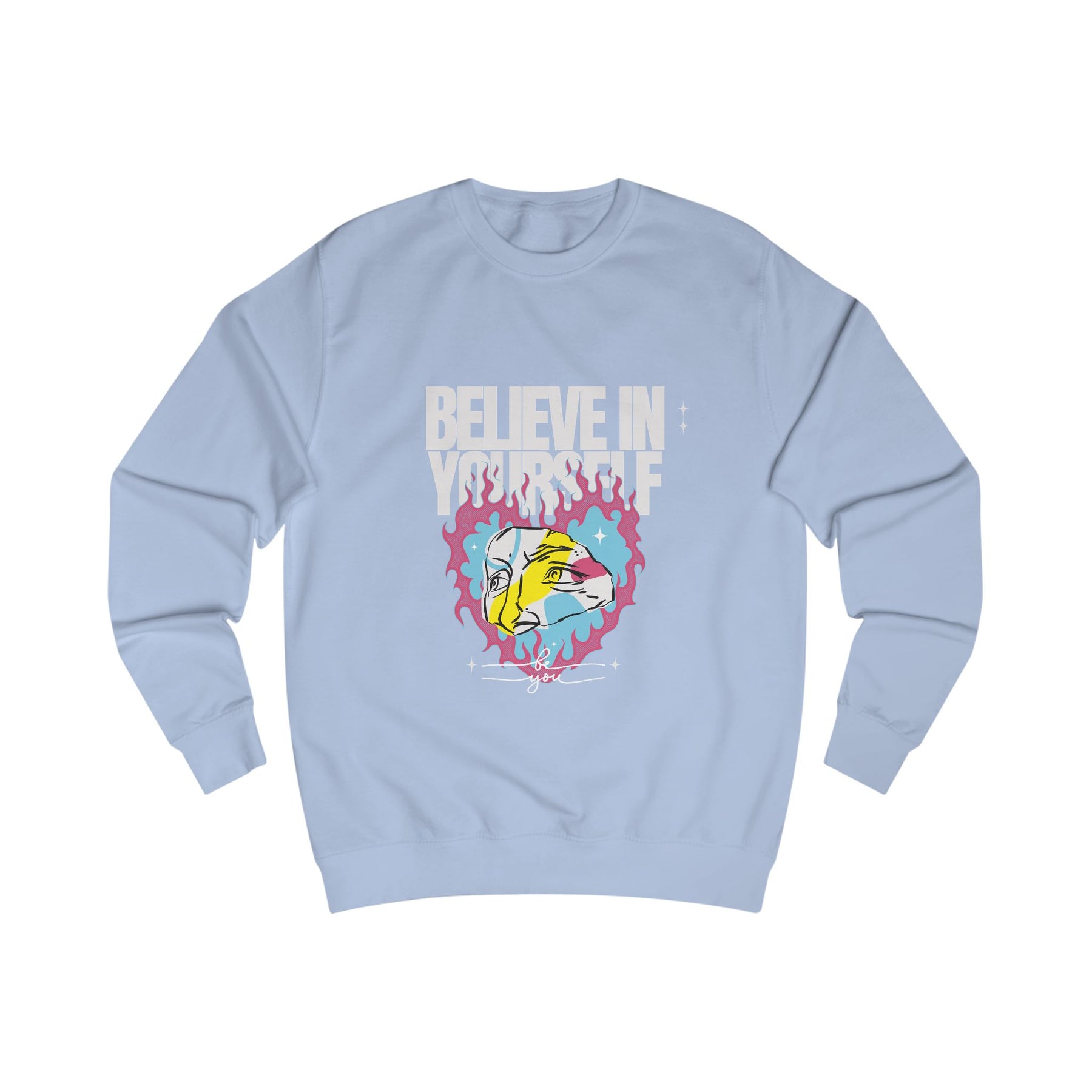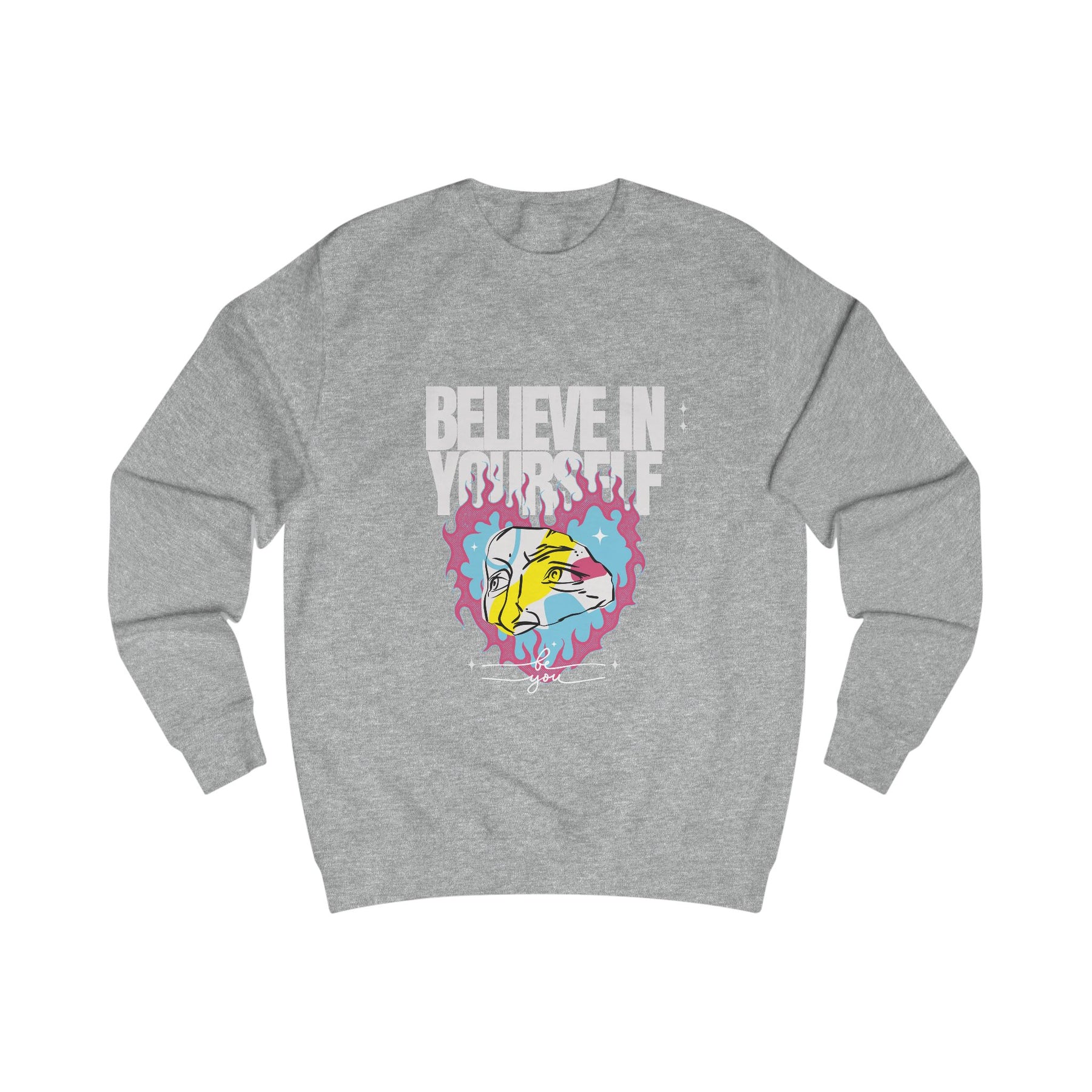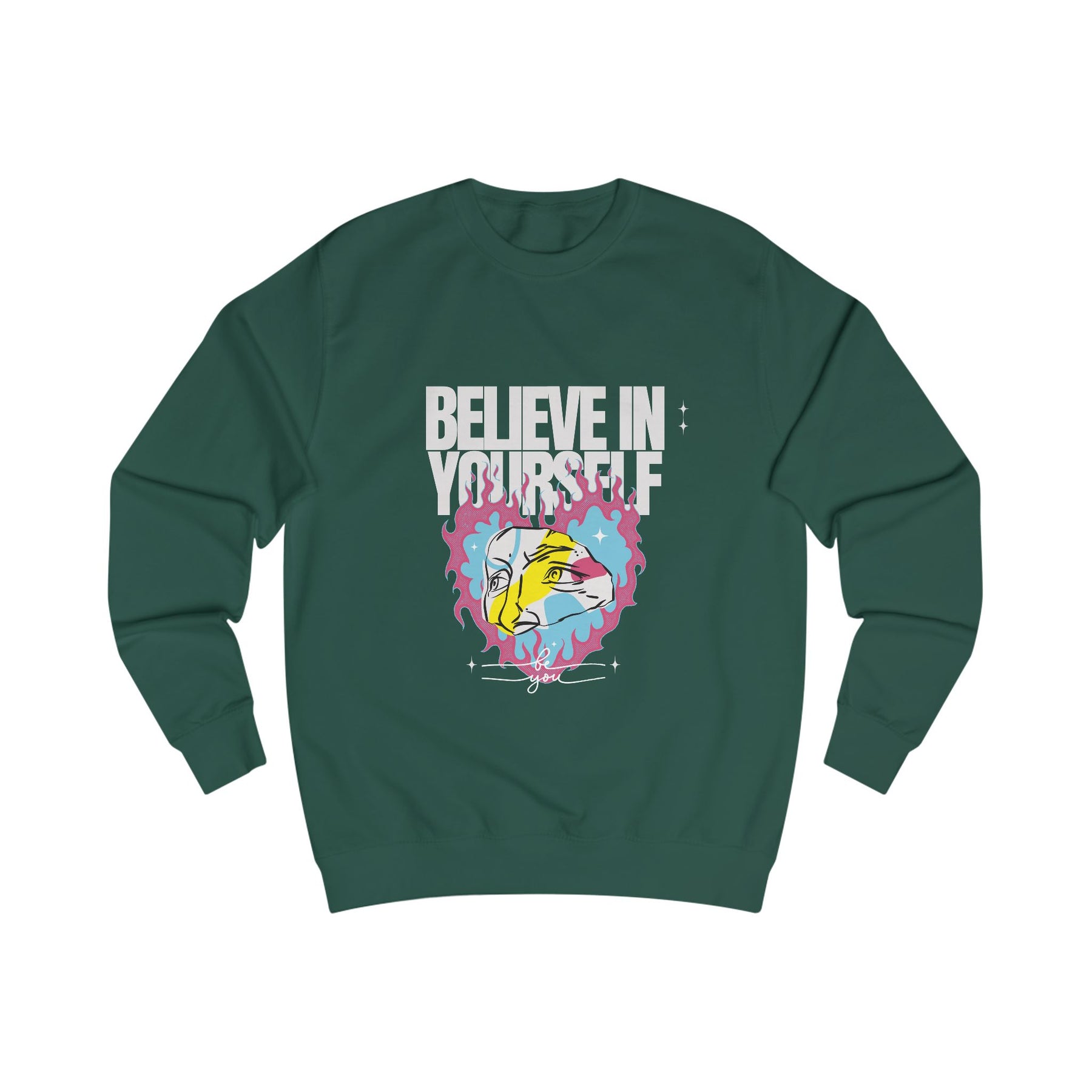 This sweatshirt isn't just fashion – it's fuel for your mindset. With bold colors and an abstract flaming face, it's made to empower creatives, dreamers, and those who stand tall in their uniqueness.