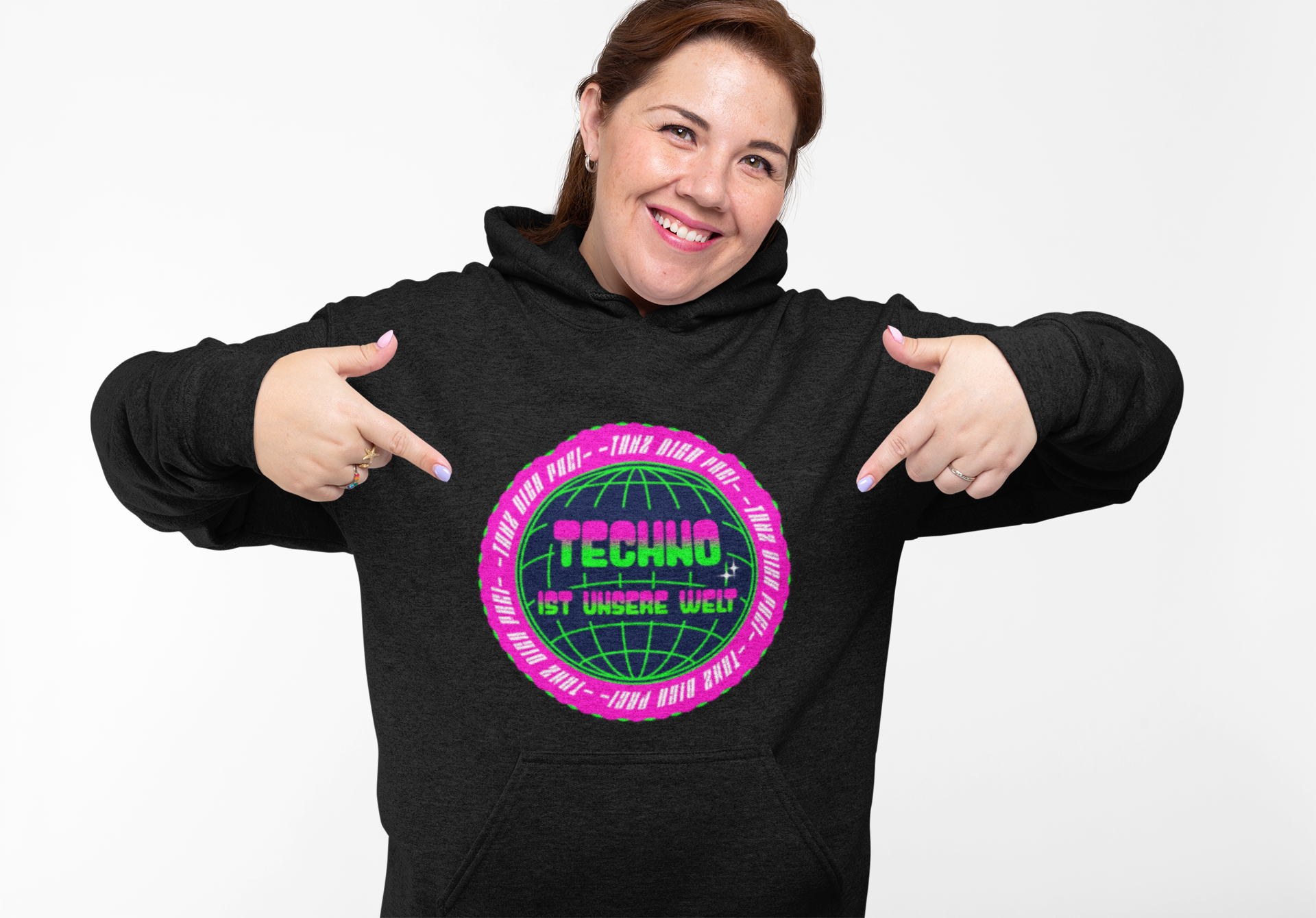 Global denken, lokal raven. Dieses Design bringt die Botschaft auf den Punkt: Techno ist kein Trend â es ist unsere Sprache, unser Herzschlag, unser Planet.