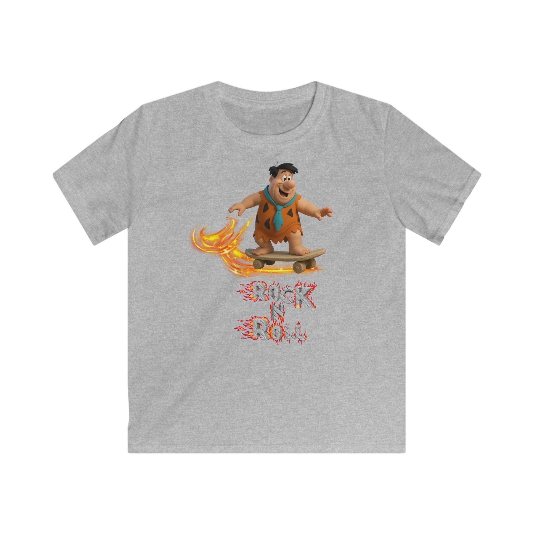 Bringe Feuer in deinen Style! Dieses Design zeigt Fred Feuerstein im 3D-Comic-Look, wie er mit einem brennenden Skateboard durchs Leben rollt. Kombiniert mit feurigem „Rock ’n’ Roll“-Schriftzug ist es perfekt für alle, die Retro-Cartoons und coolen Streetstyle lieben.