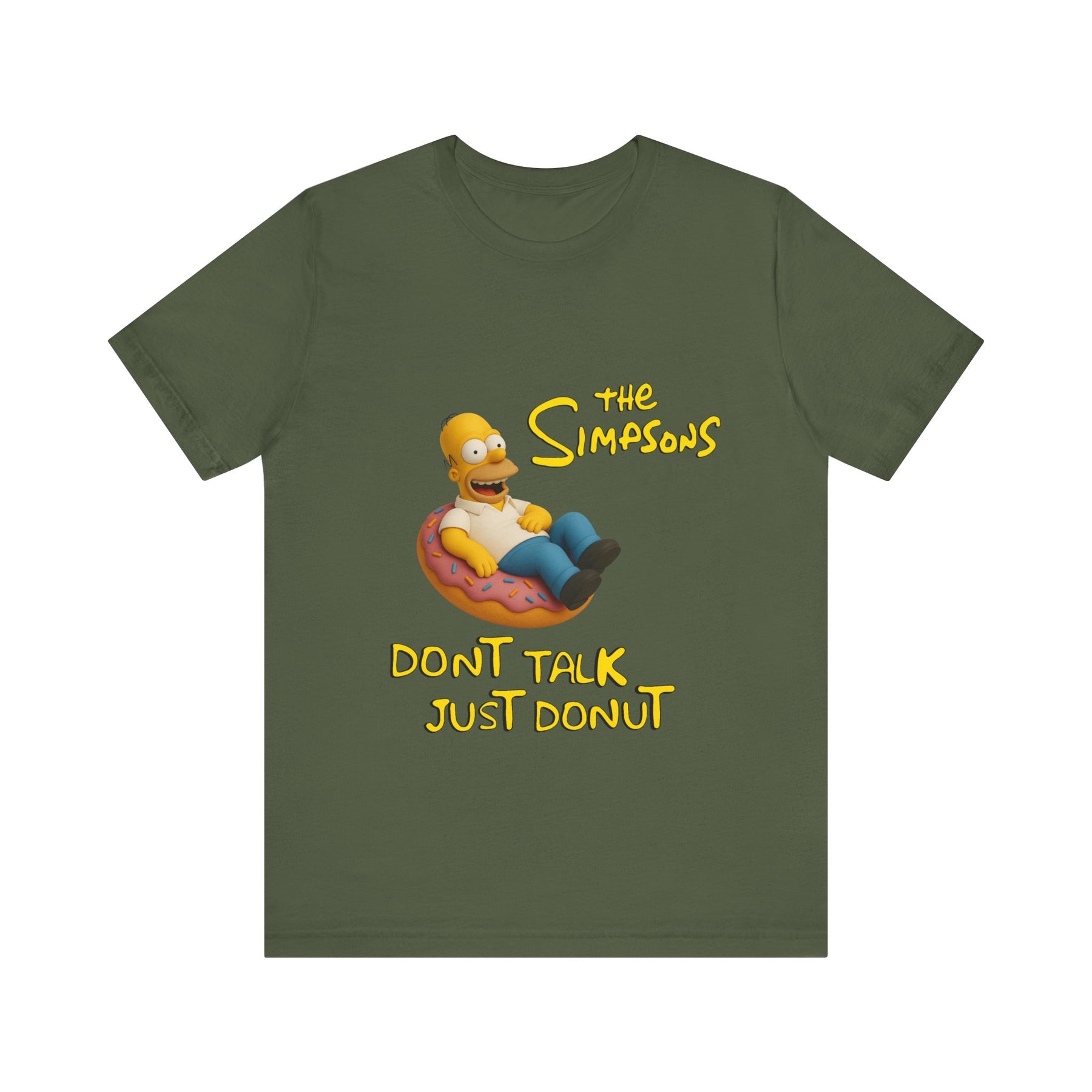 Dieses Shirt ist ein süßes Statement für alle, die lieber genießen statt quatschen – mit Homer Simpson, wie er auf einem Donut chillt, als wäre es ein Wellness-Tag in Springfield. 🍩😎