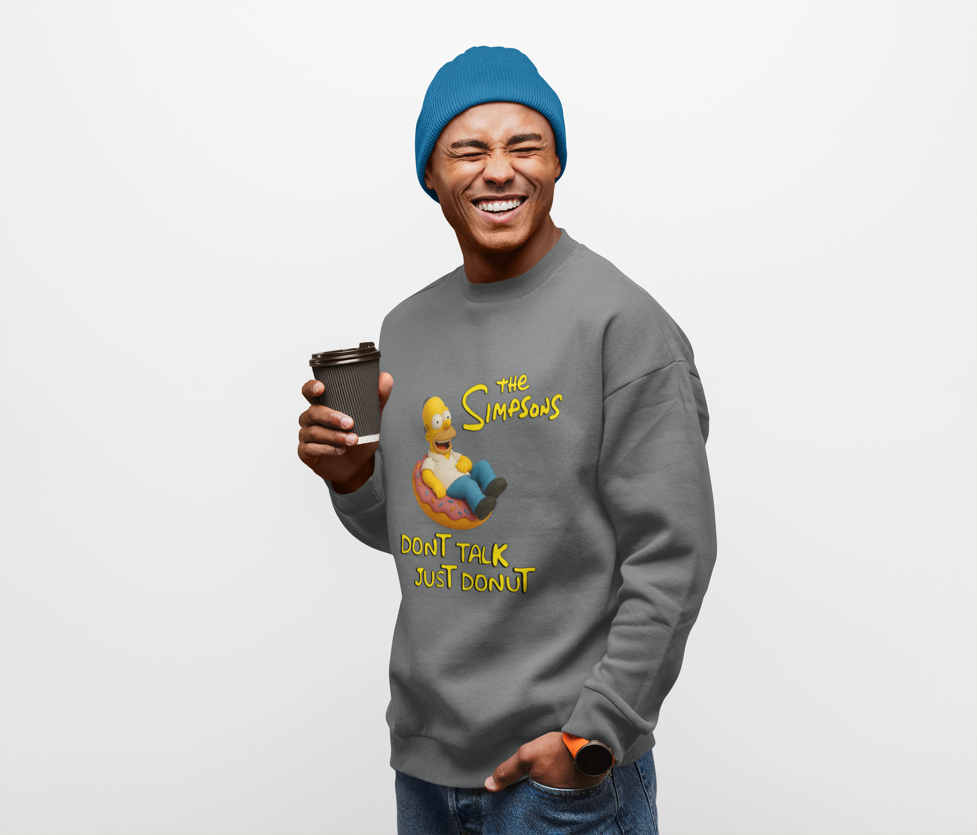 This sweatshirt is your official license to chill. Homer Simpson, riding a donut like it’s a magic carpet of sugar – because sometimes words are overrated and donuts are not. 🍩😎