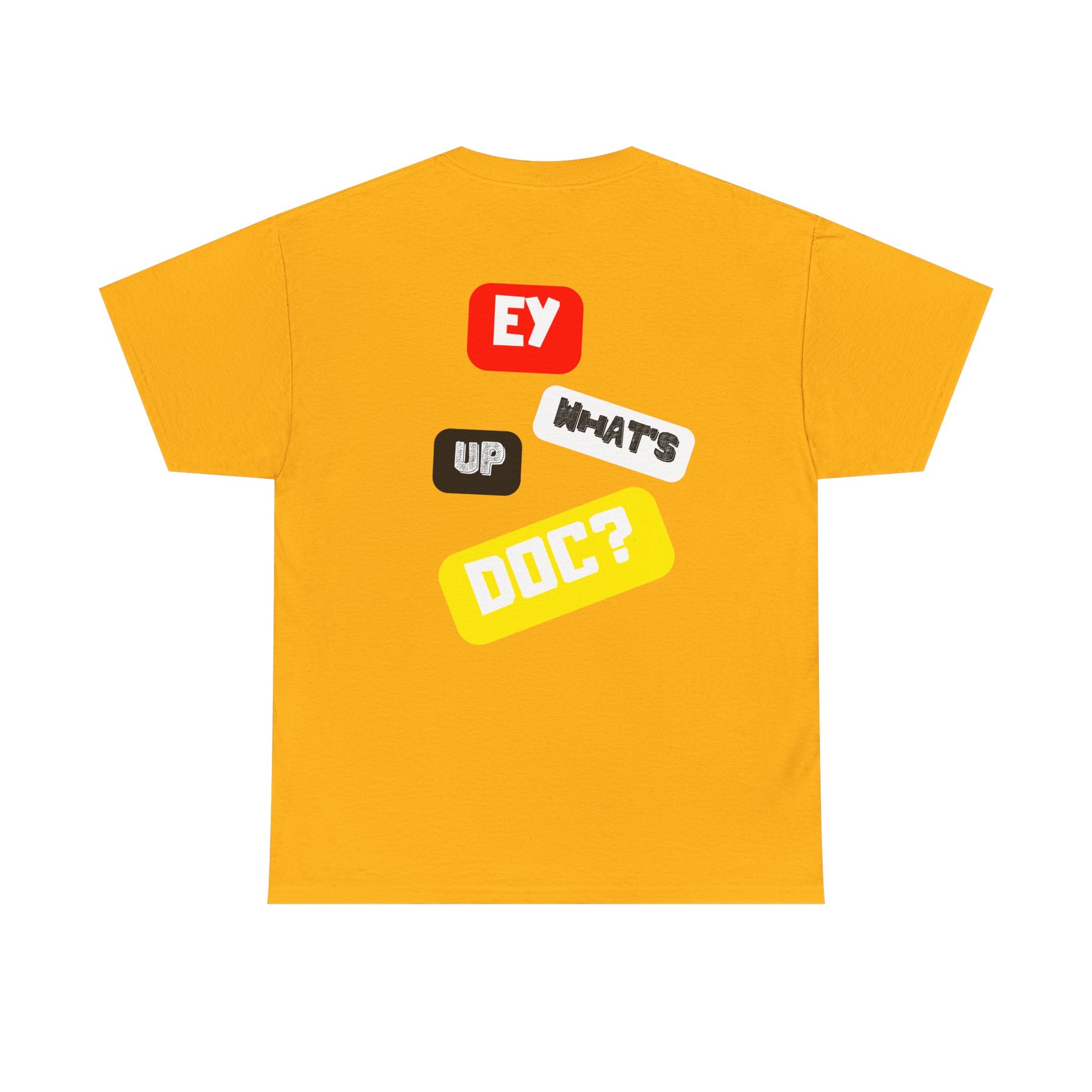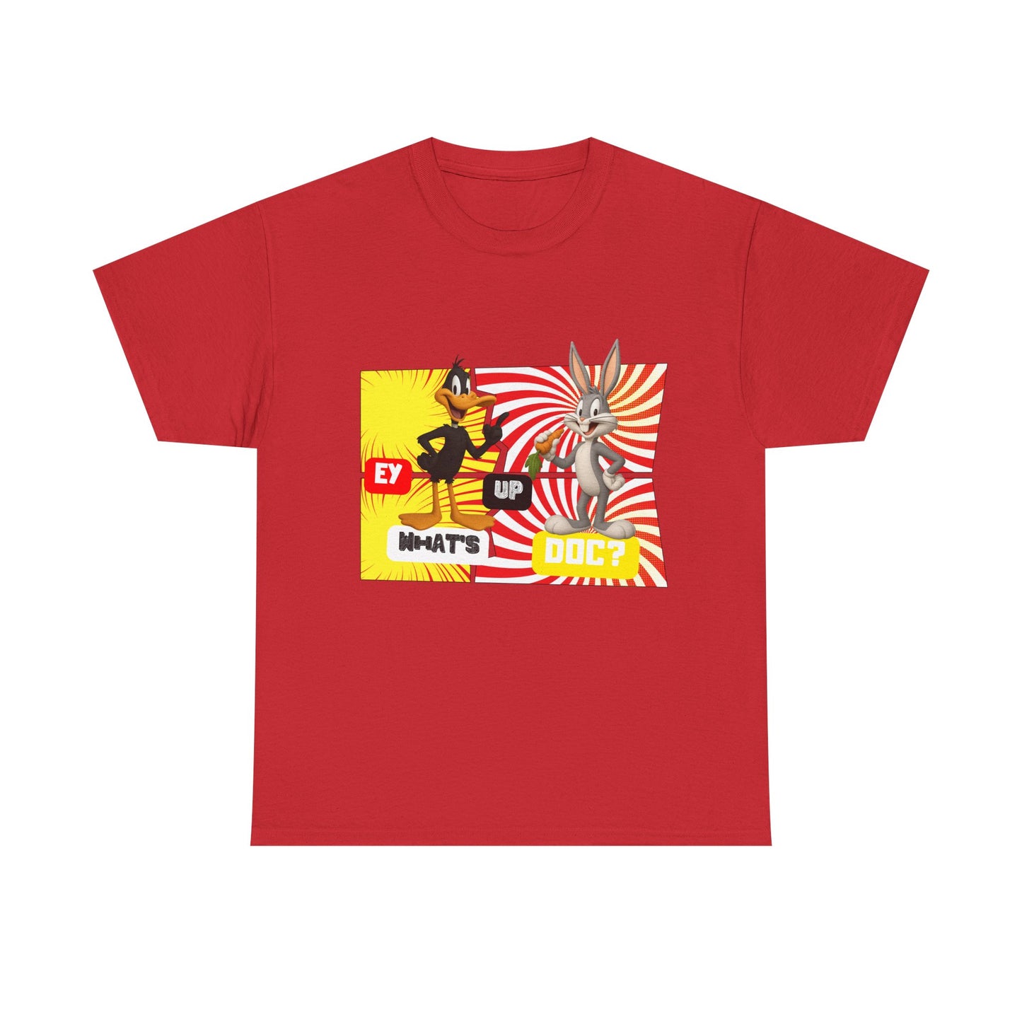 Front features retro comic style with spiral background, back features the iconic âEy Up â Whatâs Up Doc?â in bold statement print.