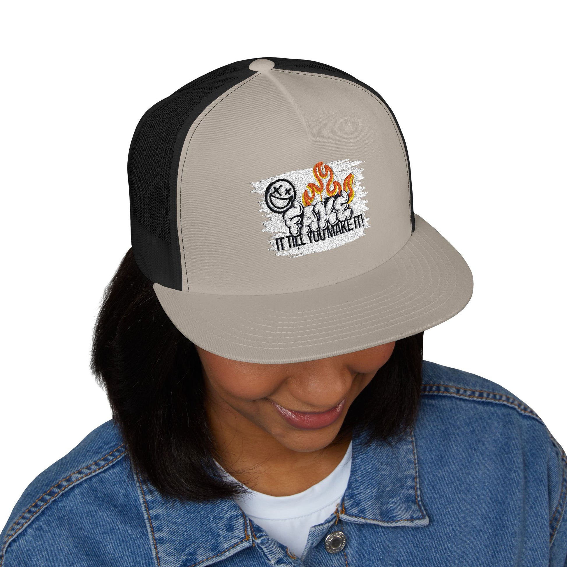 This cap brings the heat â and the hustle. Graffiti-style flames, bold âFAKEâ tag, and a ghosted smiley behind the scenes: âFake it till you make itâ has never looked this fresh.