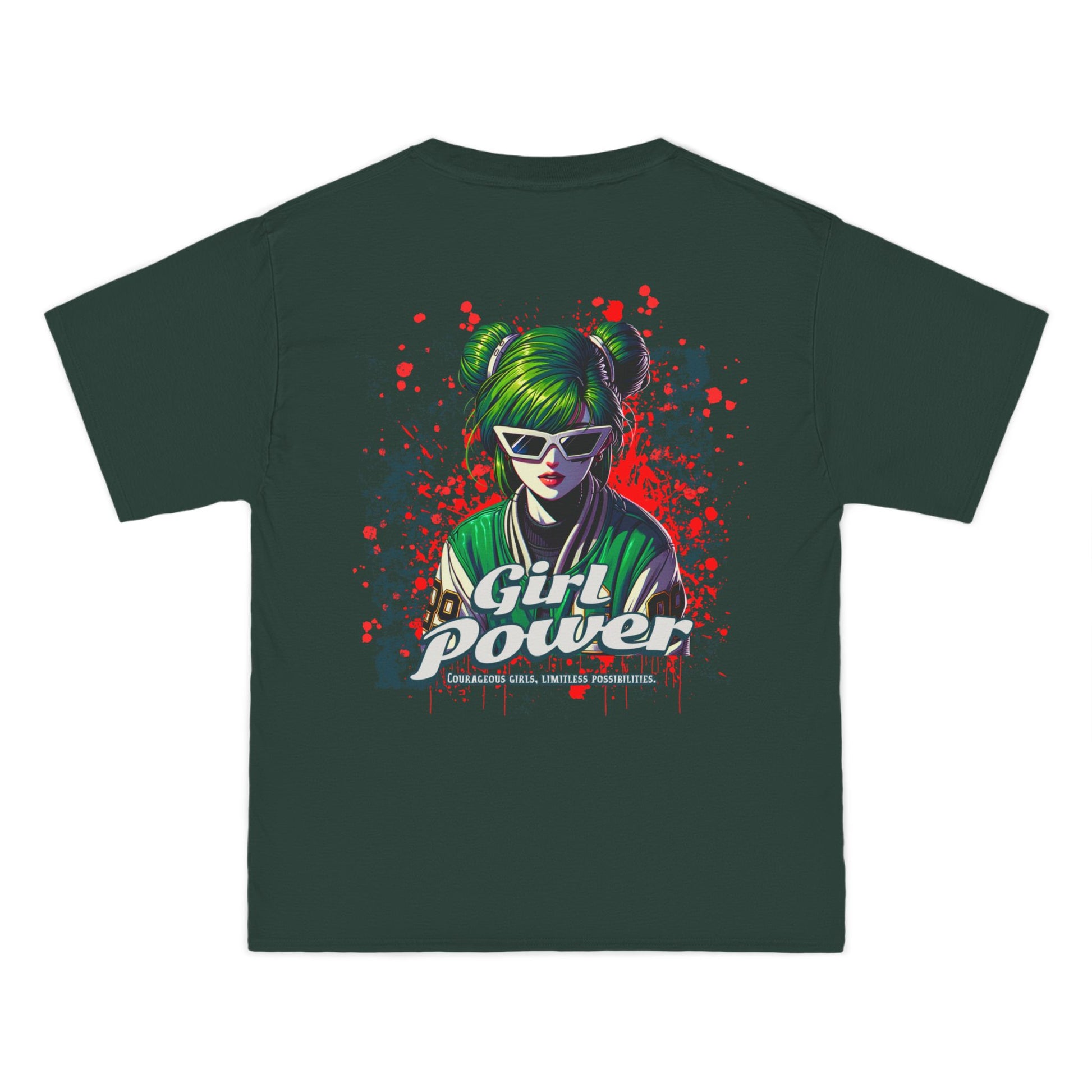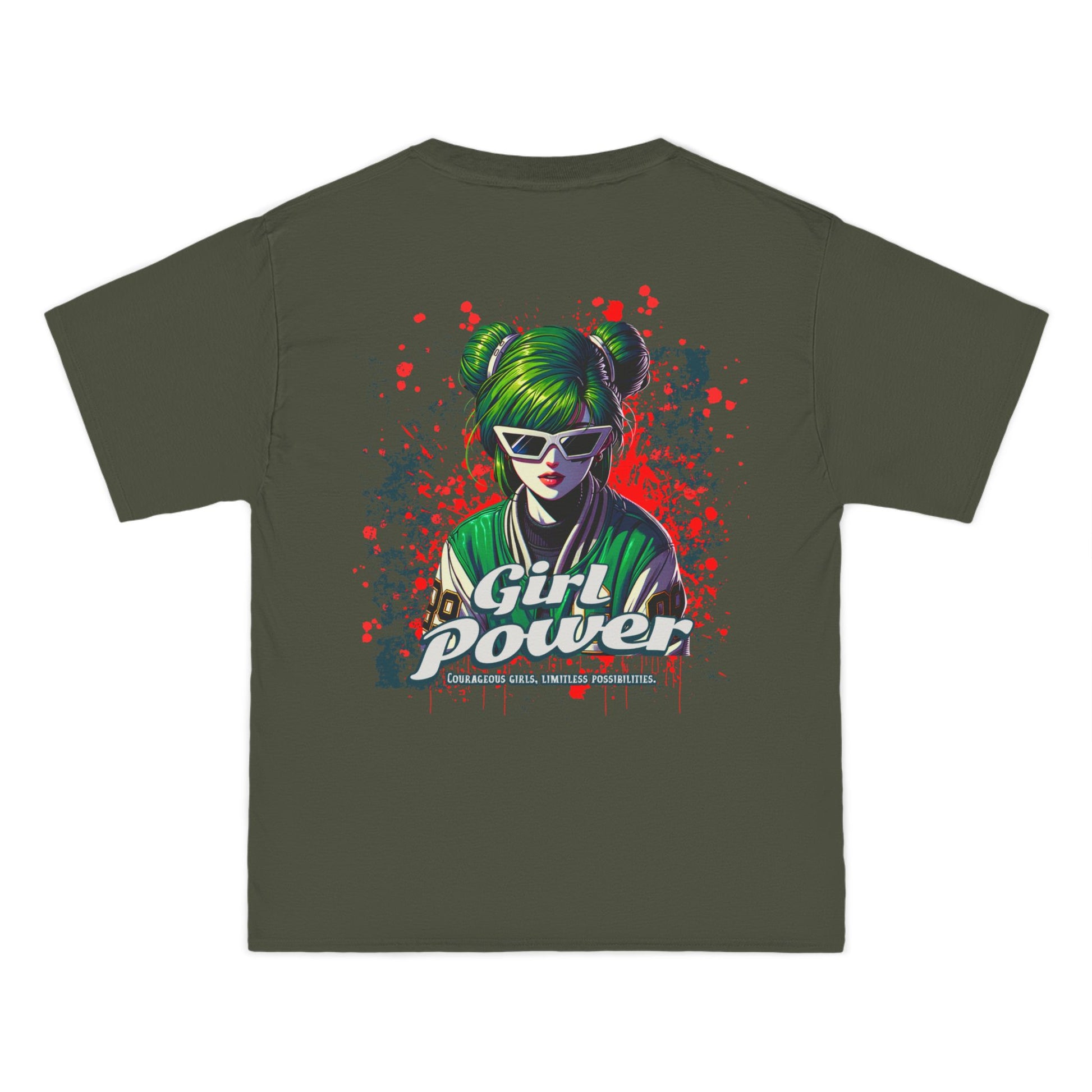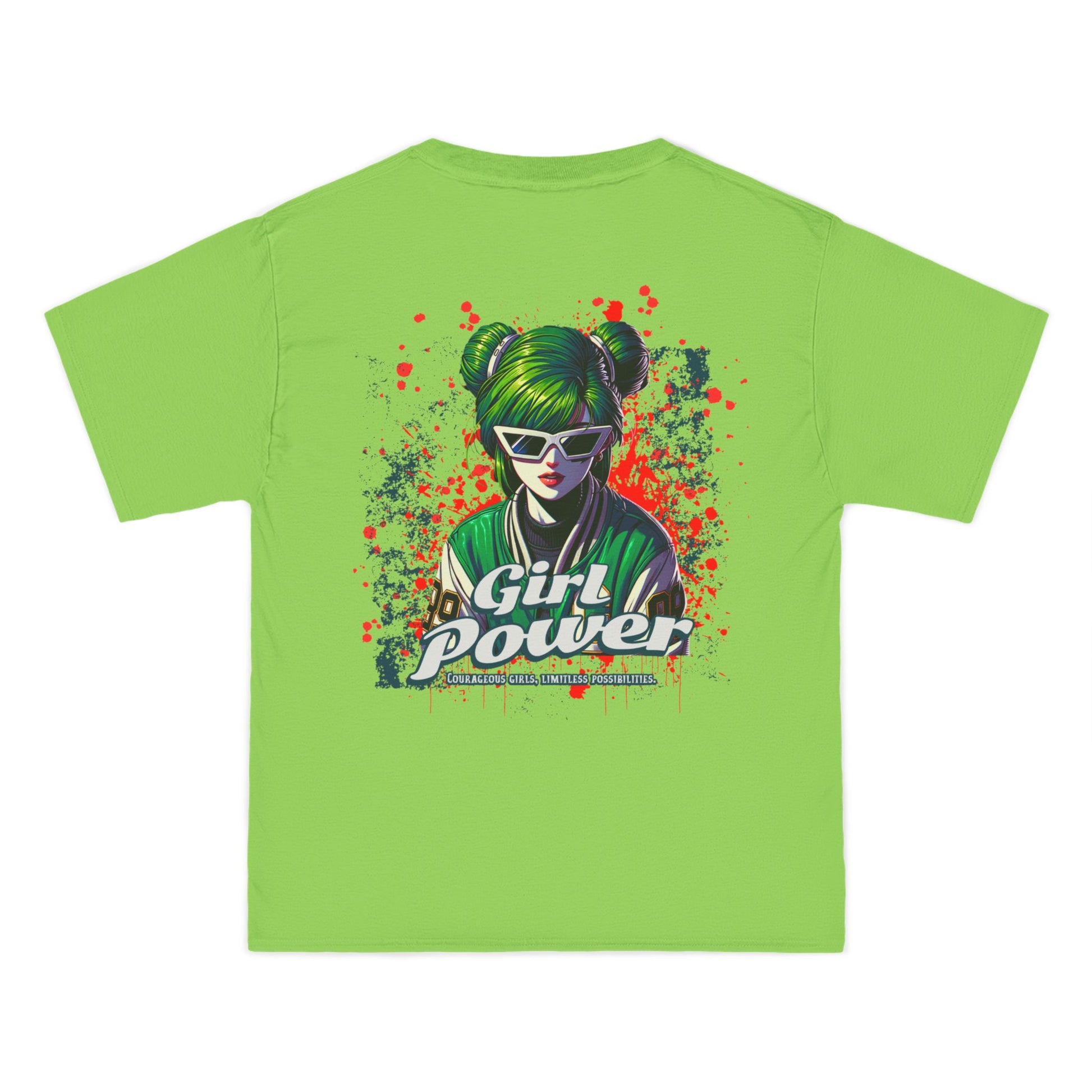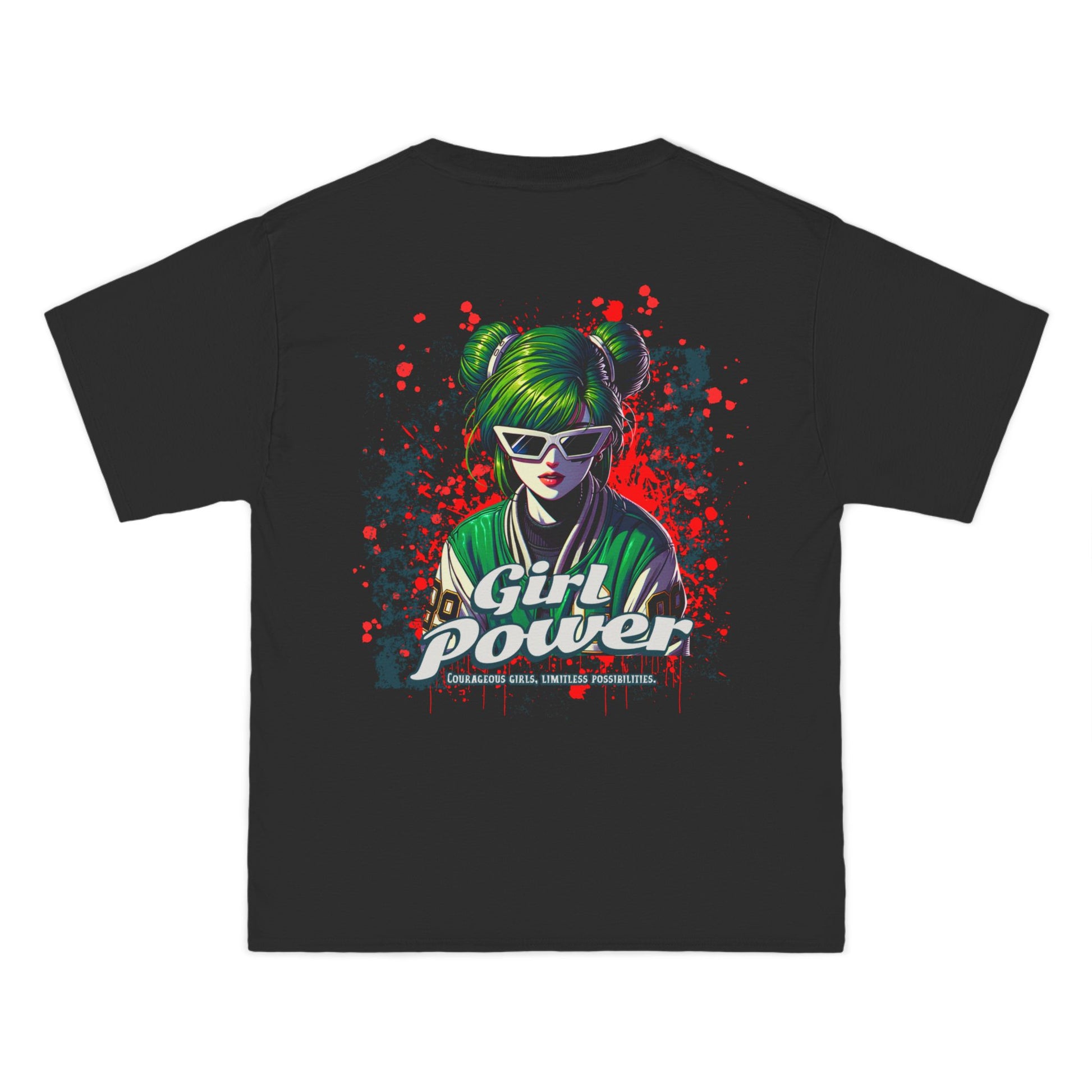 This shirt makes a fearless statement for those who bring results â not excuses. The green-haired, sunglass-wearing futuristic heroine merges cyberpunk flair with street-art attitude in a look that screams revolution and radiates confidence.