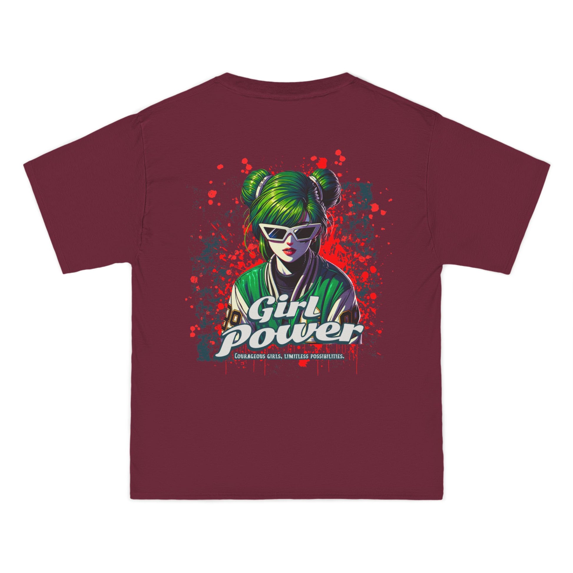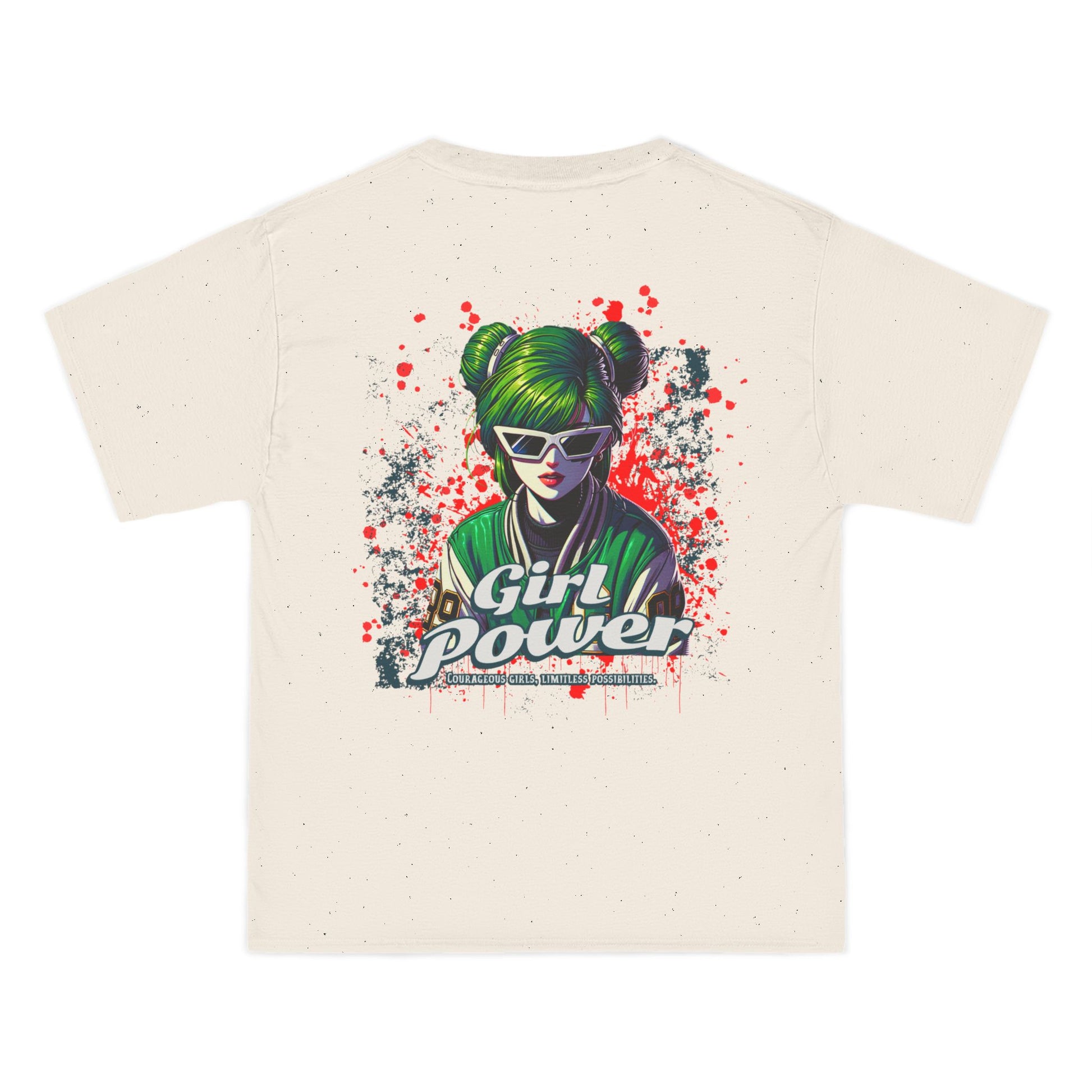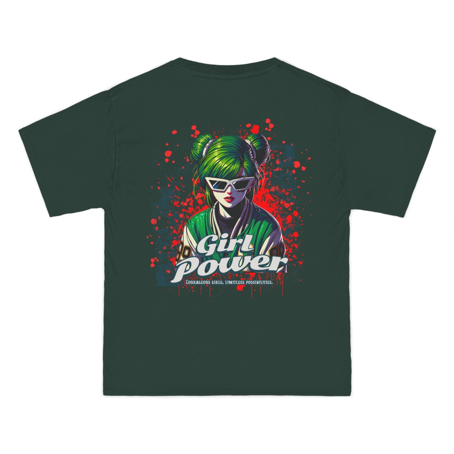 This shirt makes a fearless statement for those who bring results â not excuses. The green-haired, sunglass-wearing futuristic heroine merges cyberpunk flair with street-art attitude in a look that screams revolution and radiates confidence.