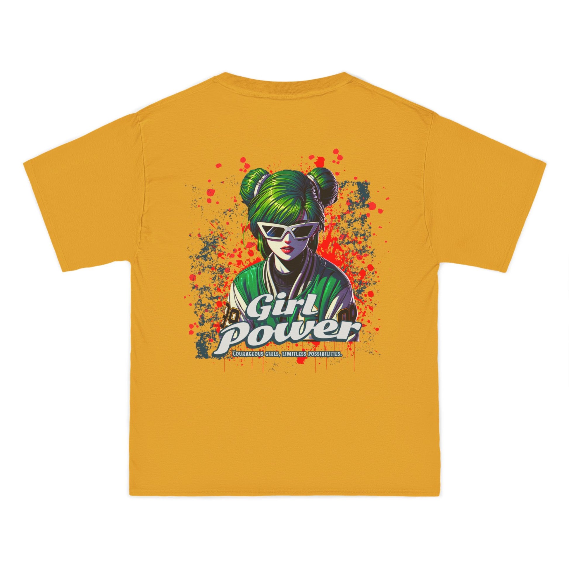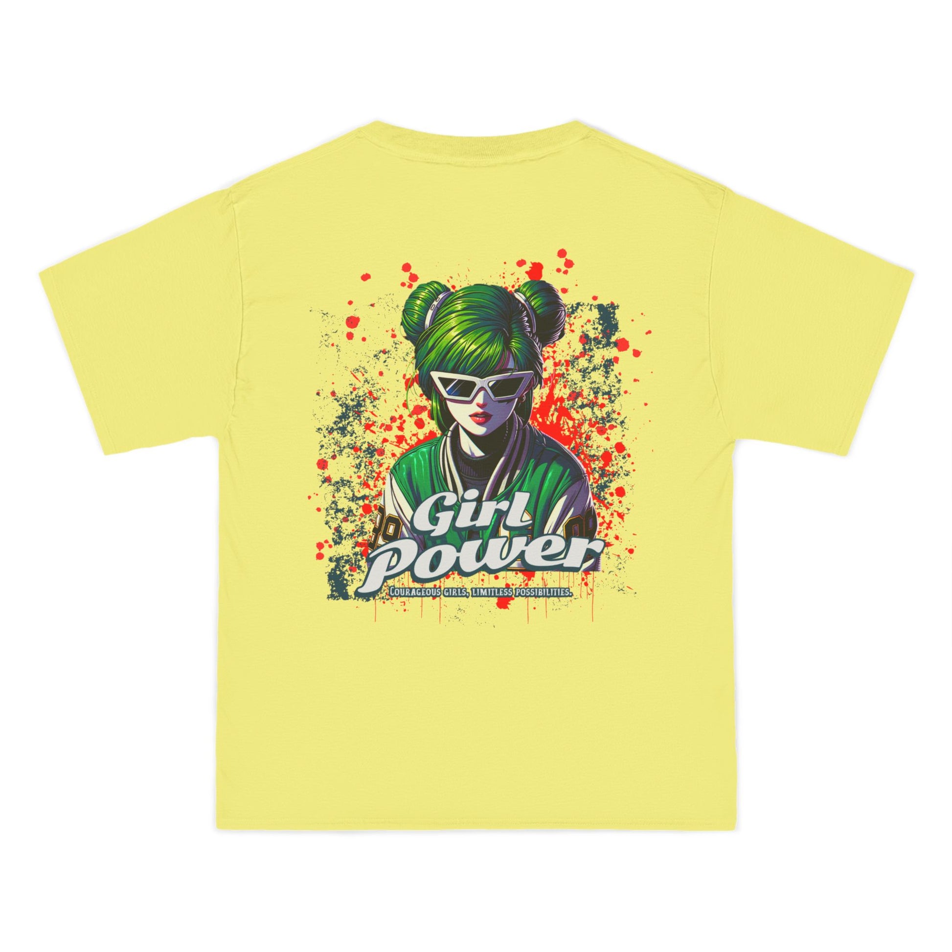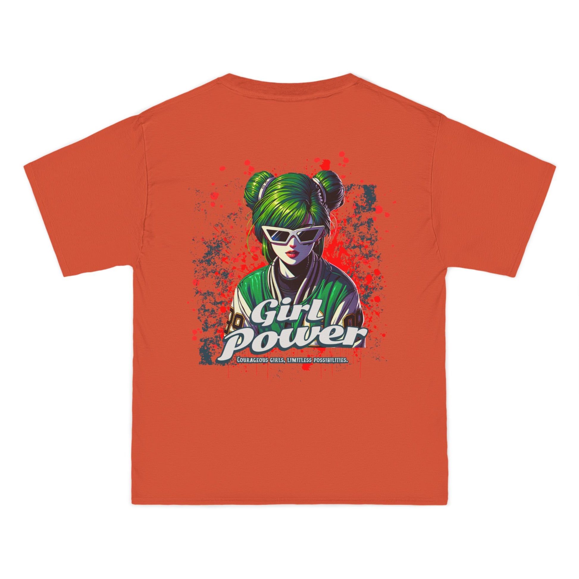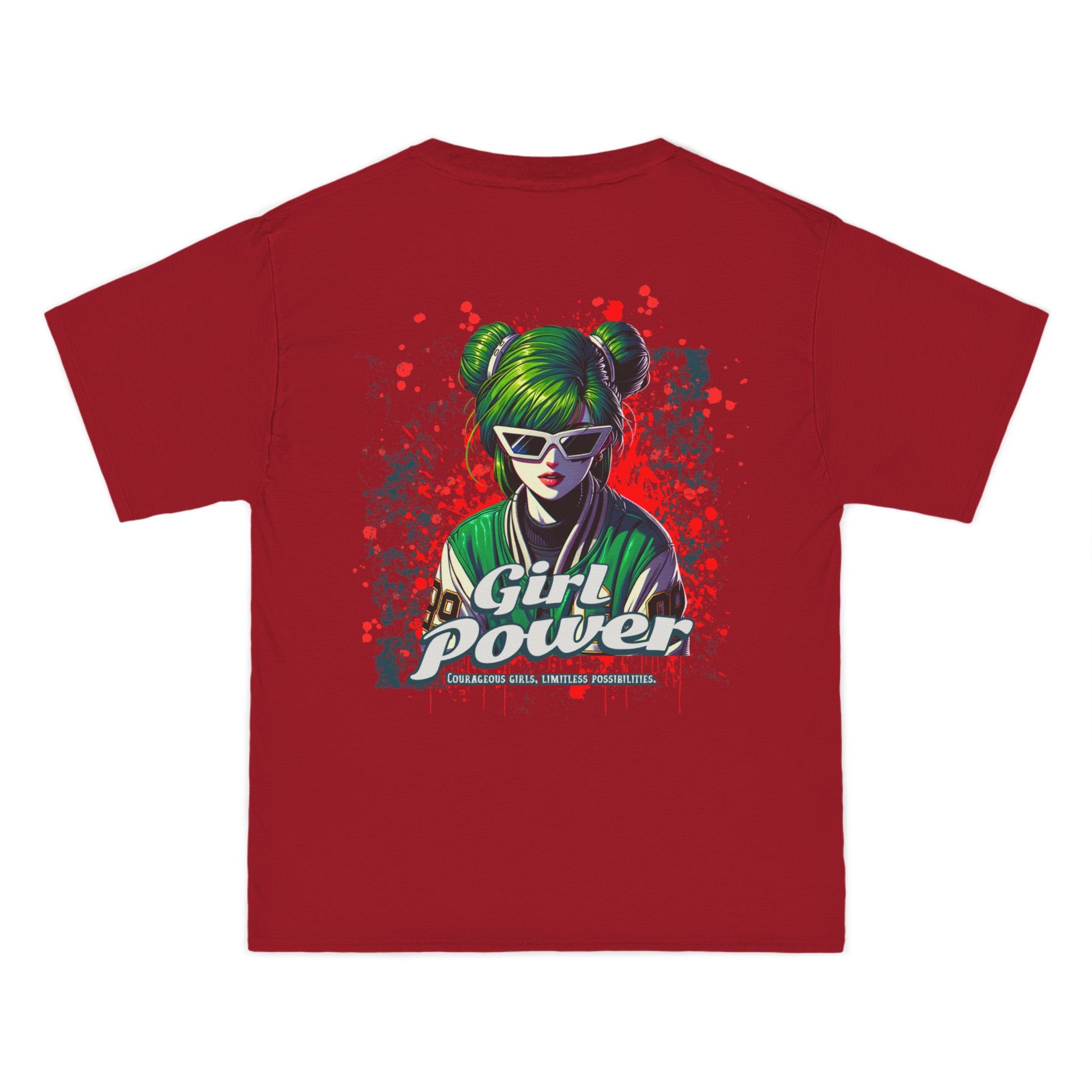 This shirt makes a fearless statement for those who bring results â not excuses. The green-haired, sunglass-wearing futuristic heroine merges cyberpunk flair with street-art attitude in a look that screams revolution and radiates confidence.