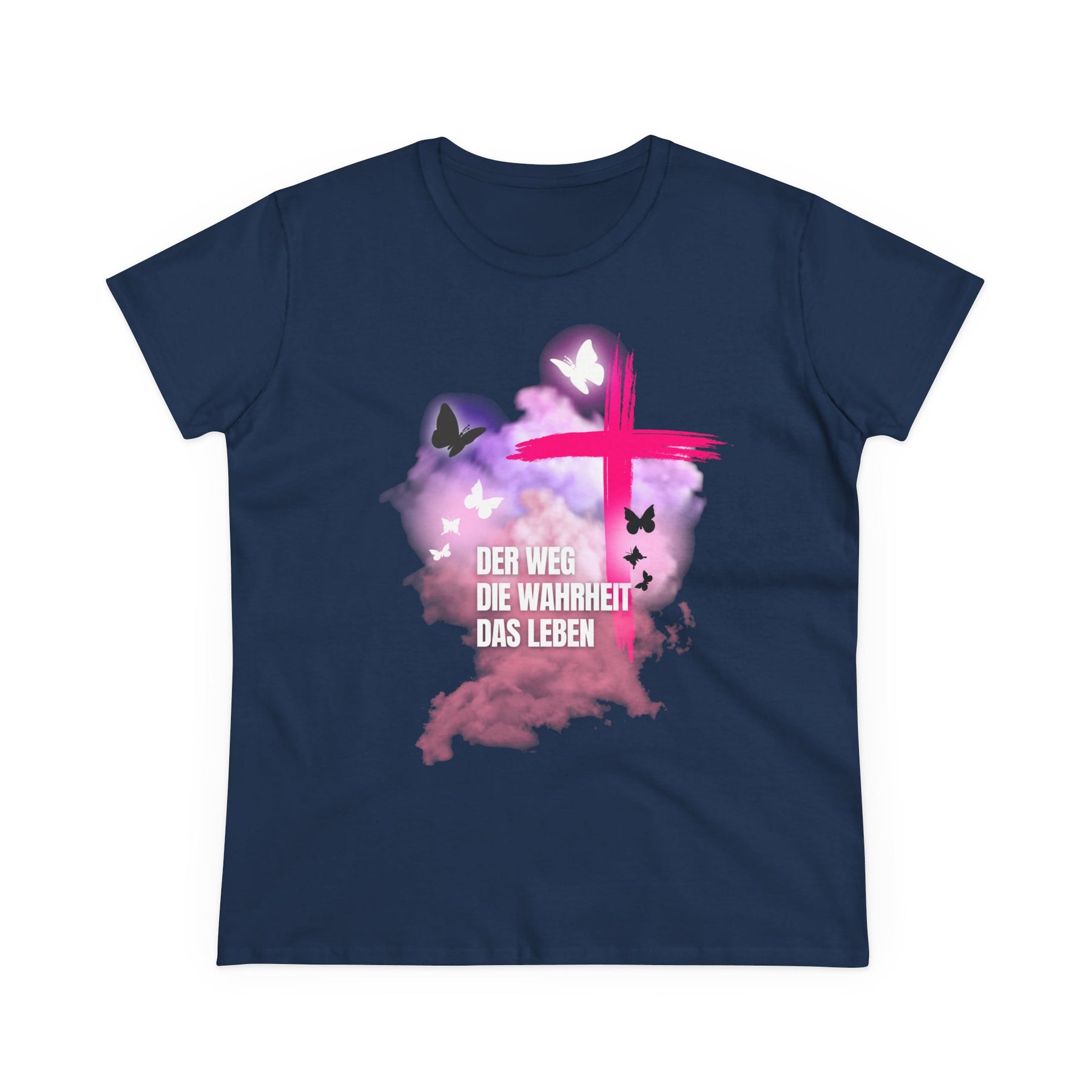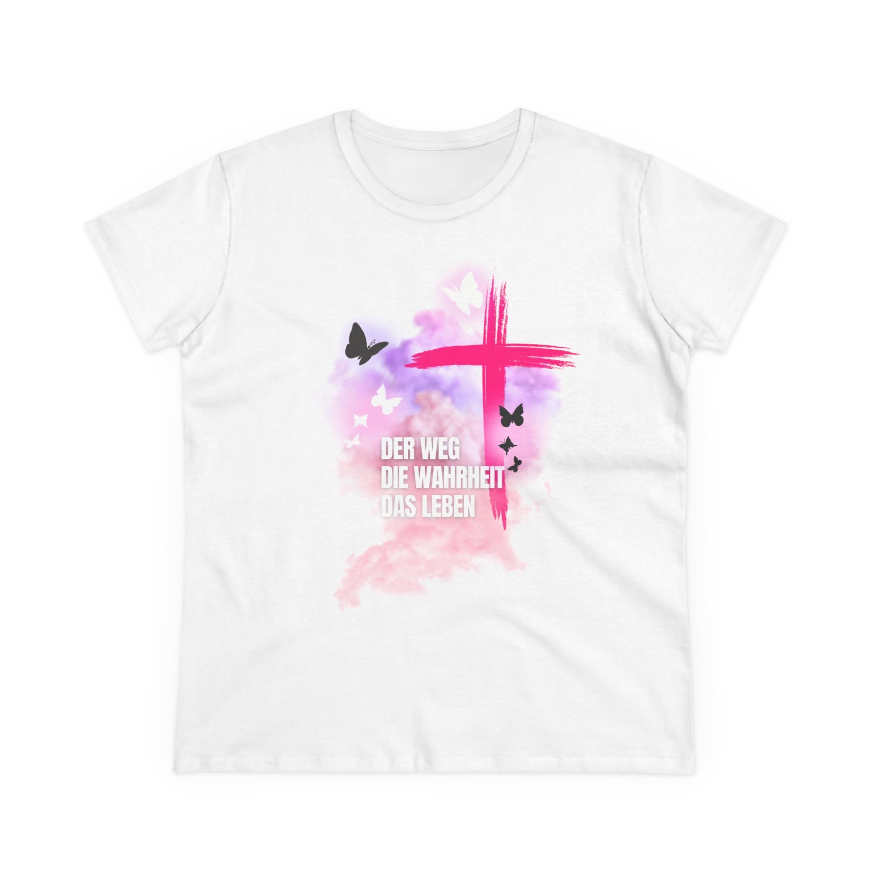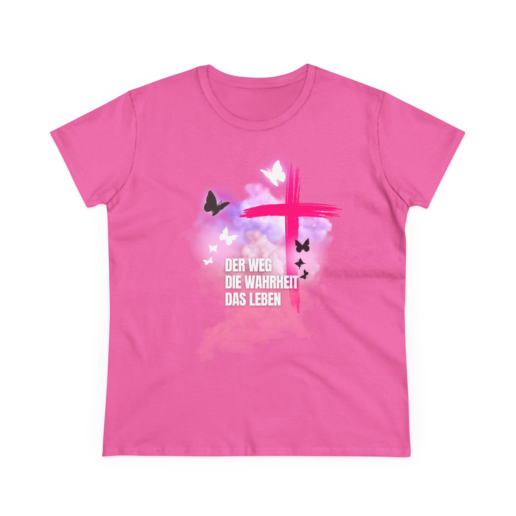 Dieses Shirt verbindet Glauben mit modernem Design. Ein leuchtendes Kreuz in Pink, umrahmt von Schmetterlingen und sanften Farben, transportiert die Worte Jesu: „Der Weg, die Wahrheit, das Leben“ (Johannes 14,6).