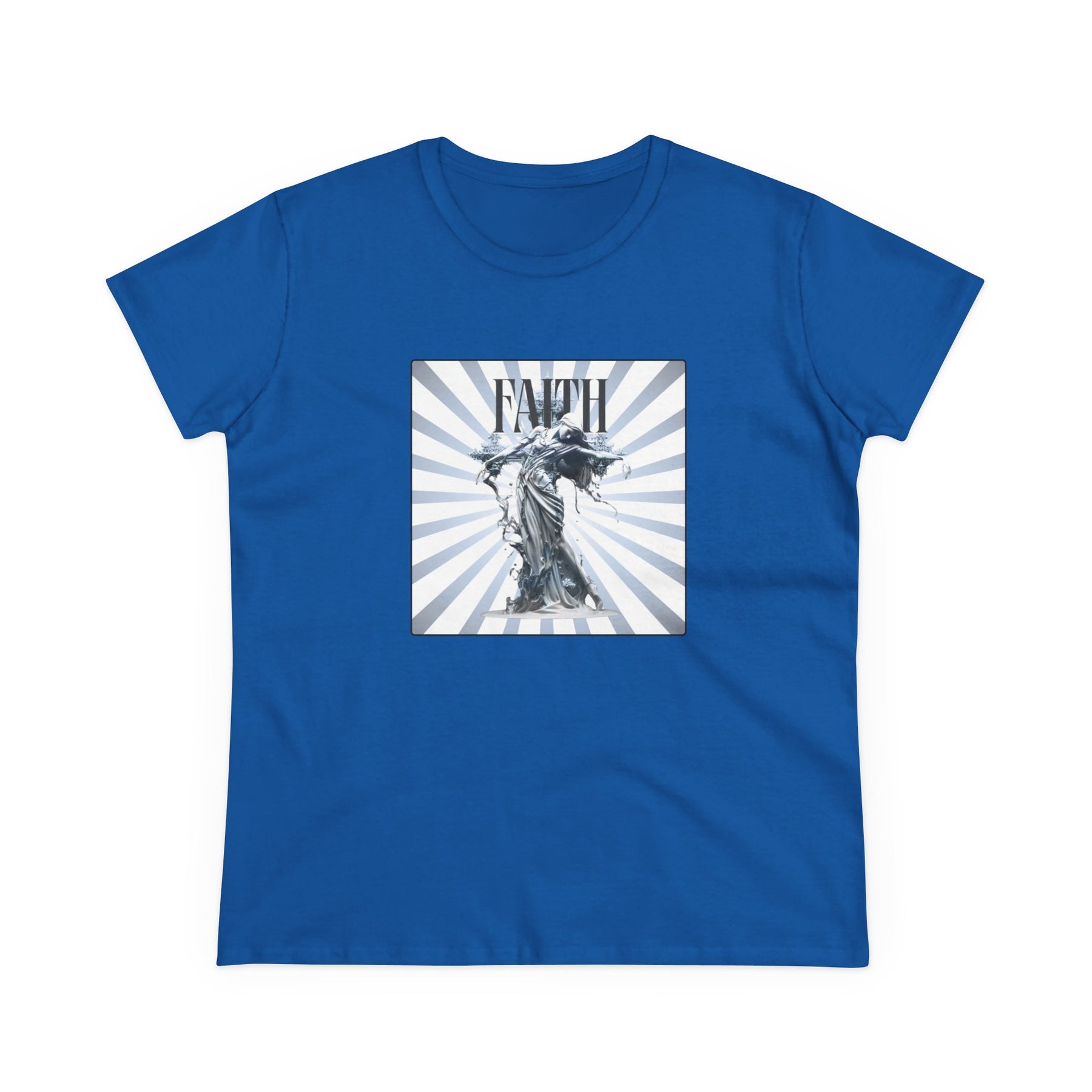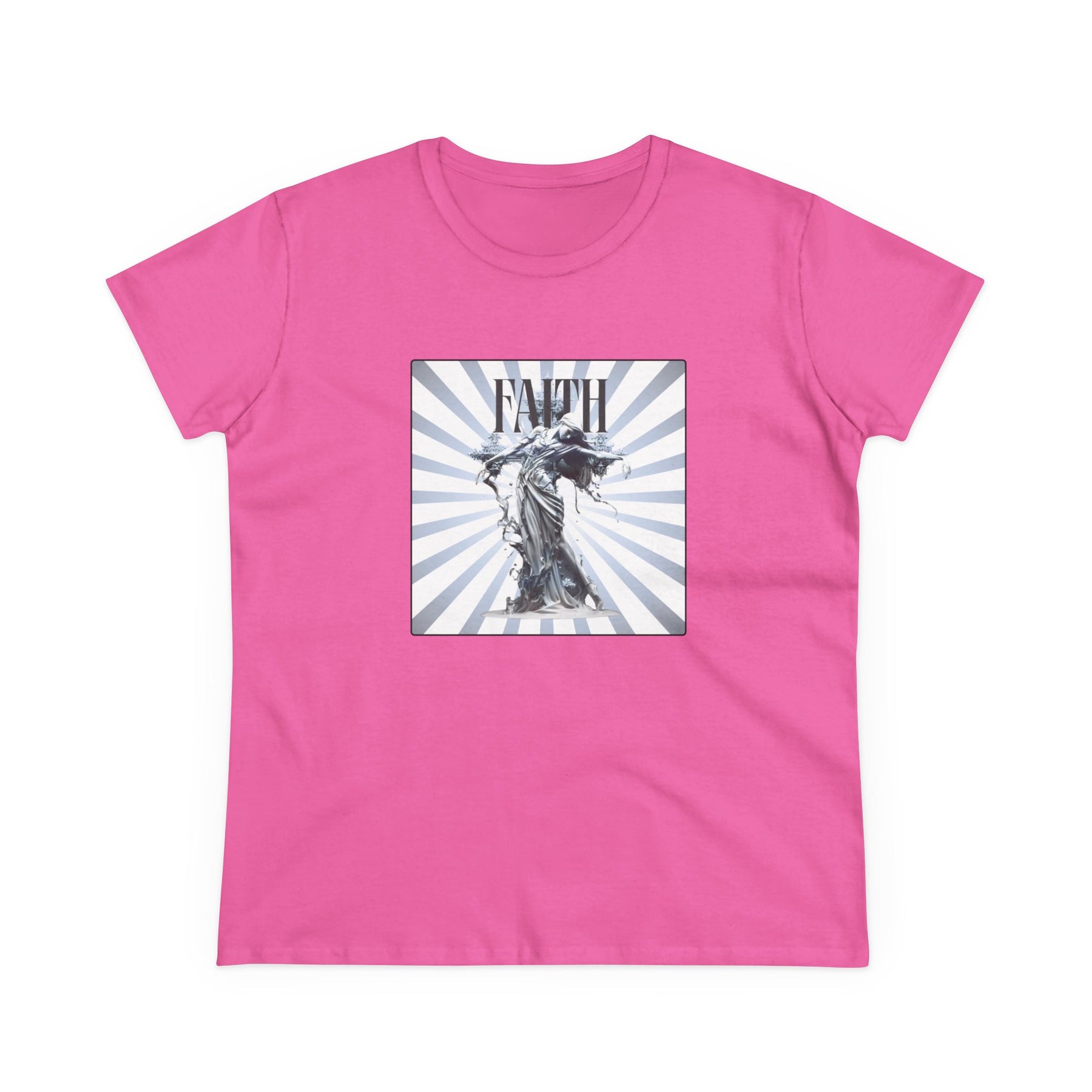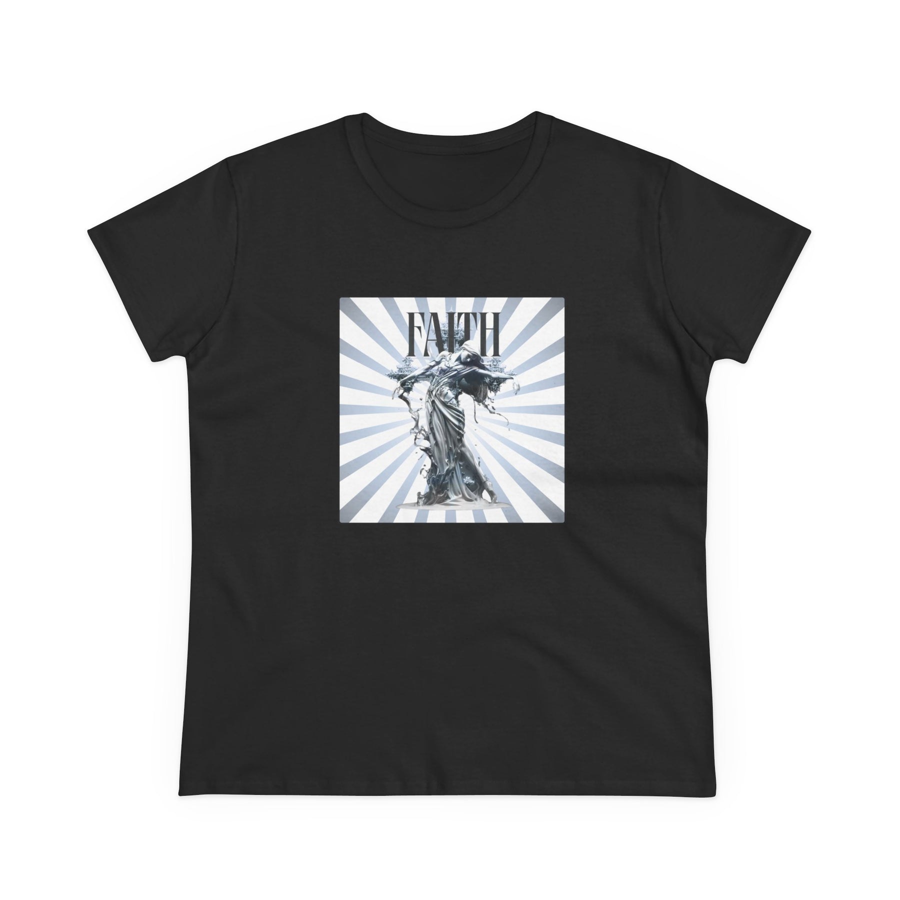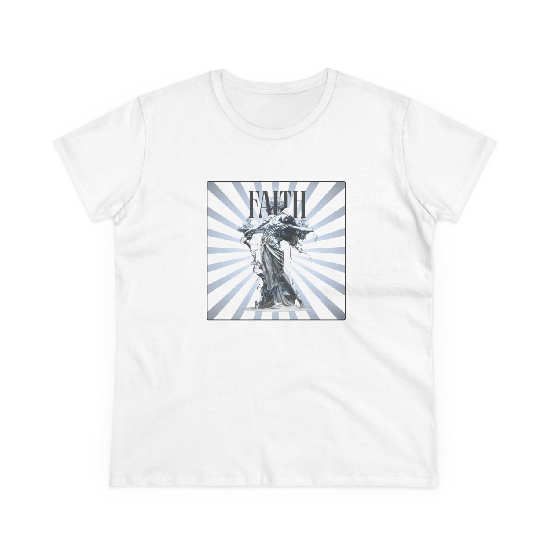 Schriftzug: „Faith“ über dem Kreuz – leicht gebogen oder schwebend gesetzt