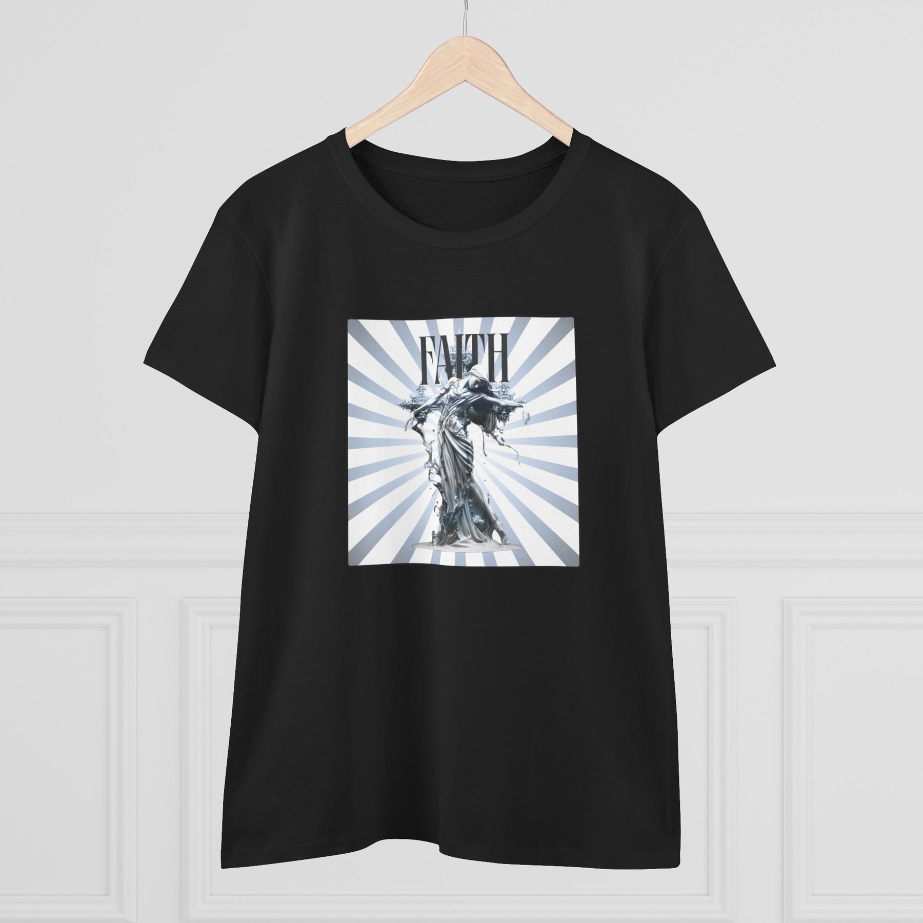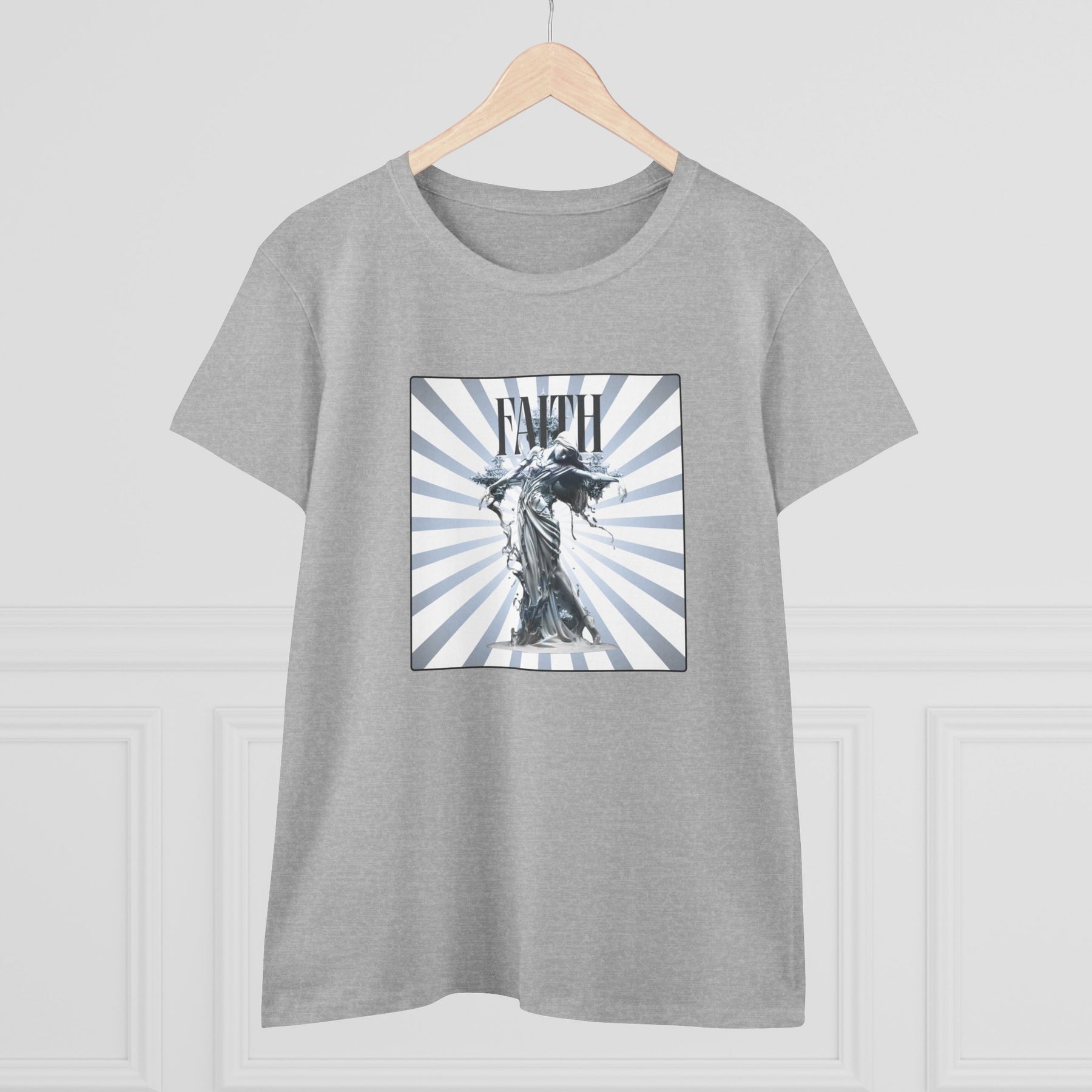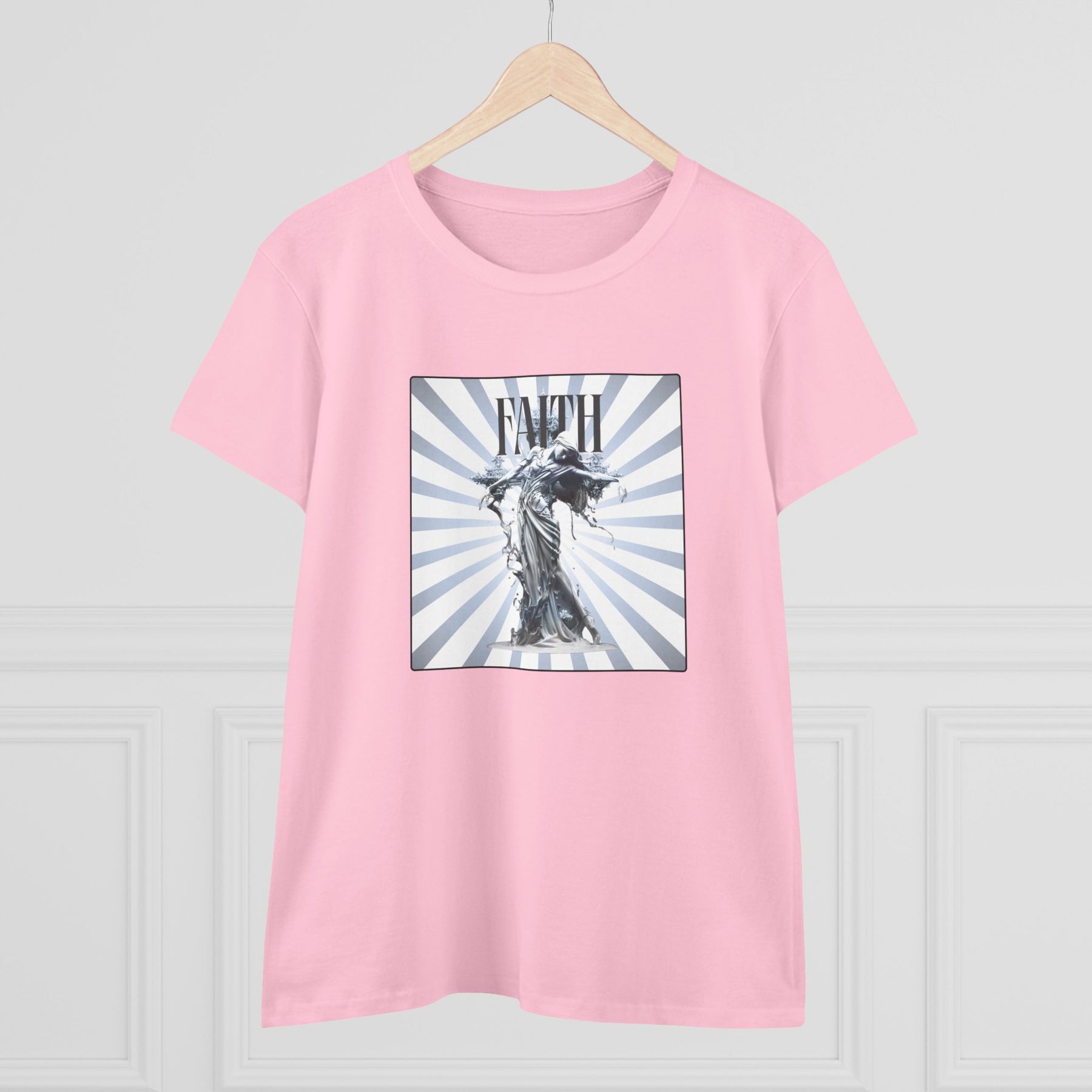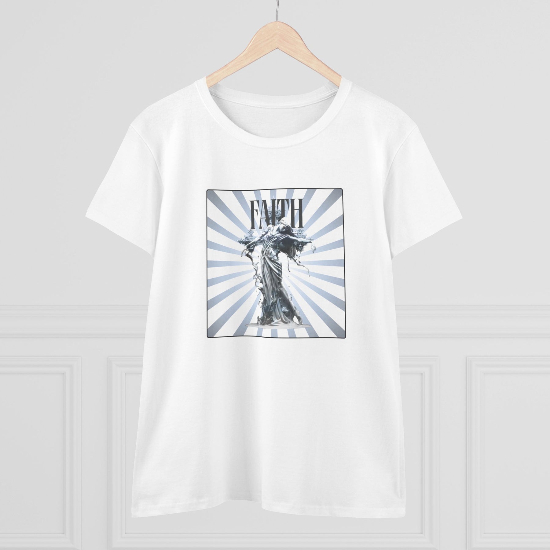 Schriftzug: „Faith“ über dem Kreuz – leicht gebogen oder schwebend gesetzt