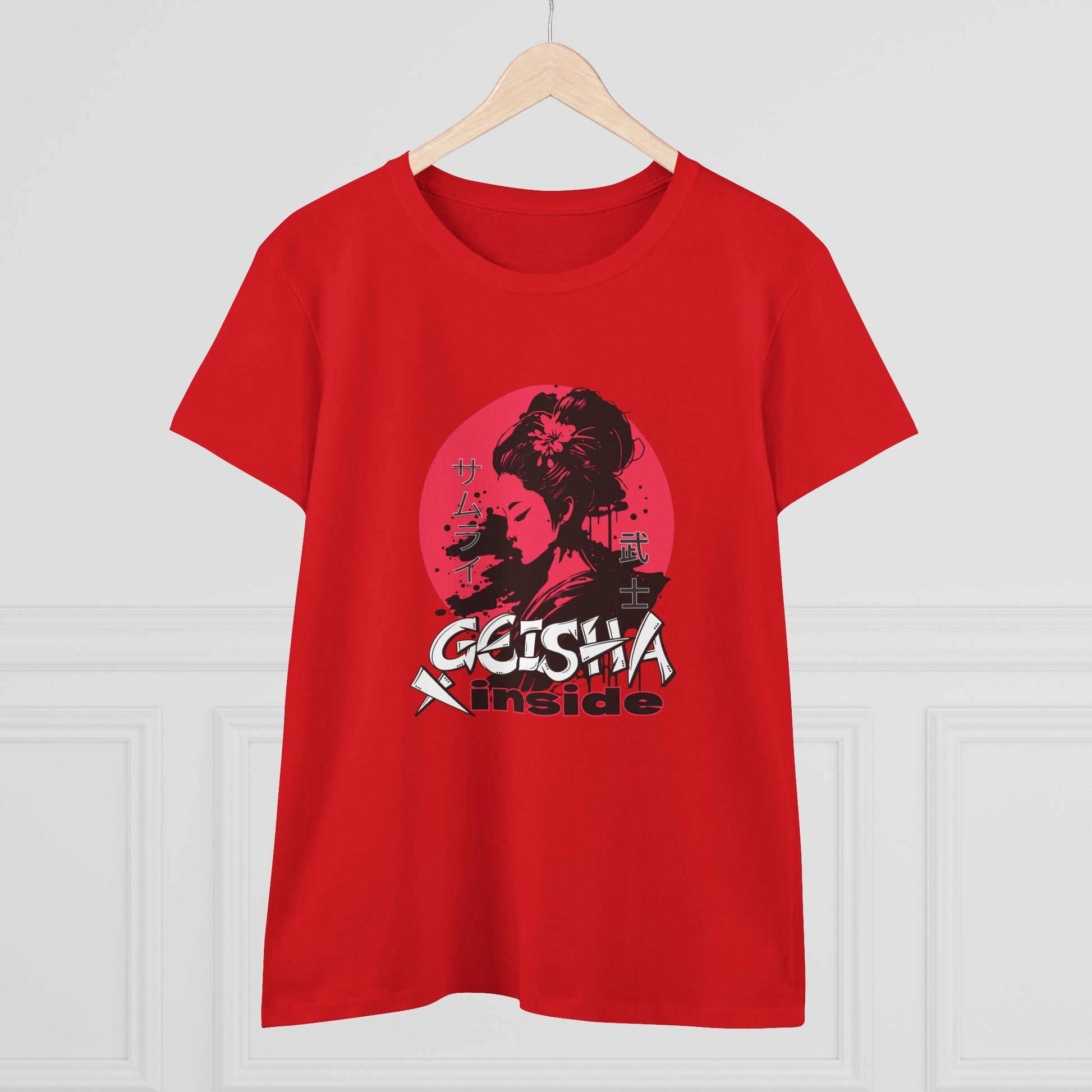 Eine elegant gezeichnete Geisha im klassischen Kimono, kombiniert mit stylischer Skater-Typografie âGeisha Insideâ und japanischen Symbolen â ein Kontrast aus innerer Ruhe und äuĂerer Coolness.
