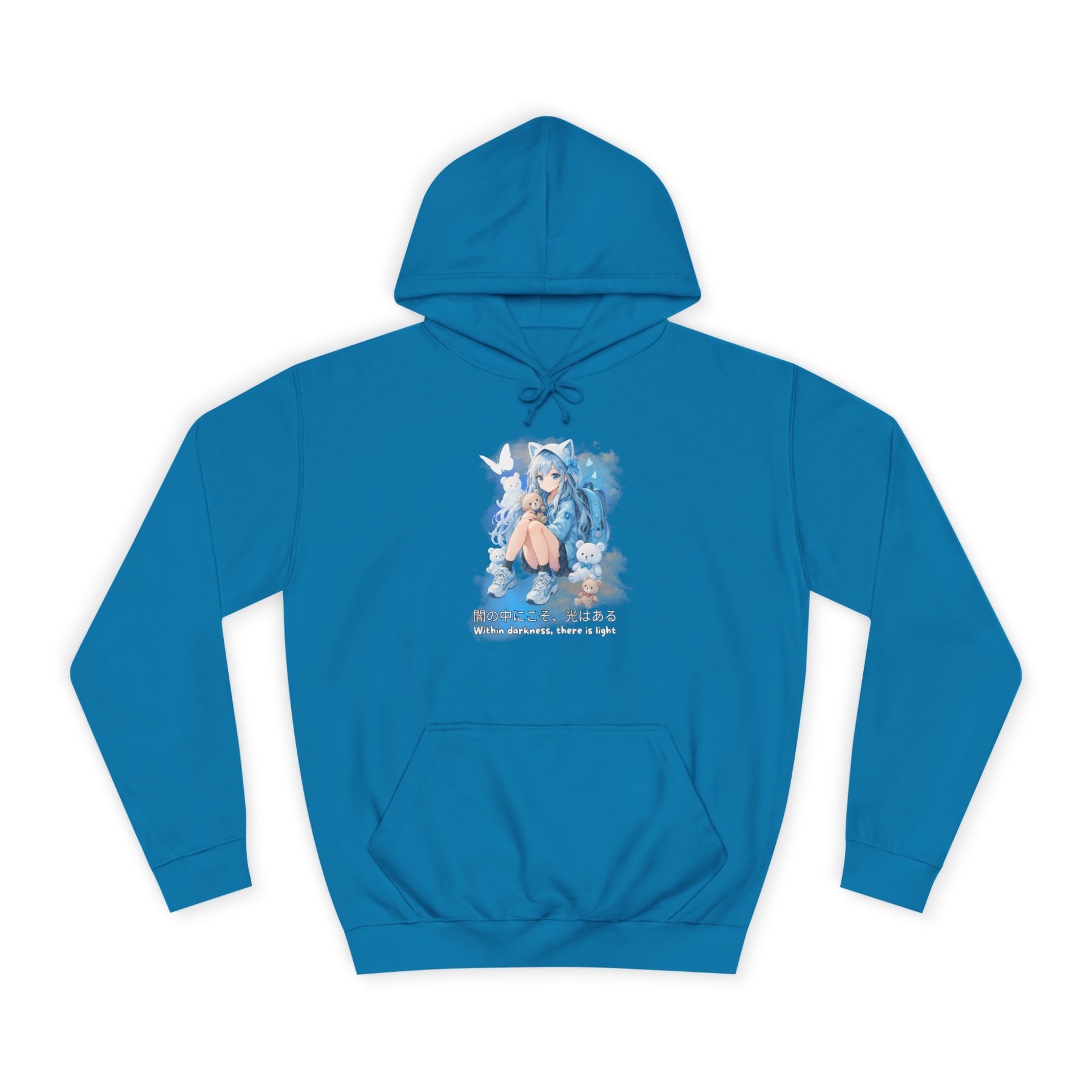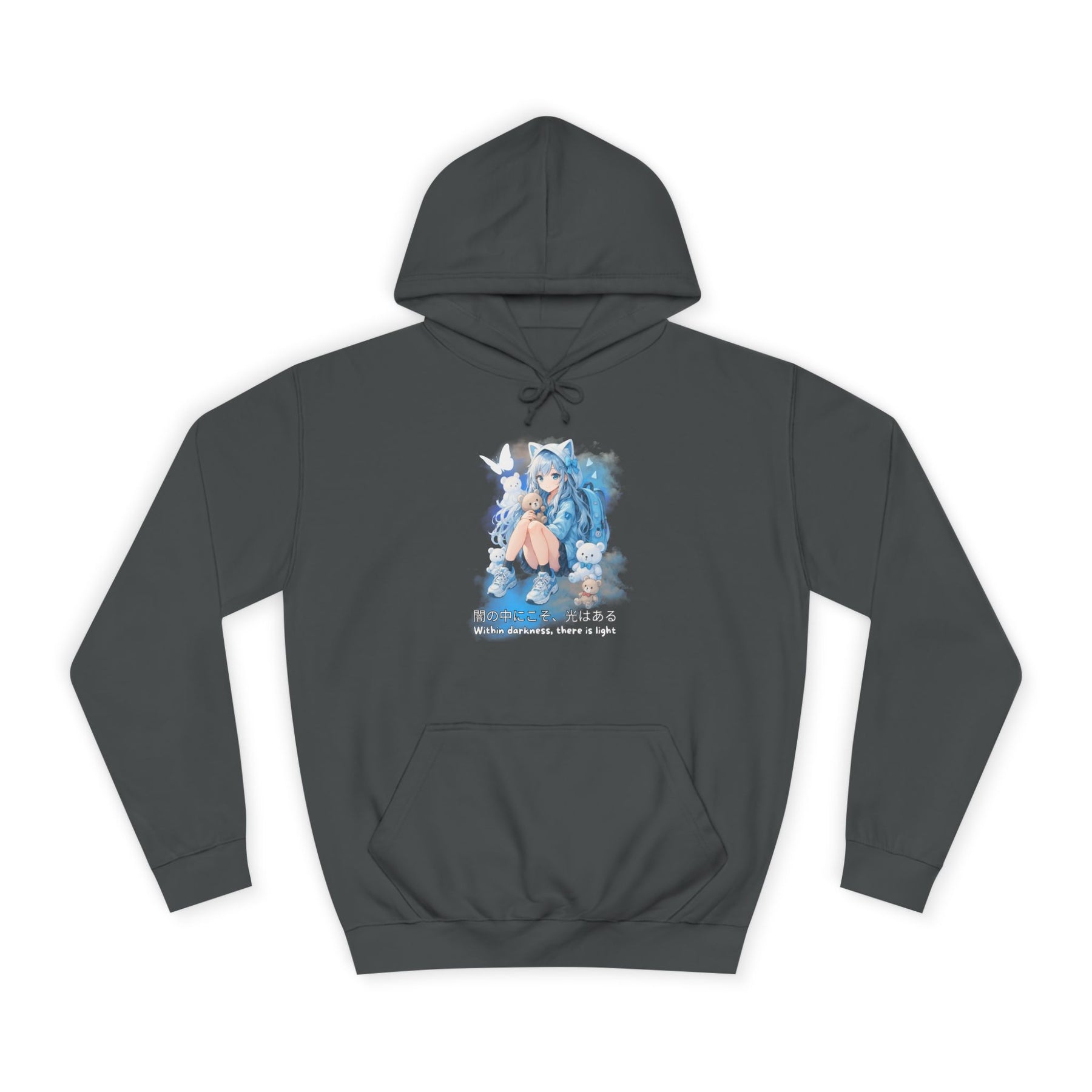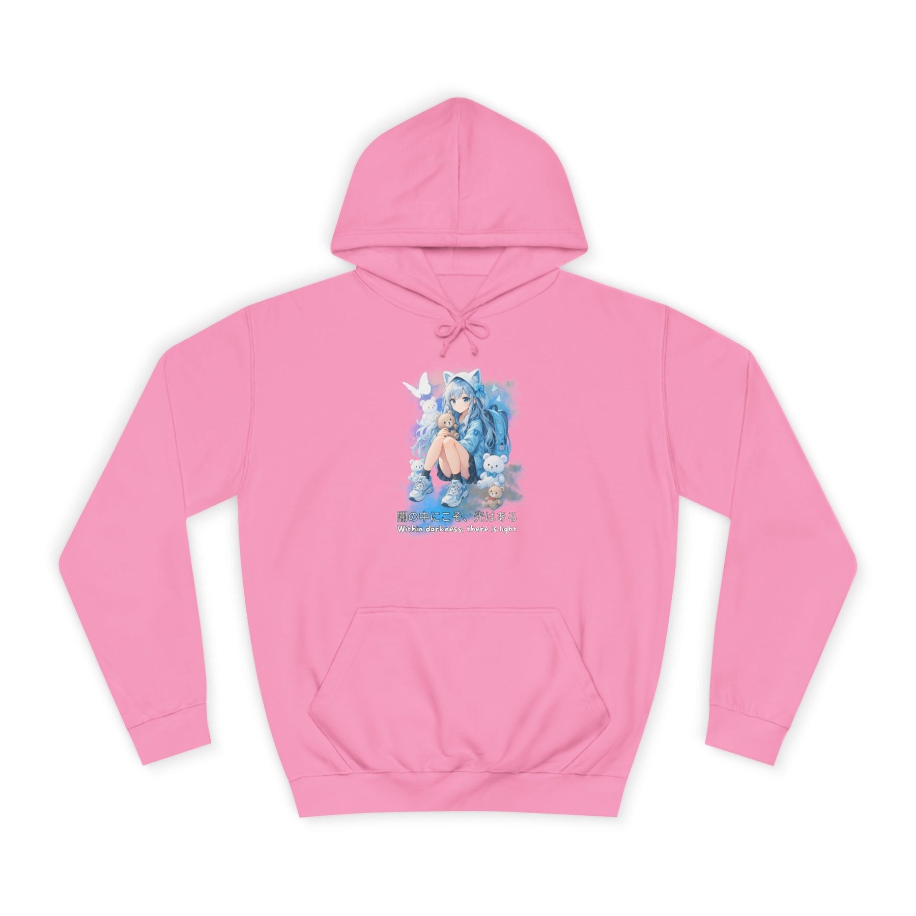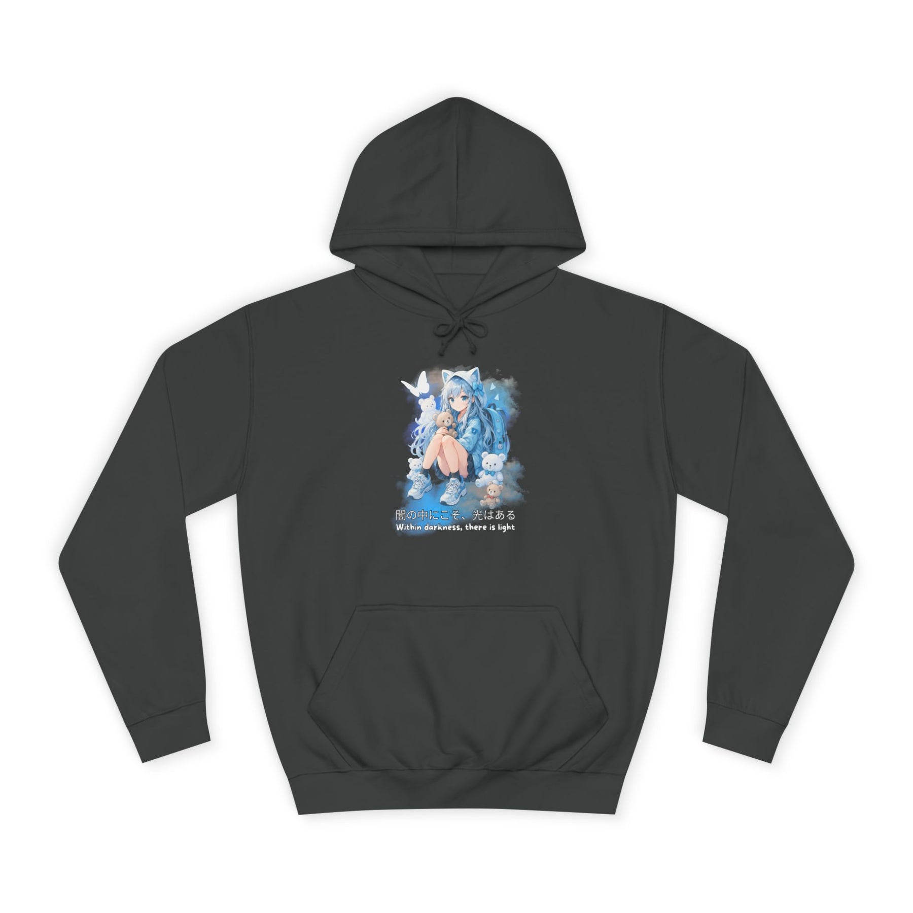 Dieser Hoodie zeigt eine zarte Anime-Figur mit leuchtend blauer Aura, flauschigen Begleitern und einer Message, die Hoffnung schenkt: