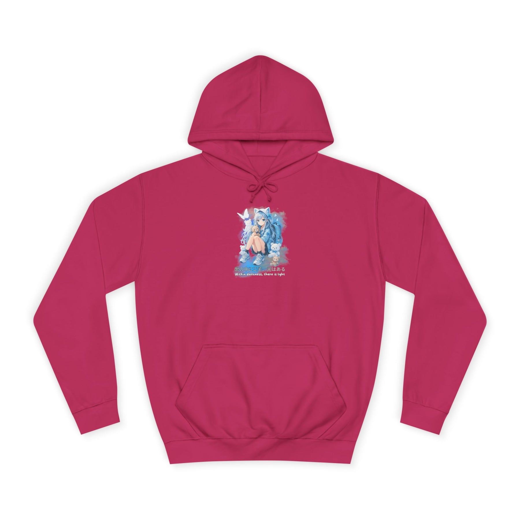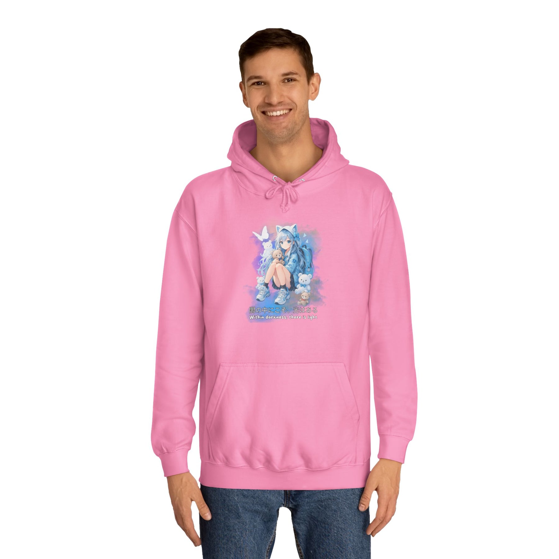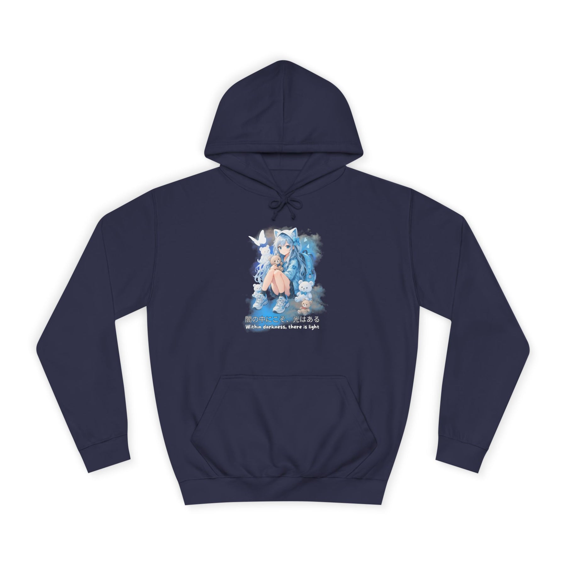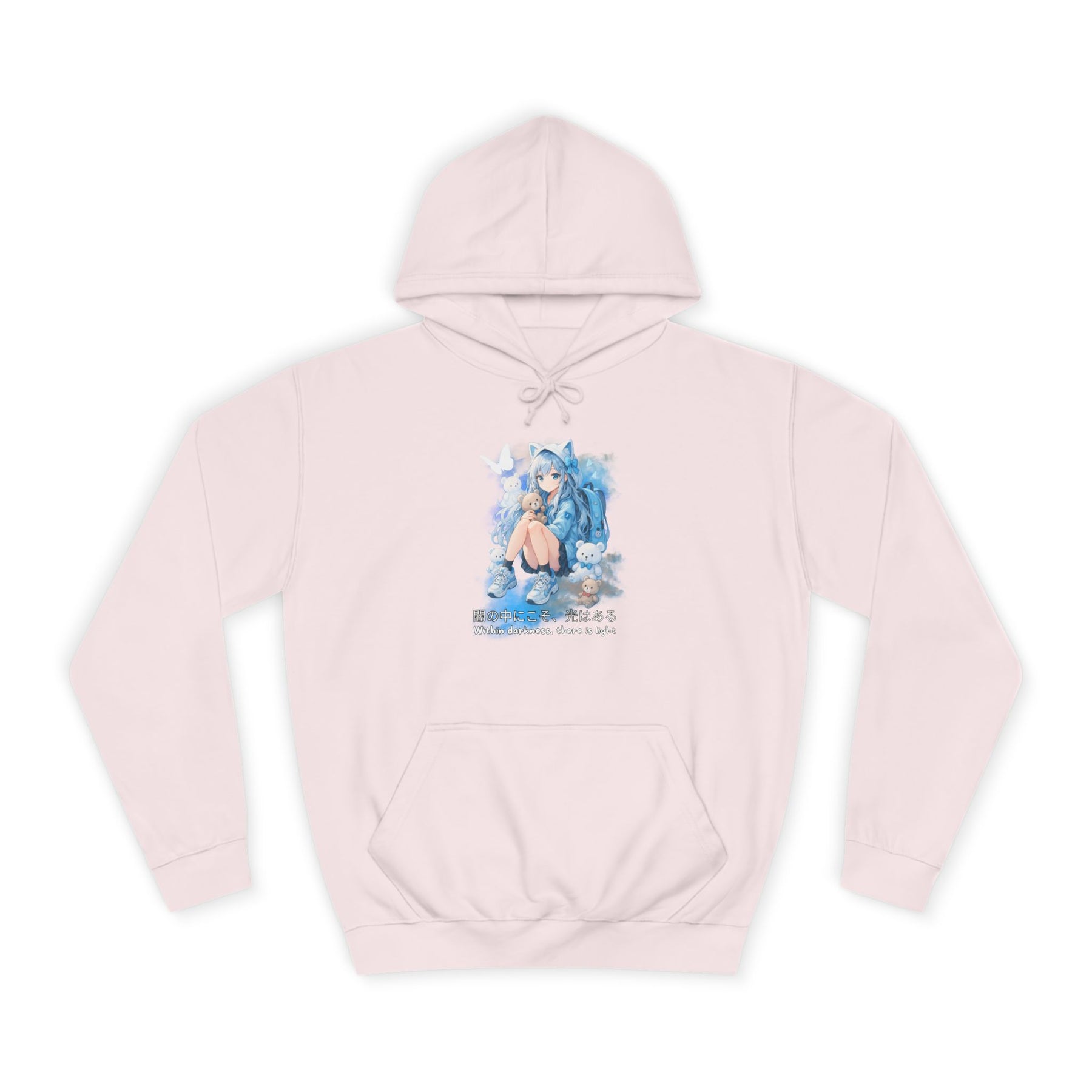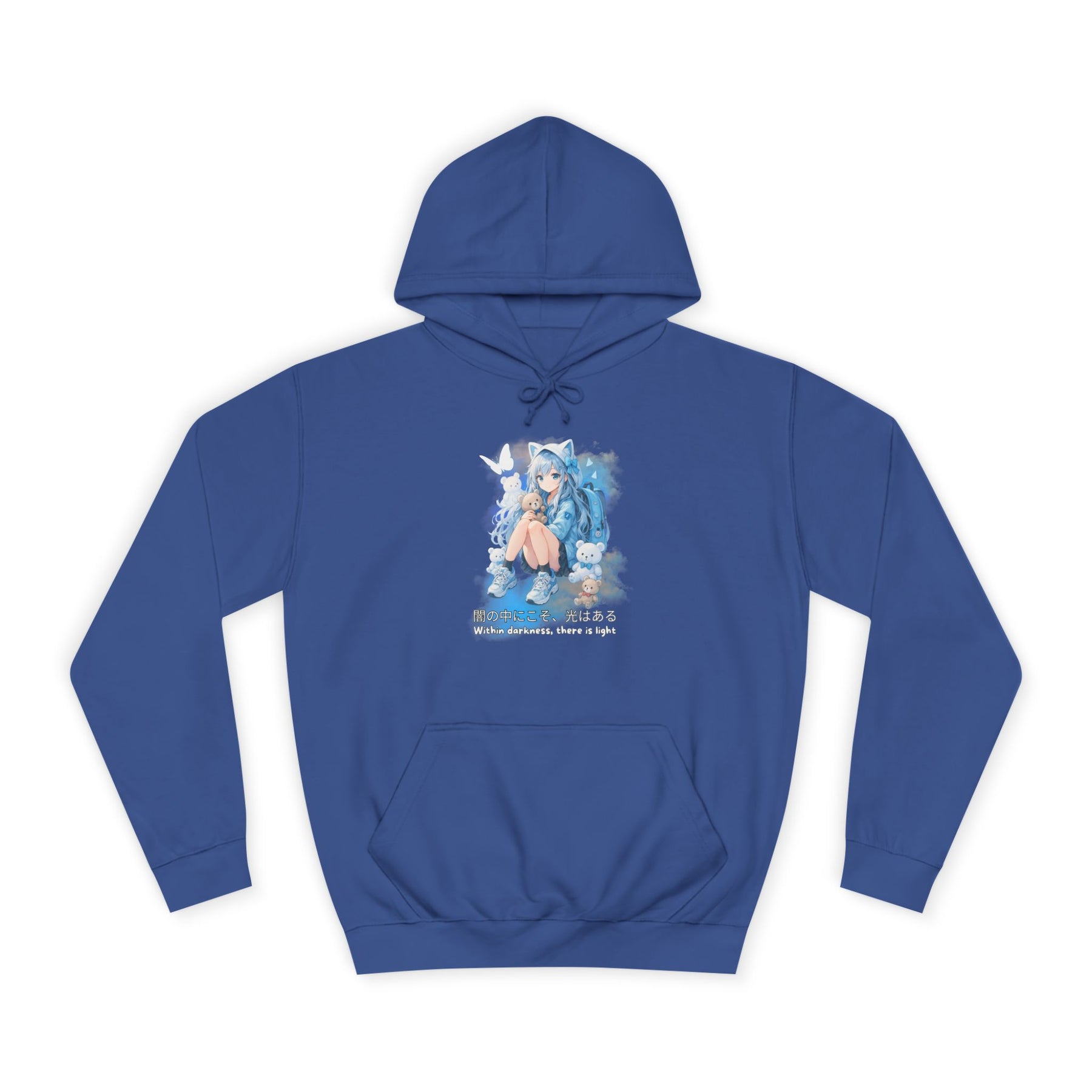Dieser Hoodie zeigt eine zarte Anime-Figur mit leuchtend blauer Aura, flauschigen Begleitern und einer Message, die Hoffnung schenkt: